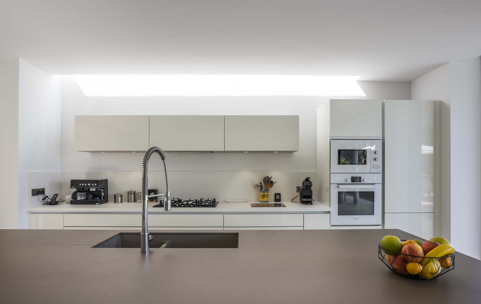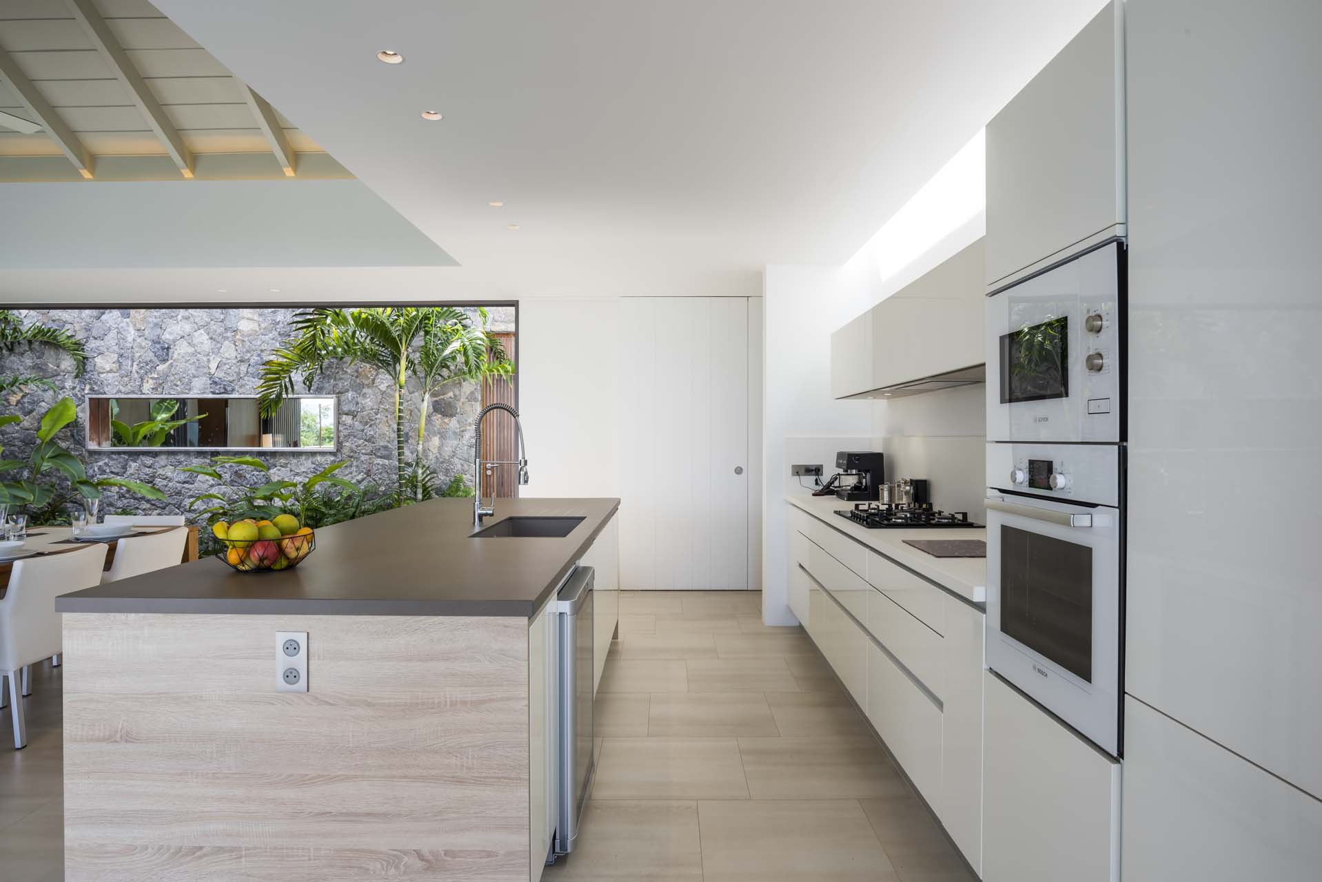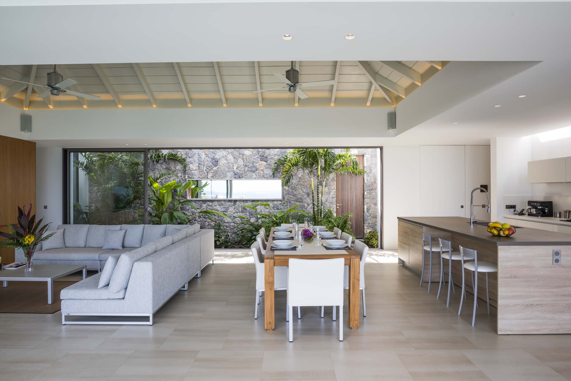 Le large séjour et la cuisine s’ouvrent sur la terrasse et la longue piscine.