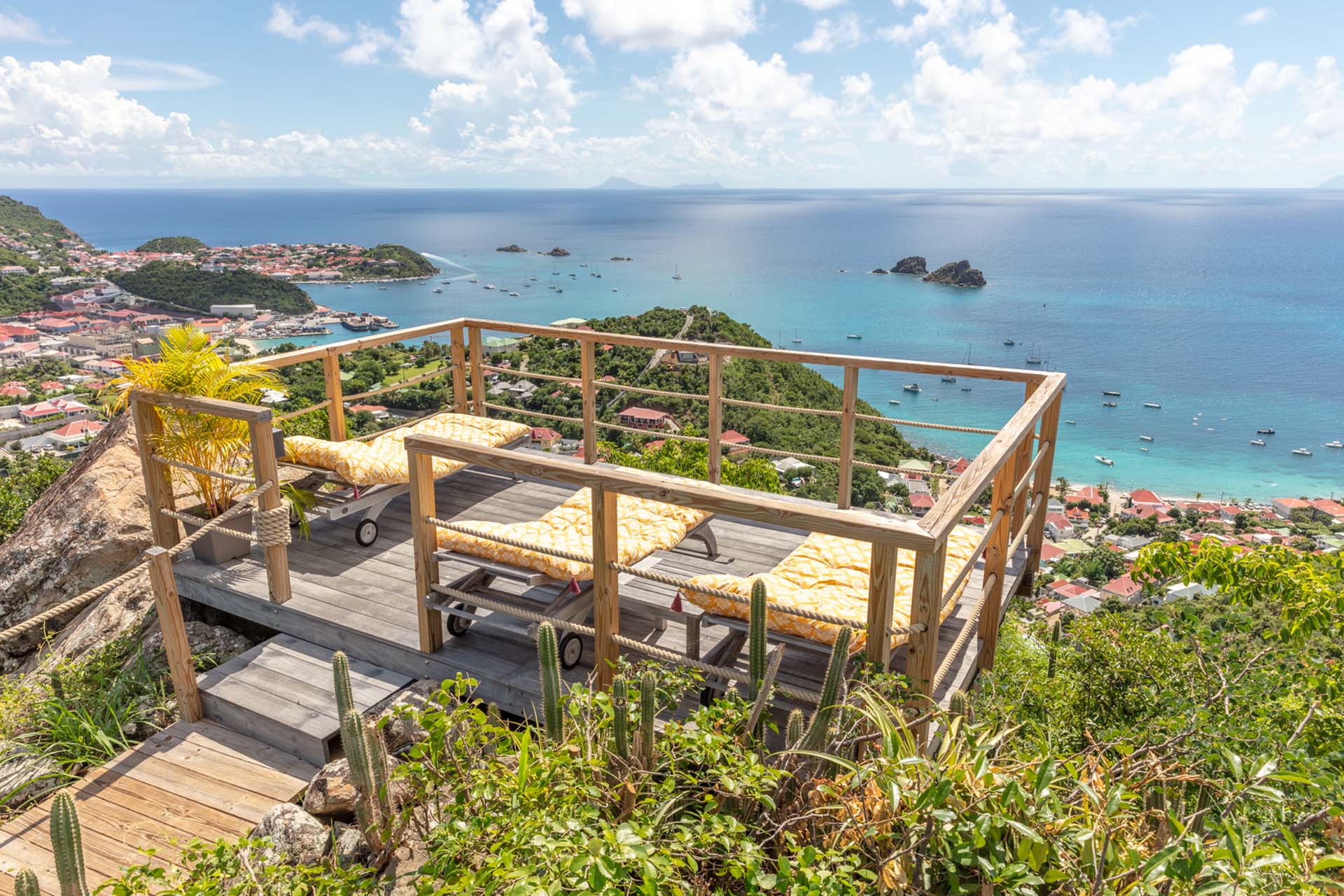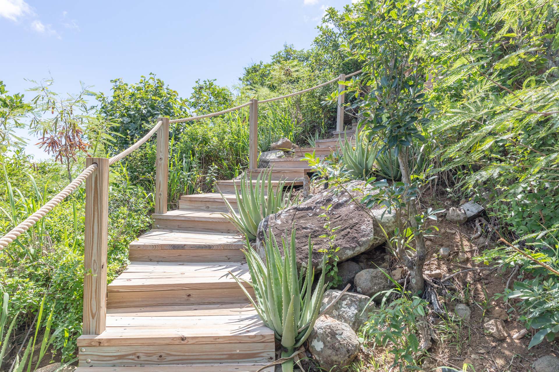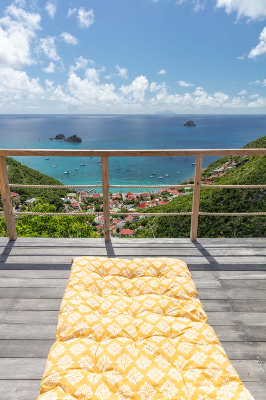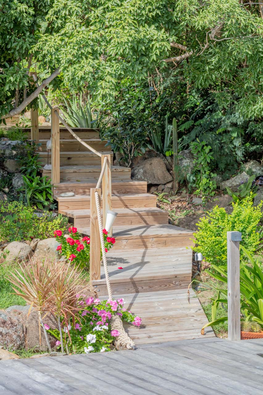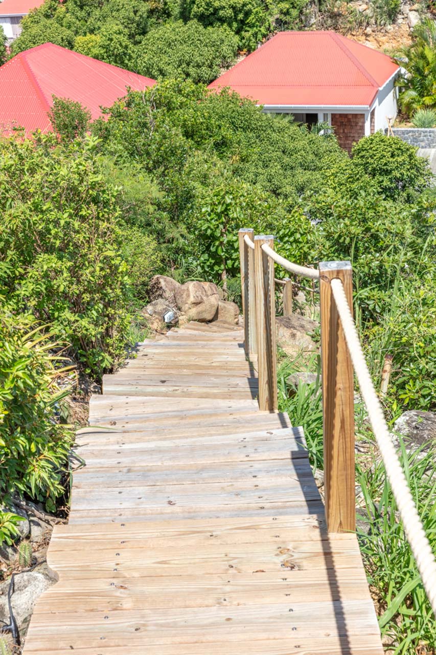 Vous pourrez emprunter un escalier pour vous diriger vers un magnifique point de vue sur la baie de Corossol pour admirer le coucher de soleil en profitant d’un apéritif.