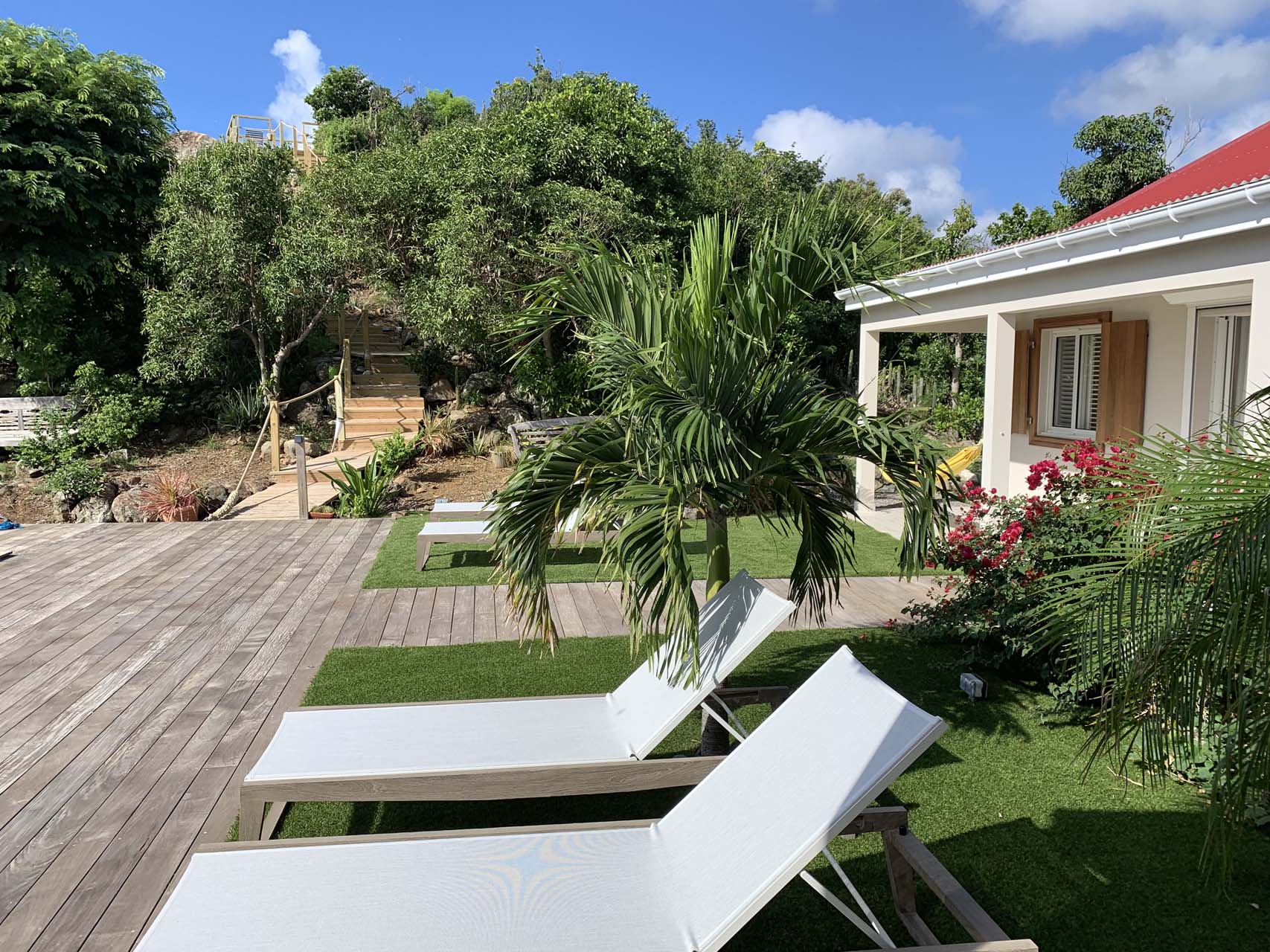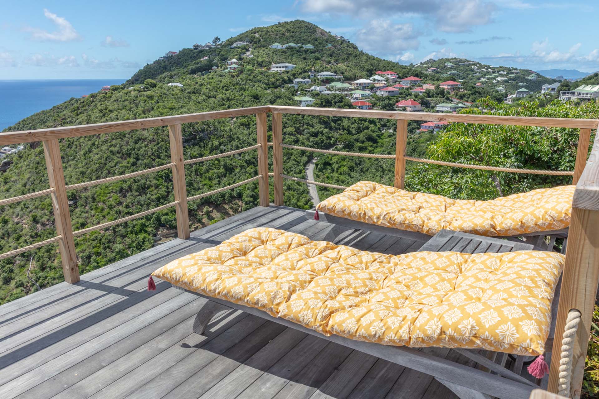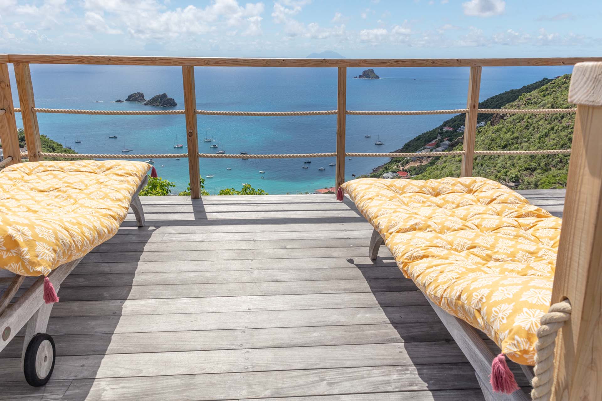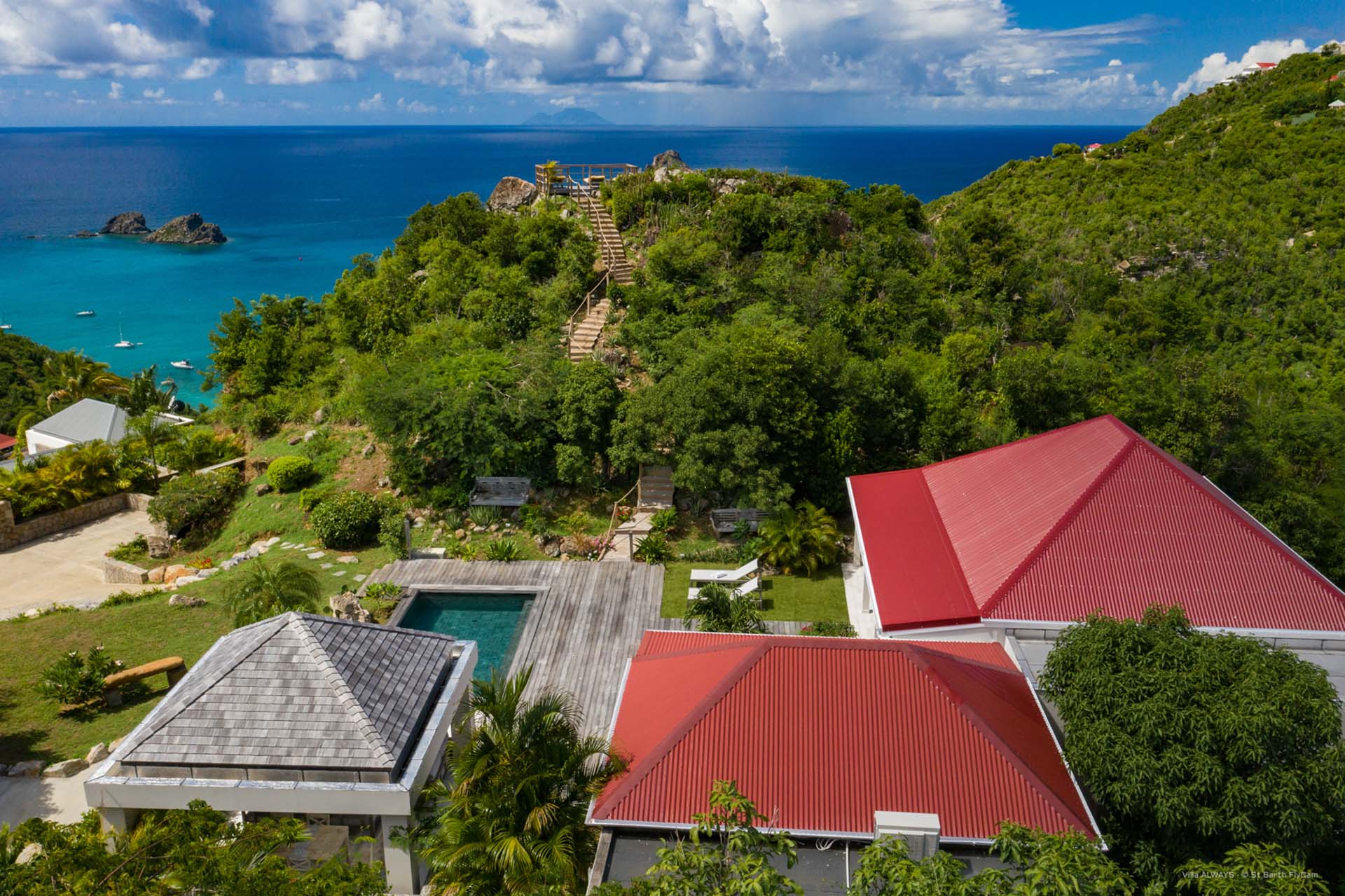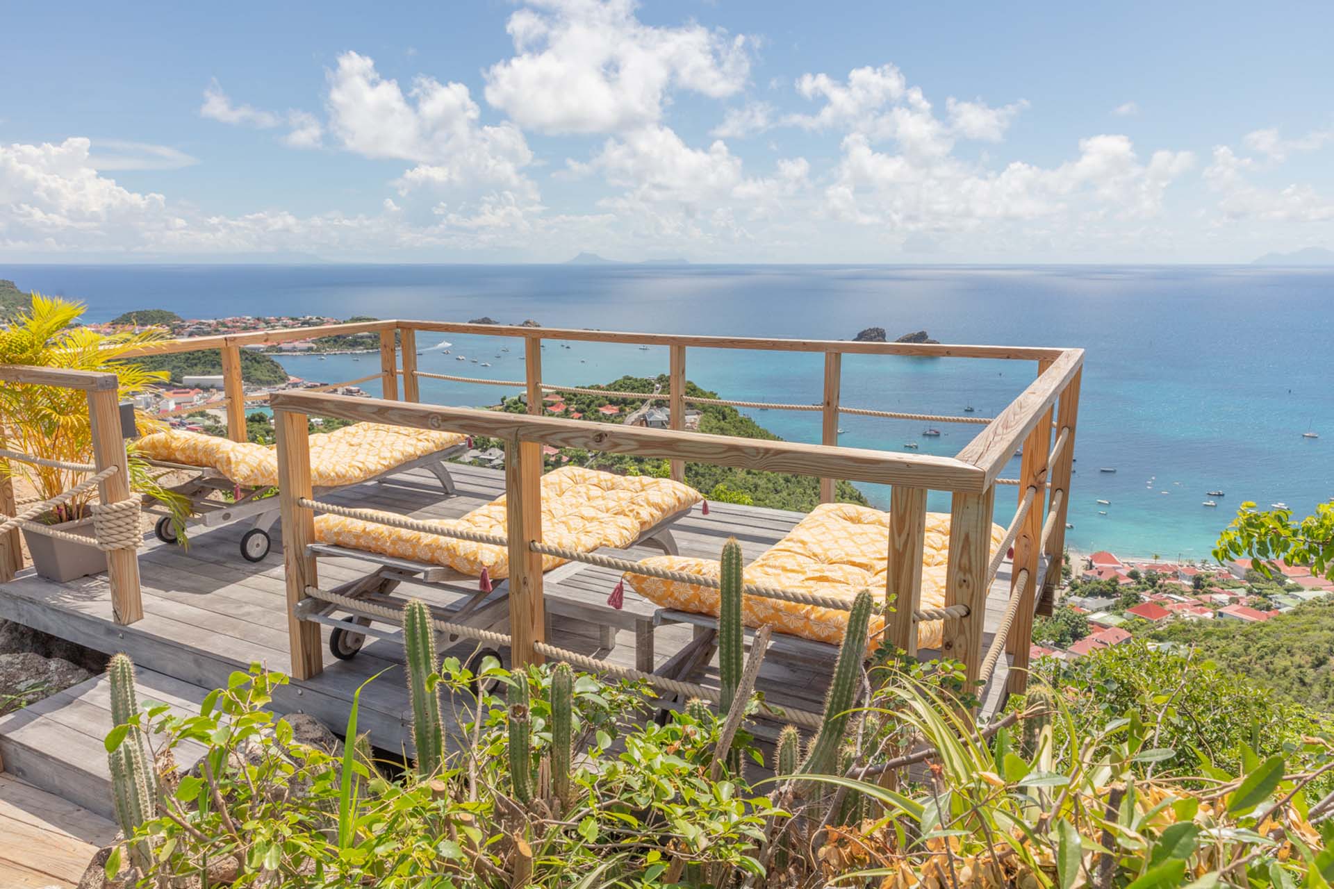 Vous pourrez emprunter un escalier pour vous diriger vers un magnifique point de vue sur la baie de Corossol pour admirer le coucher de soleil en profitant d’un apéritif.