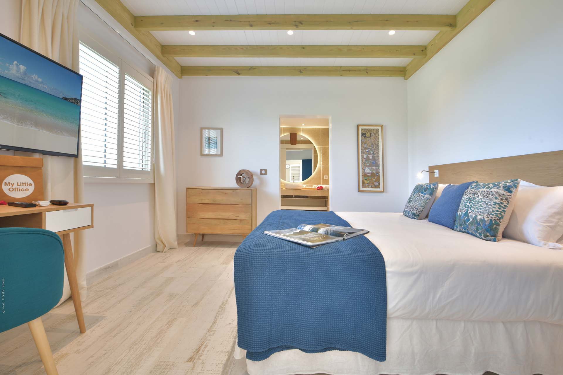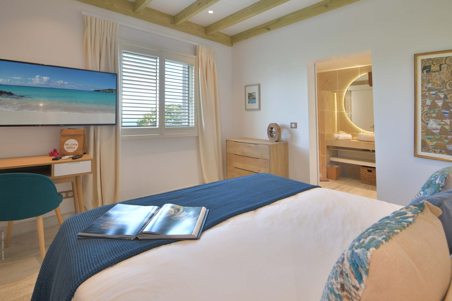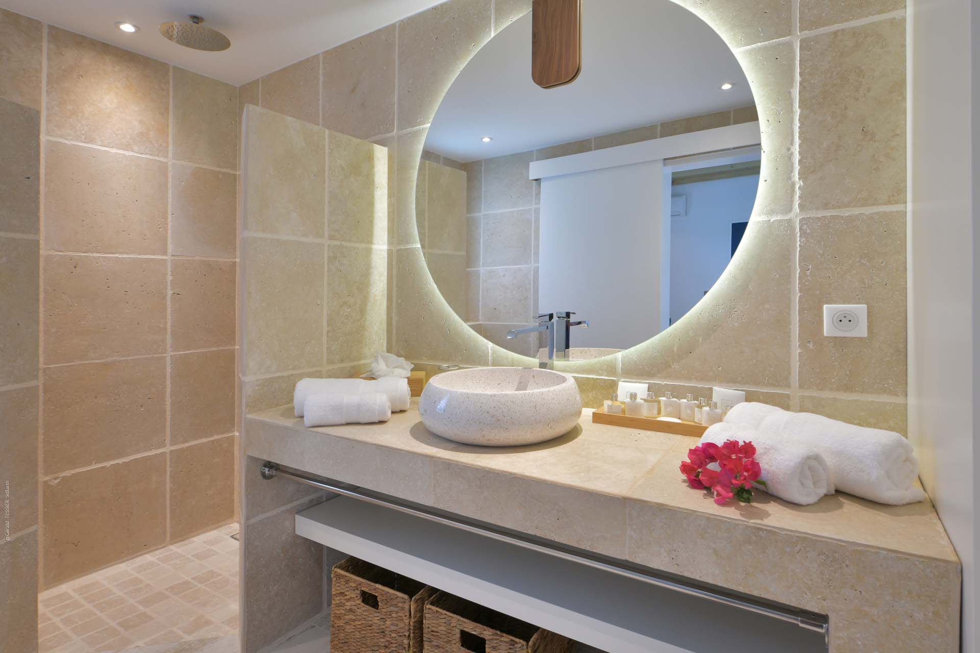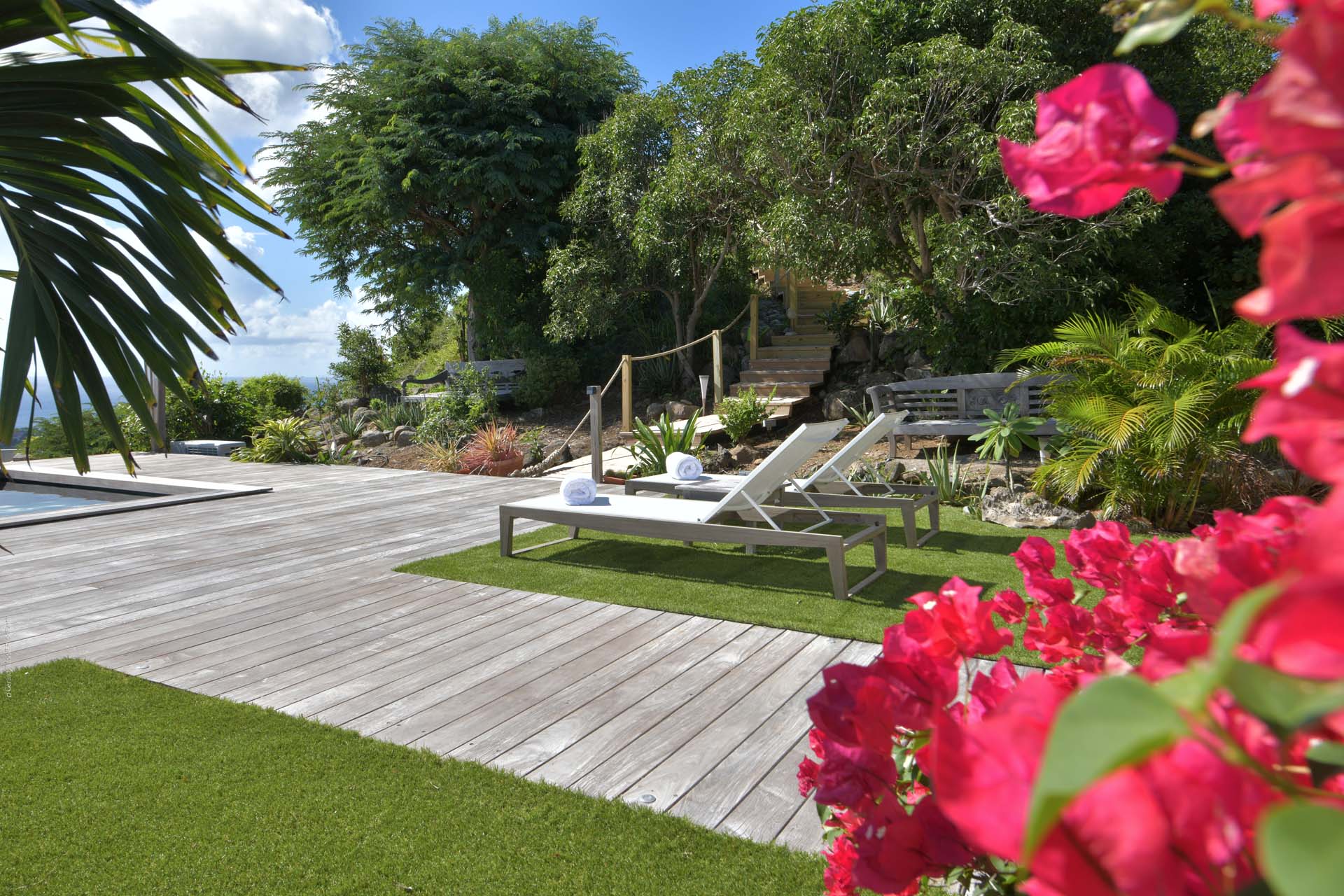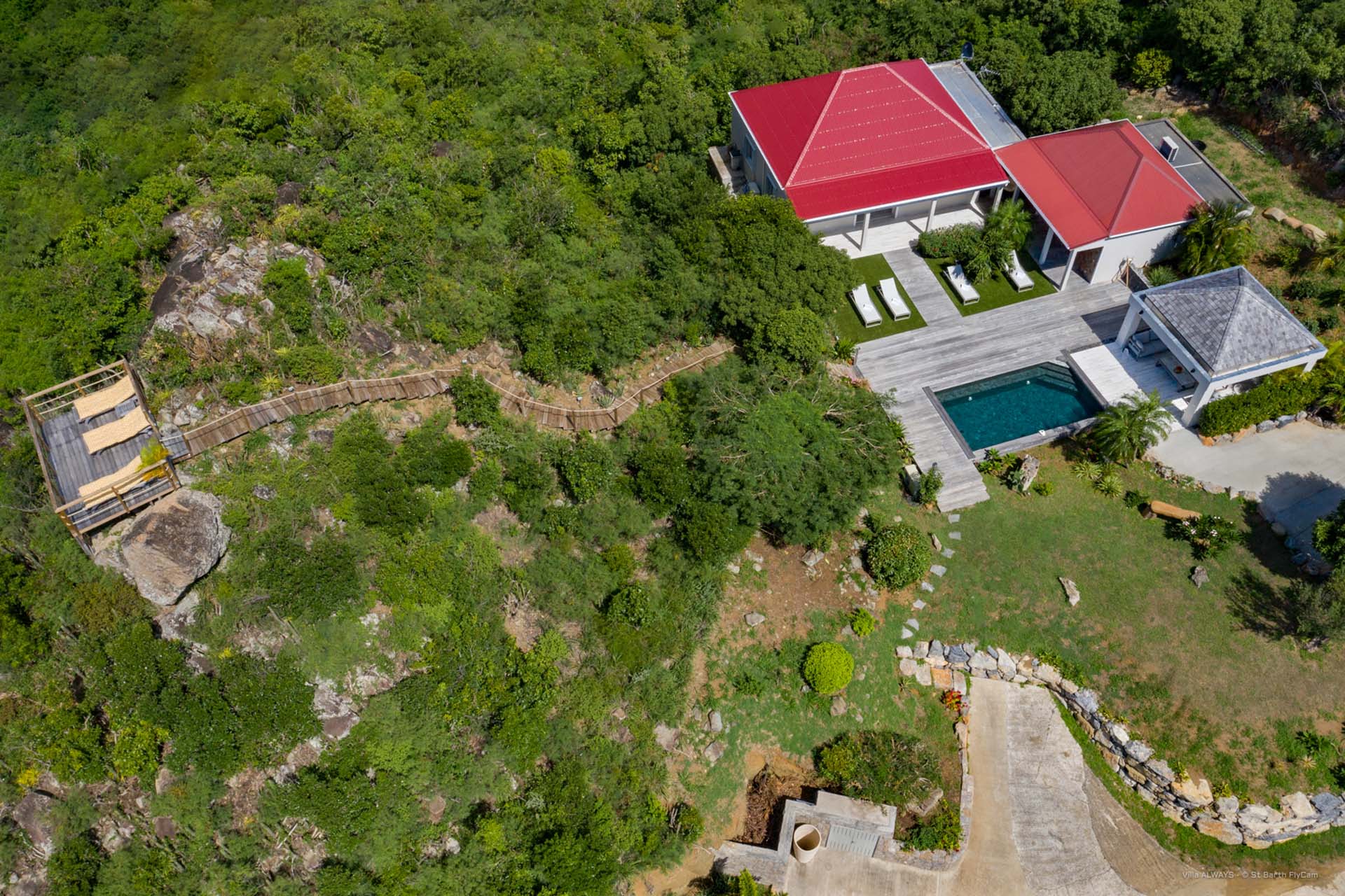 Vous pourrez emprunter un escalier pour vous diriger vers un magnifique point de vue sur la baie de Corossol pour admirer le coucher de soleil en profitant d’un apéritif.