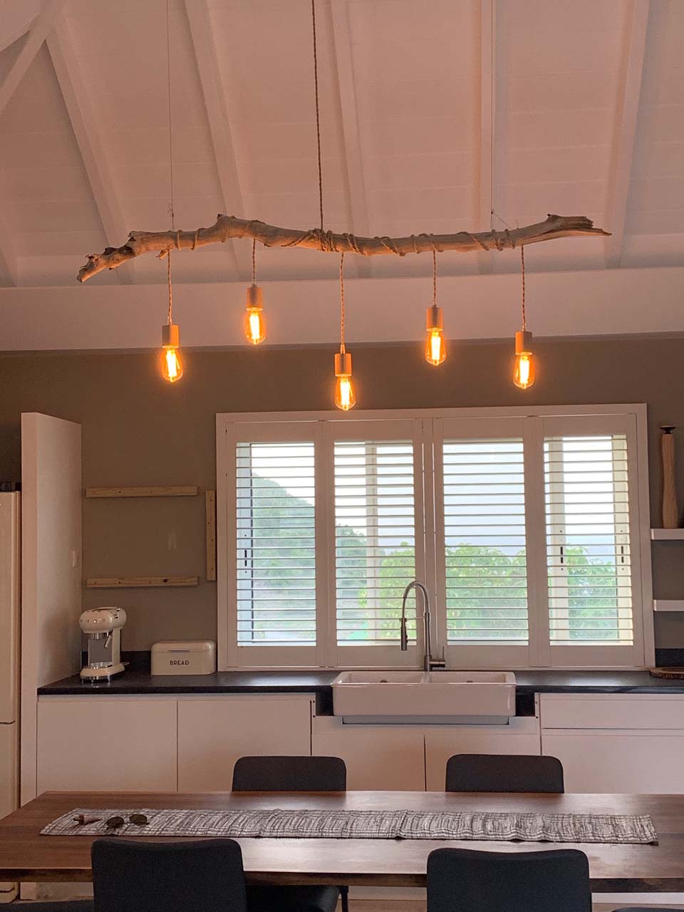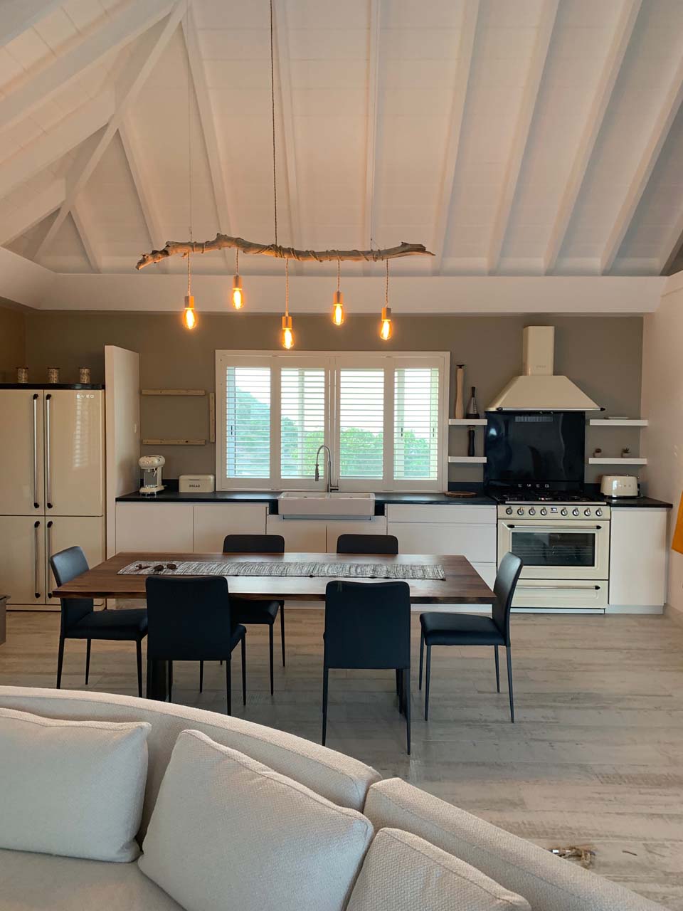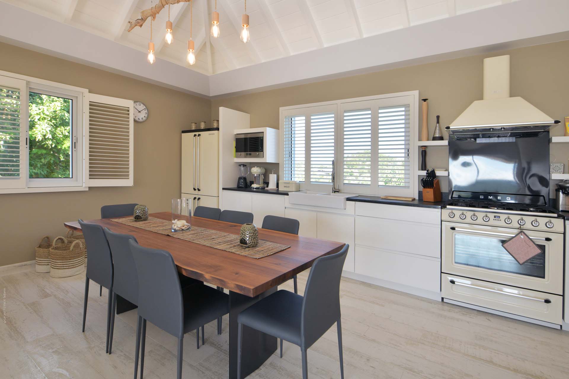 La cuisine est ouverte sur le séjour, donnant vu sur la terrasse.