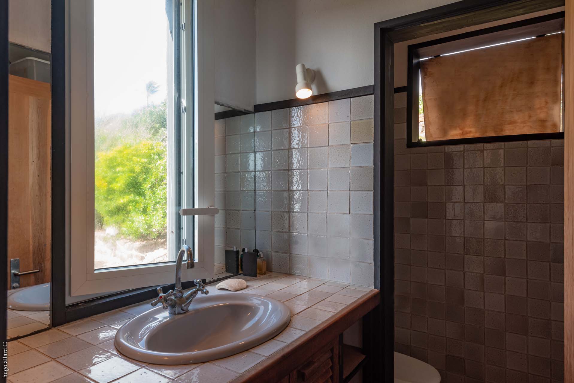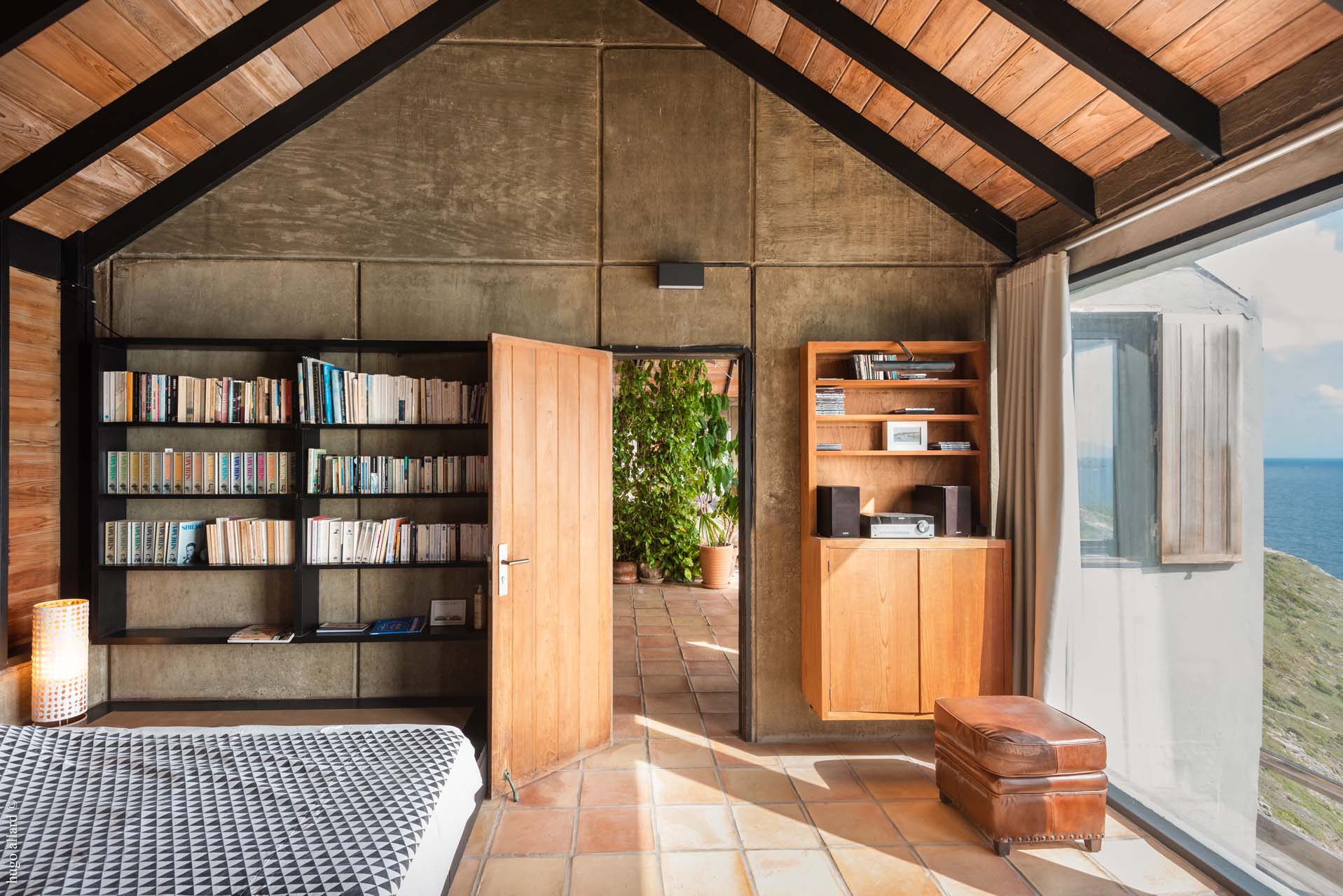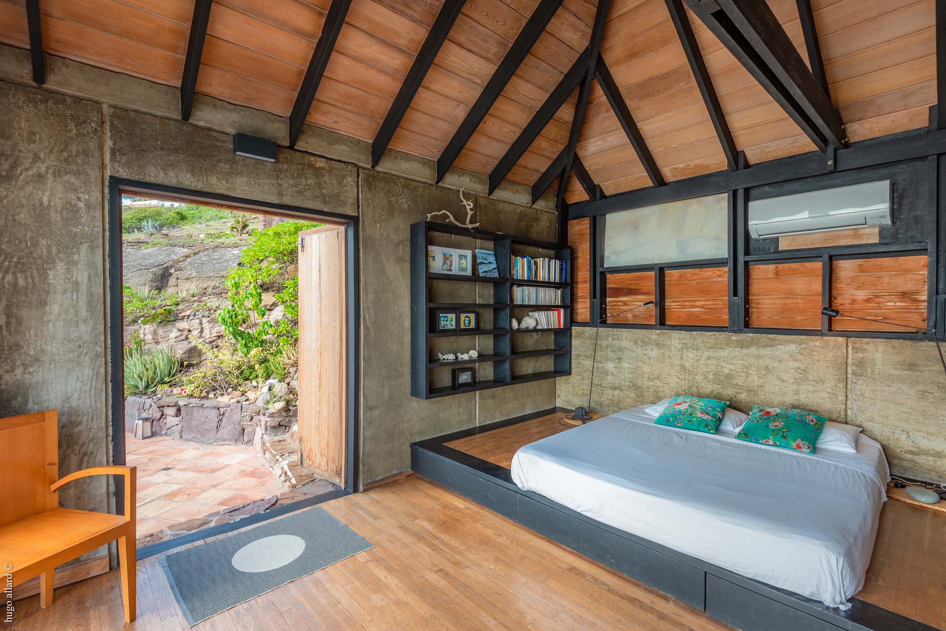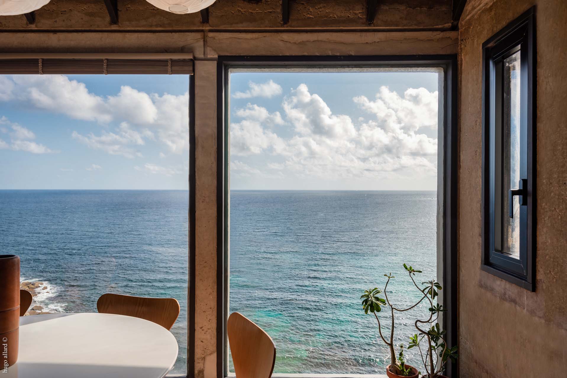 Le salon épouse la forme de la roche. Il s’ouvre sur la terrasse et sur la piscine qui font face à la mer. Une première chambre est rattachée au bâtiment principal. La deuxième est un bungalow séparé et accessible par la terrasse. Toutes 2 ont une vue exceptionnelle et ont leur propre salle de bain.