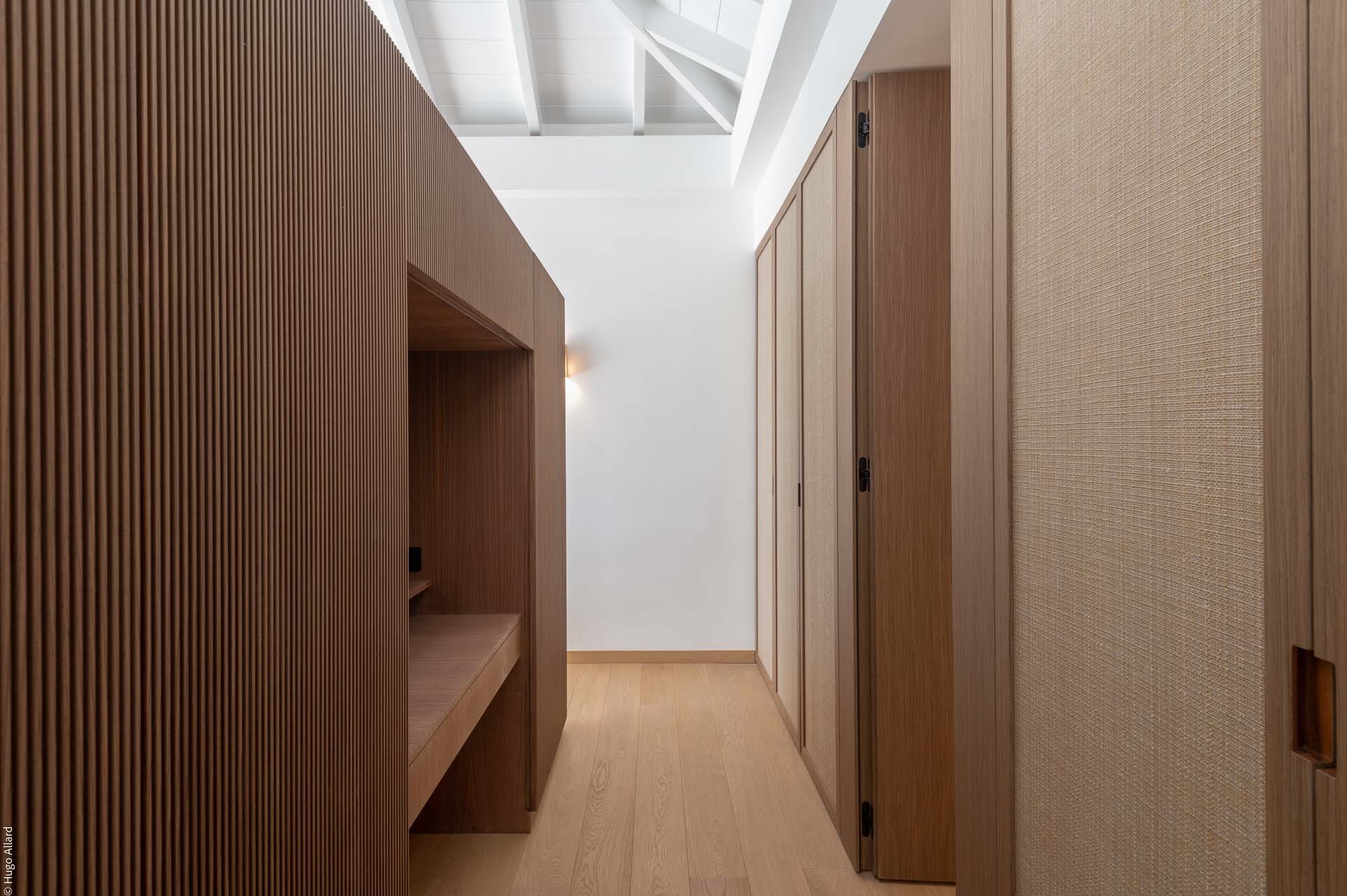 Les quatre chambres généreuses de la villa sont réparties sur deux niveaux. Deux suites se trouvent au rez-de-chaussée, avec un accès direct depuis le salon et la terrasse. Chacune dispose de sa propre salle de bains privative, dont l’une avec une baignoire extérieure luxueuse, idéale pour des instants de détente absolue. Les deux autres chambres sont situées au niveau inférieur, accessibles par un escalier intérieur ou directement depuis le parking, offrant ainsi plus d’intimité.