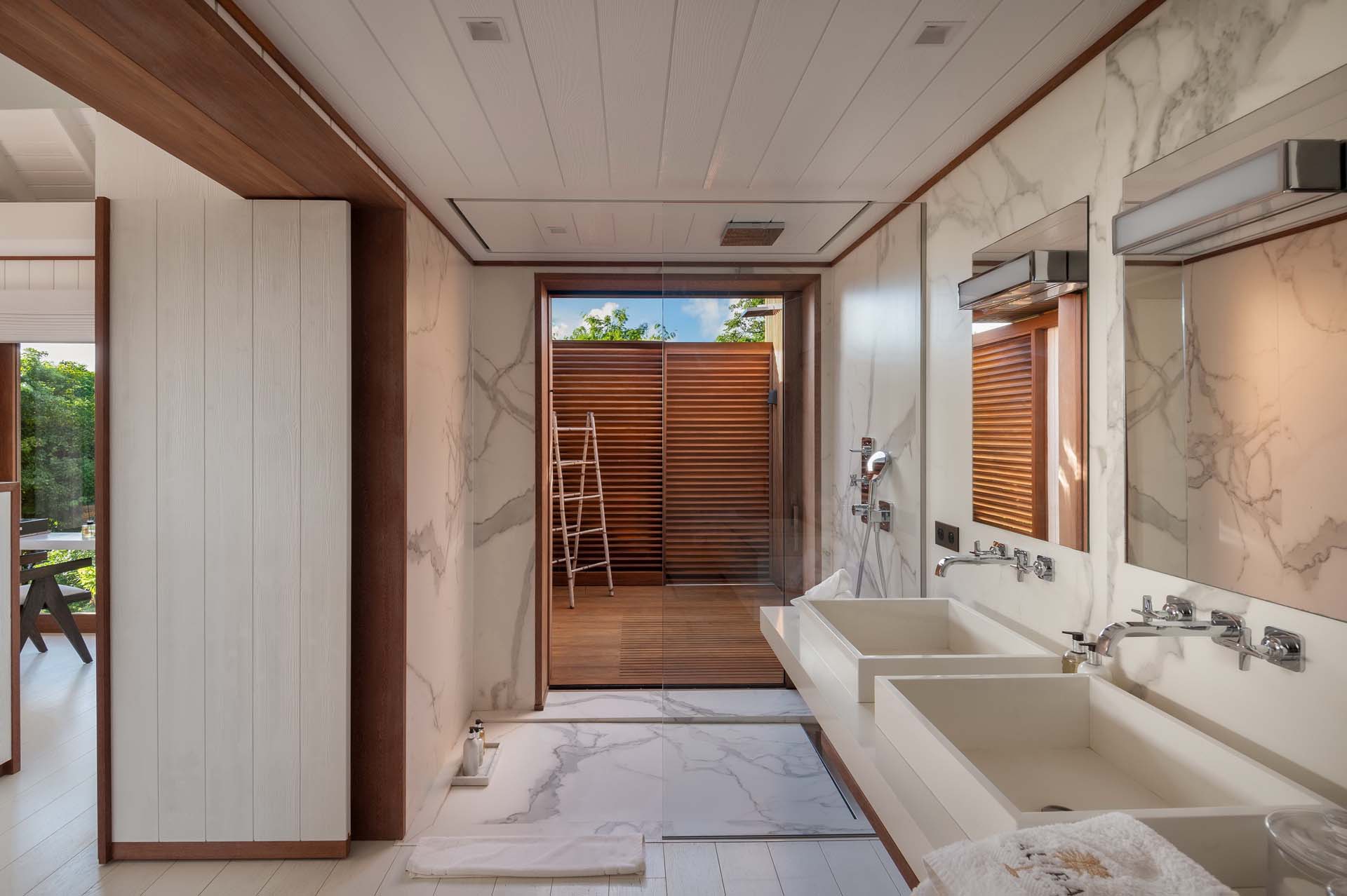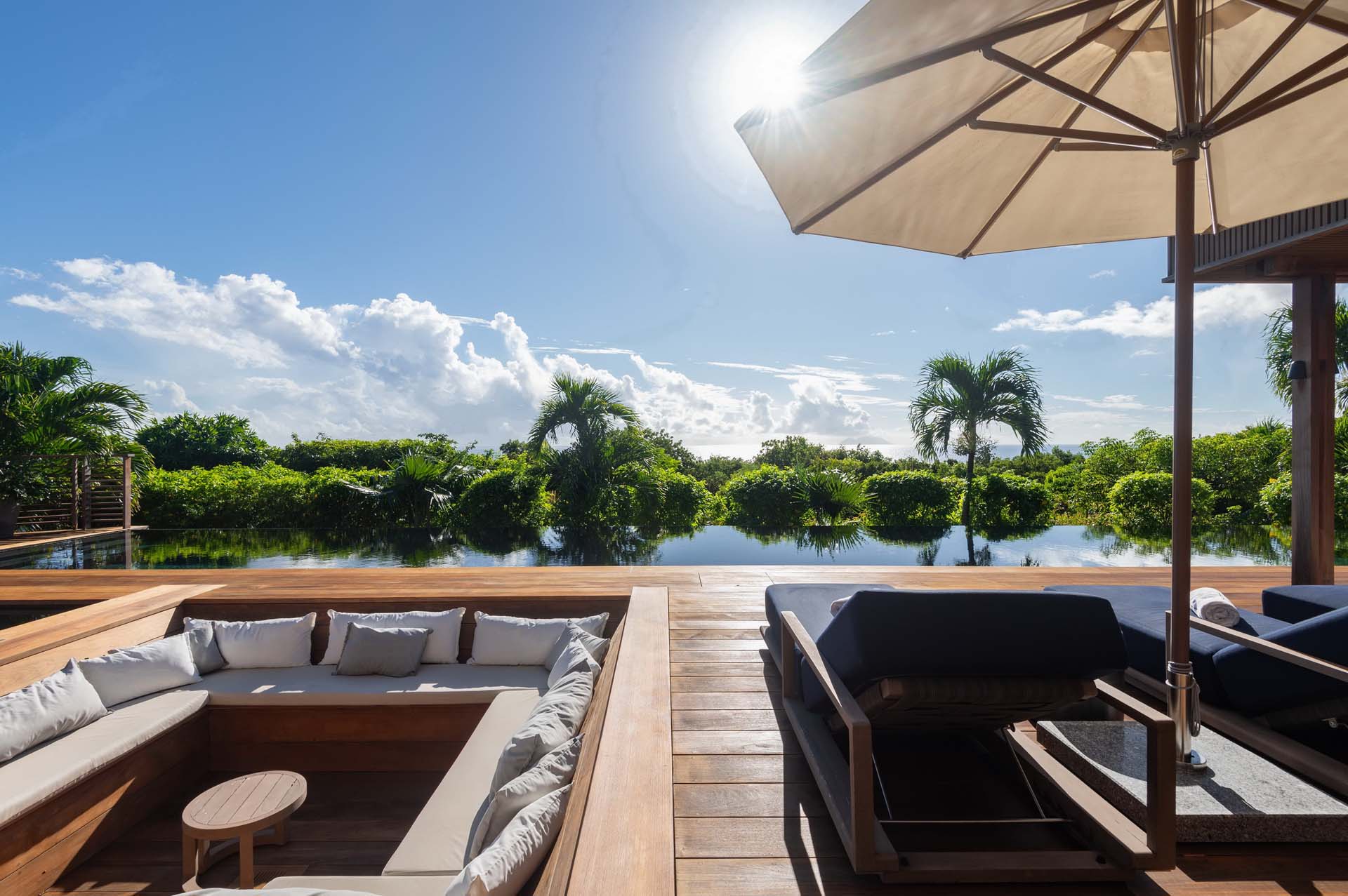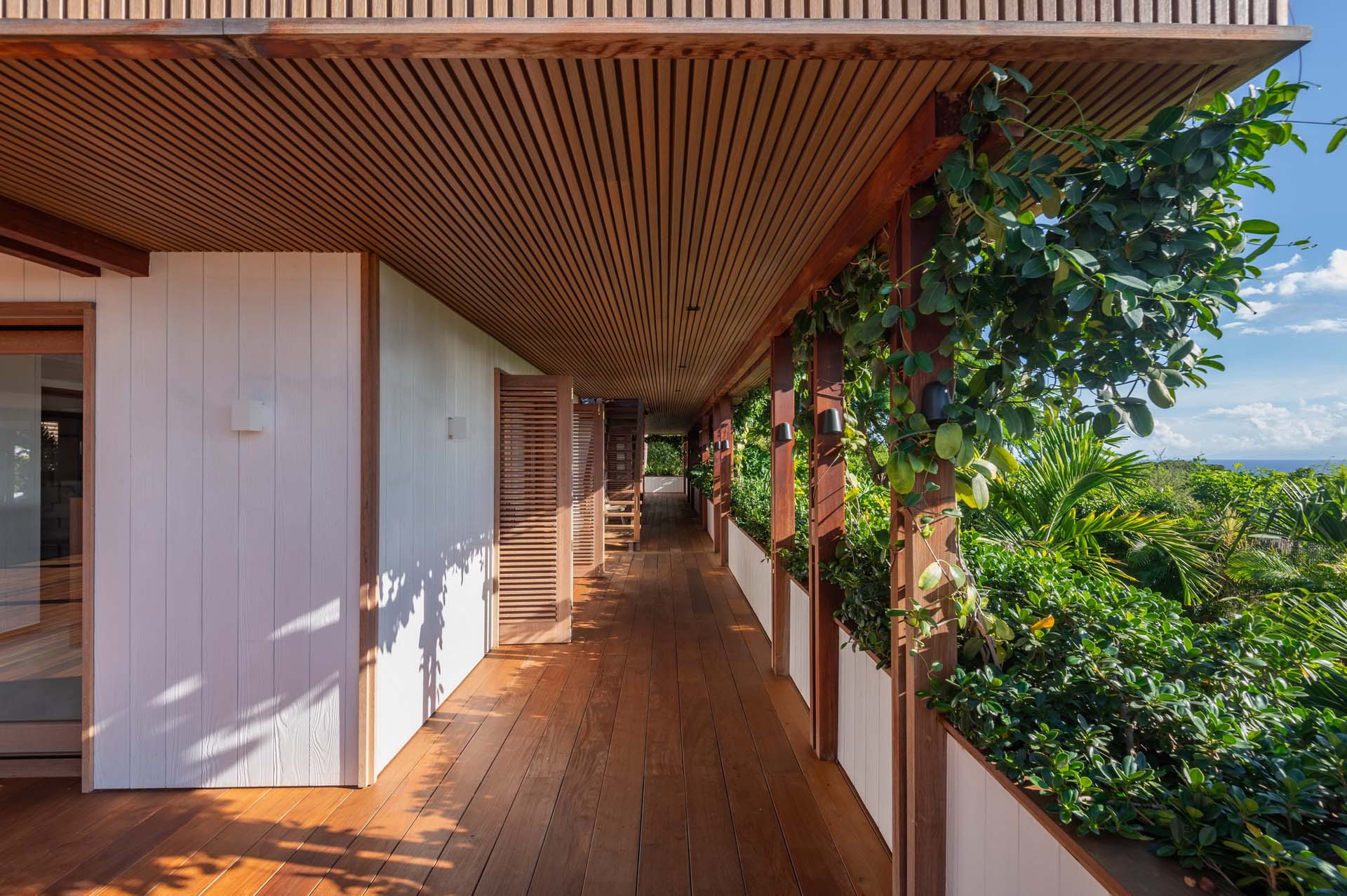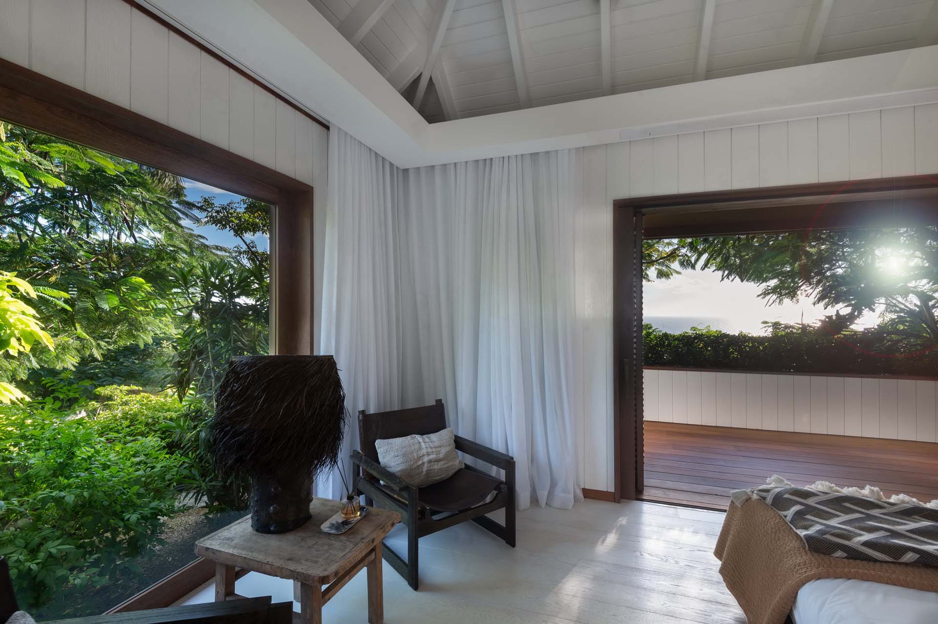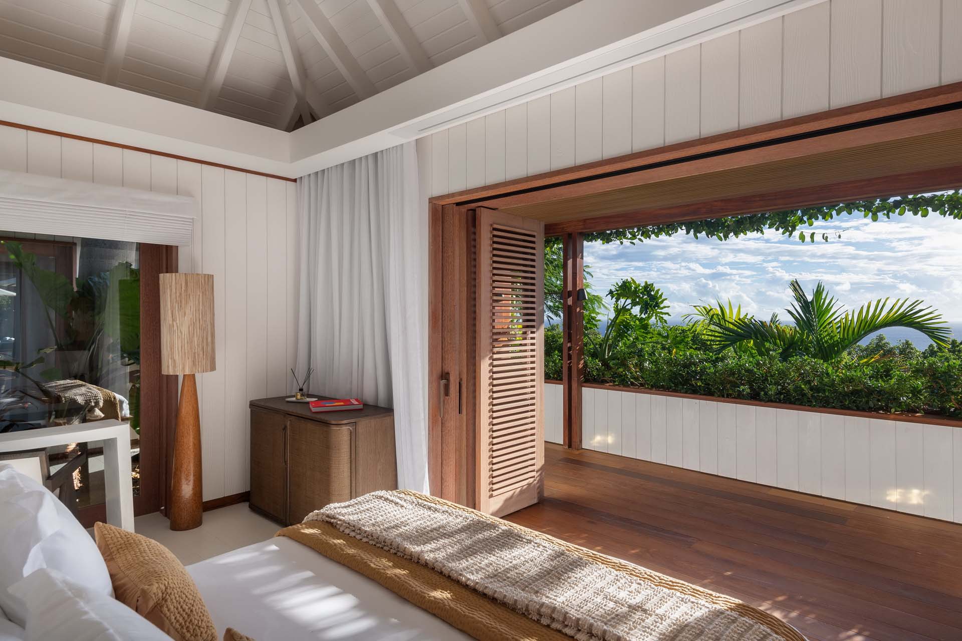 Dans toute la villa, de grandes fenêtres et des portes vitrées laissent entrer la lumière naturelle, créant une atmosphère lumineuse et aérée. Ces fenêtres offrent également une vue panoramique sur l’océan et la nature environnante, fusionnant harmonieusement les espaces intérieurs et extérieurs.