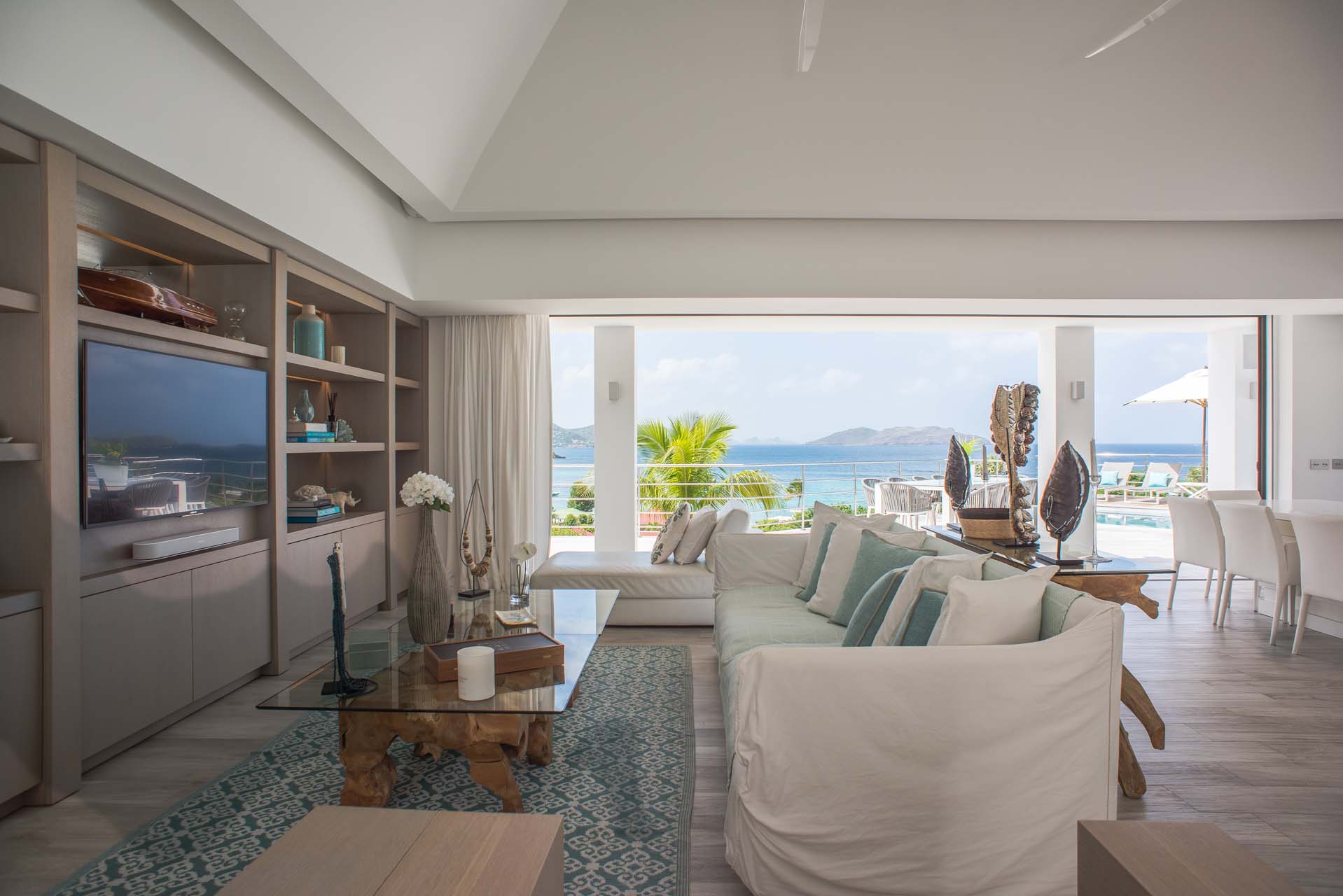 Cette spacieuse villa toute blanche domine l’océan en contrebas.