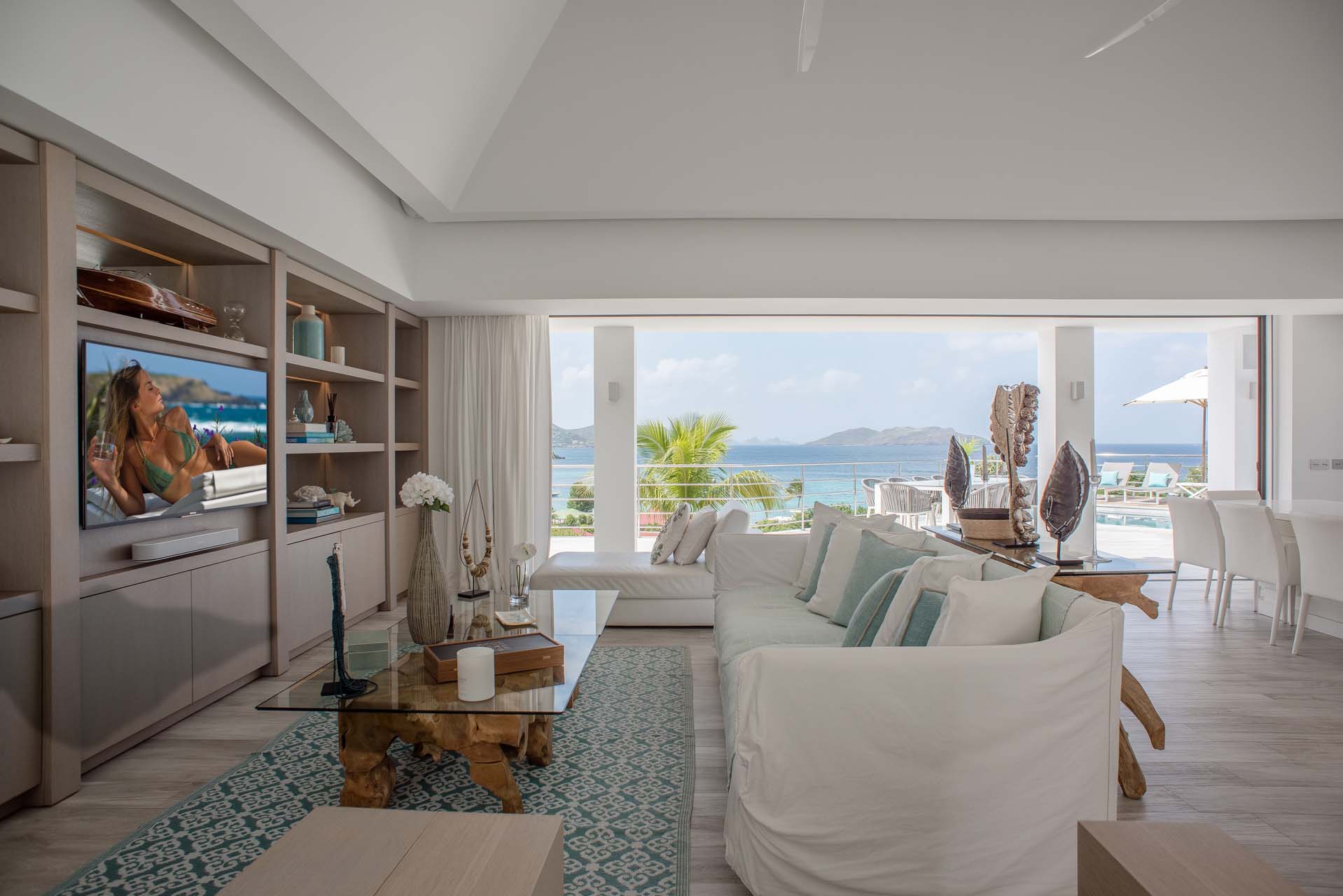 Cette spacieuse villa toute blanche domine l’océan en contrebas.