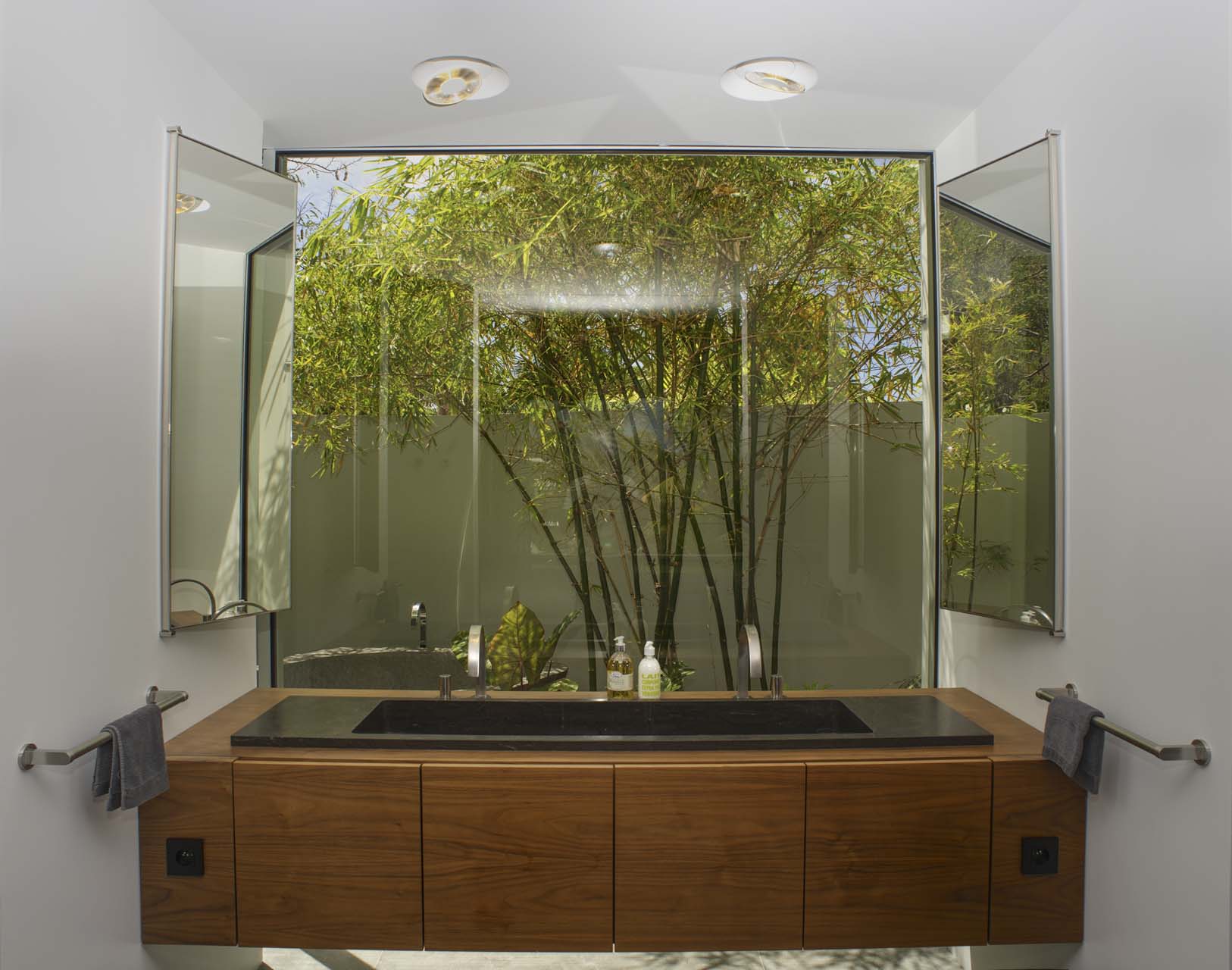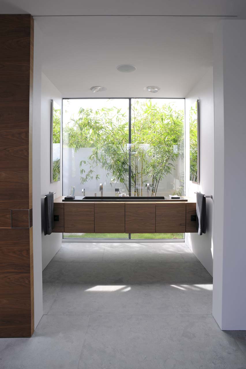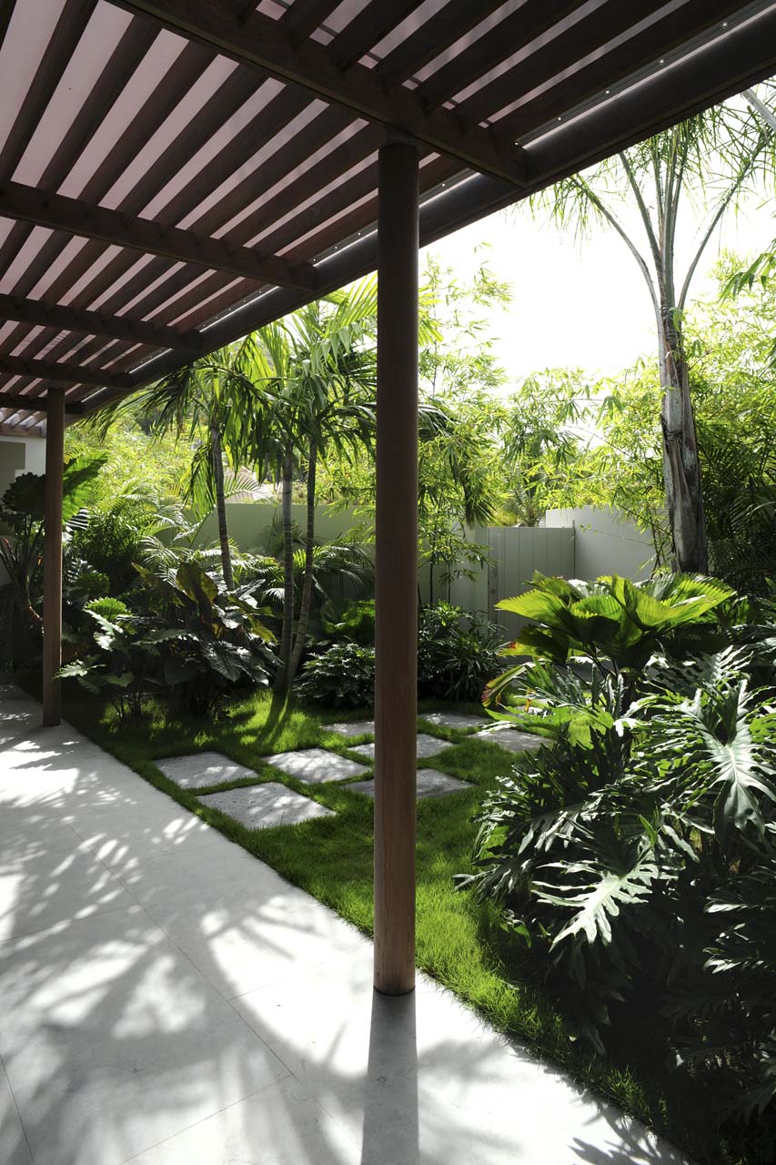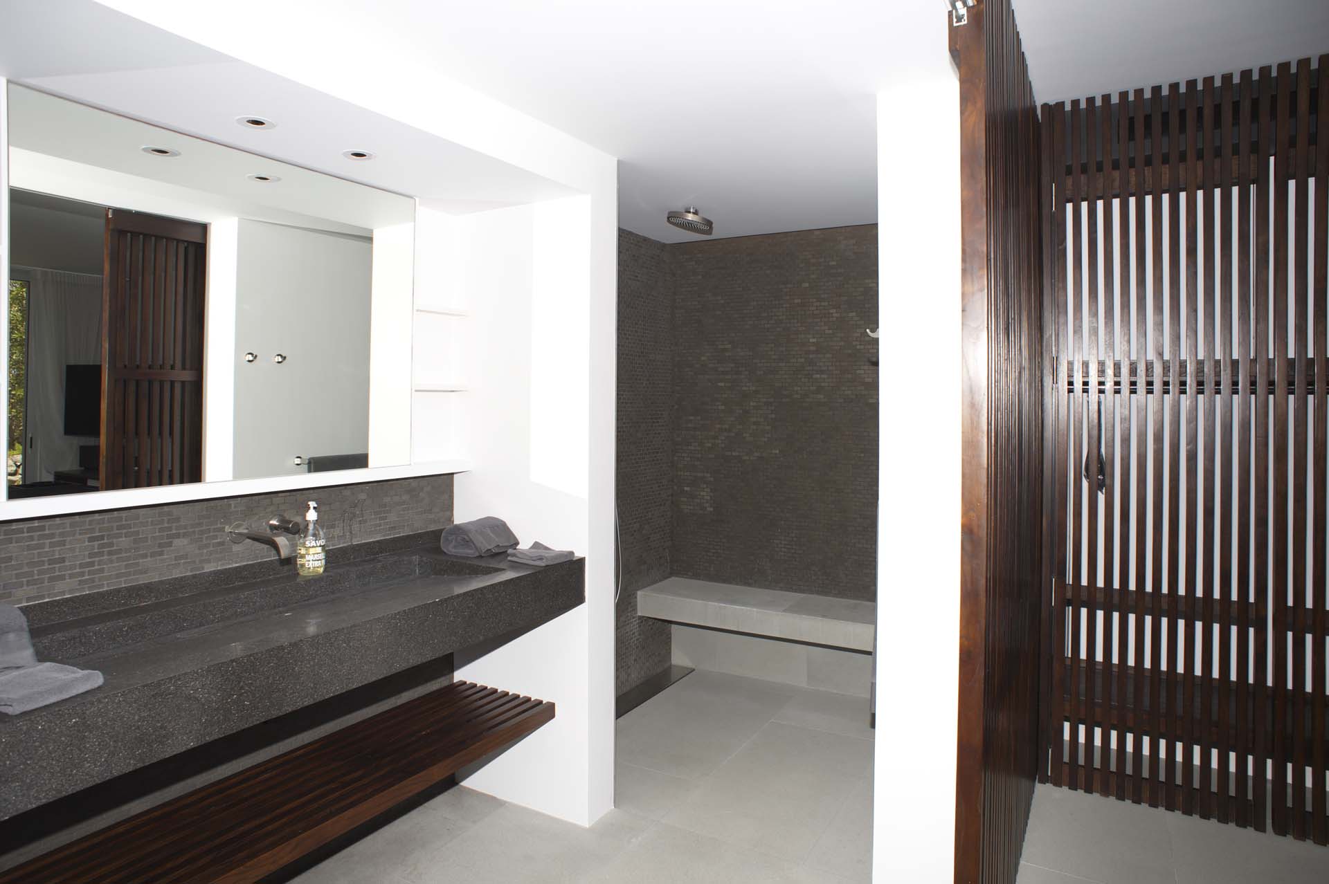 La chambre principale est connectée au salon, celle-ci qui s’ouvre sur la terrasse et sur un jardin privé avec une baignoire qui s’ajoute à la salle de bain intérieure existante.