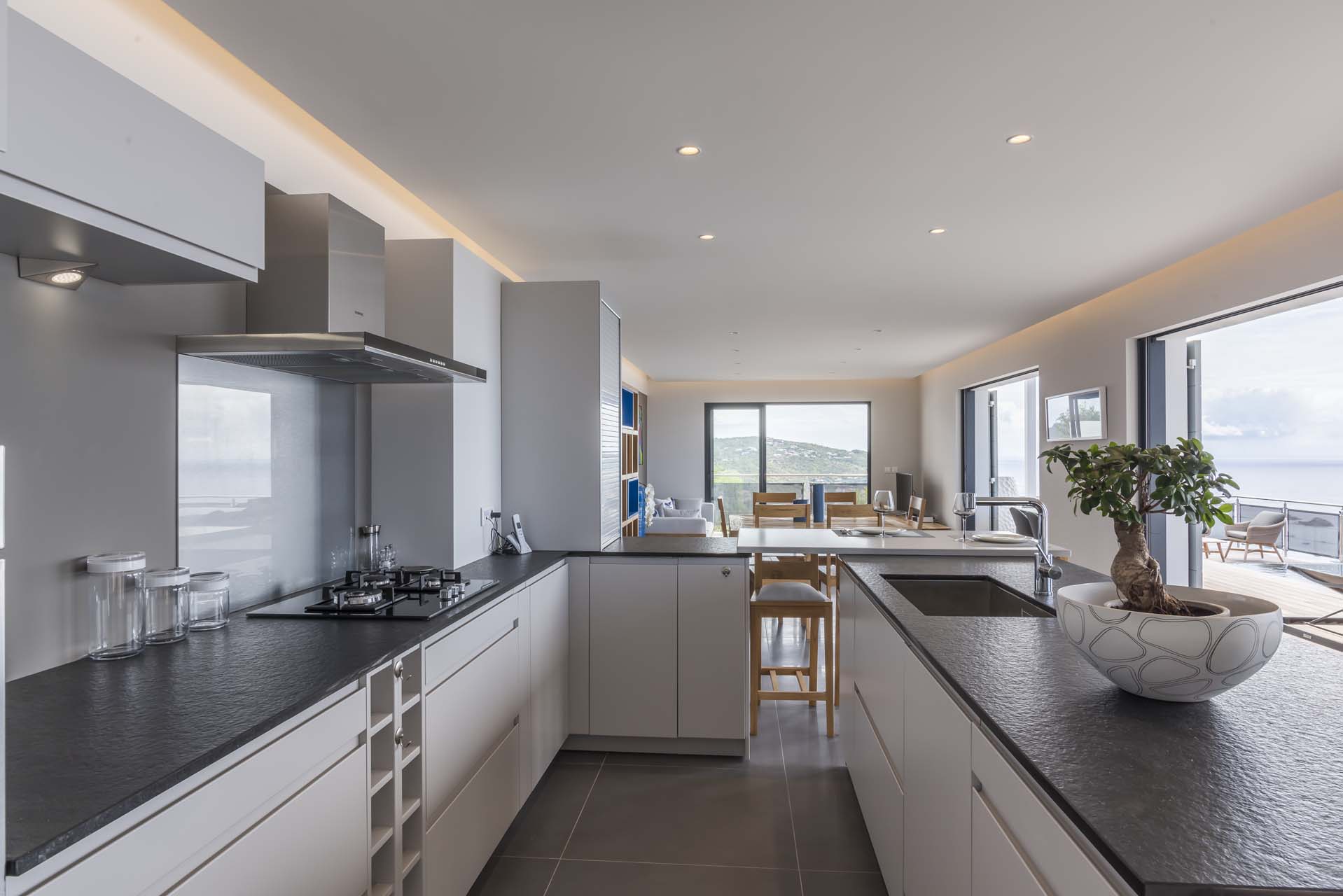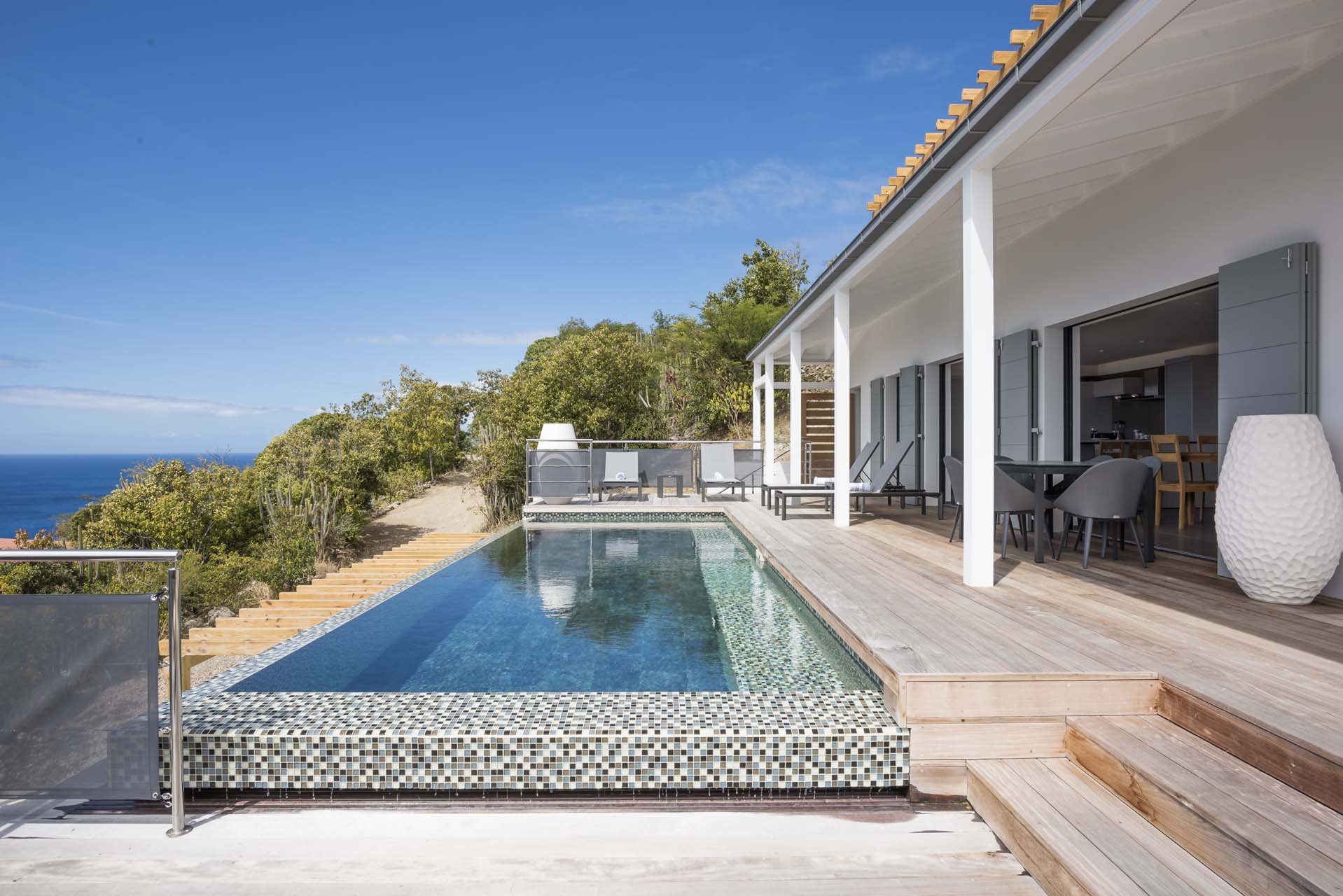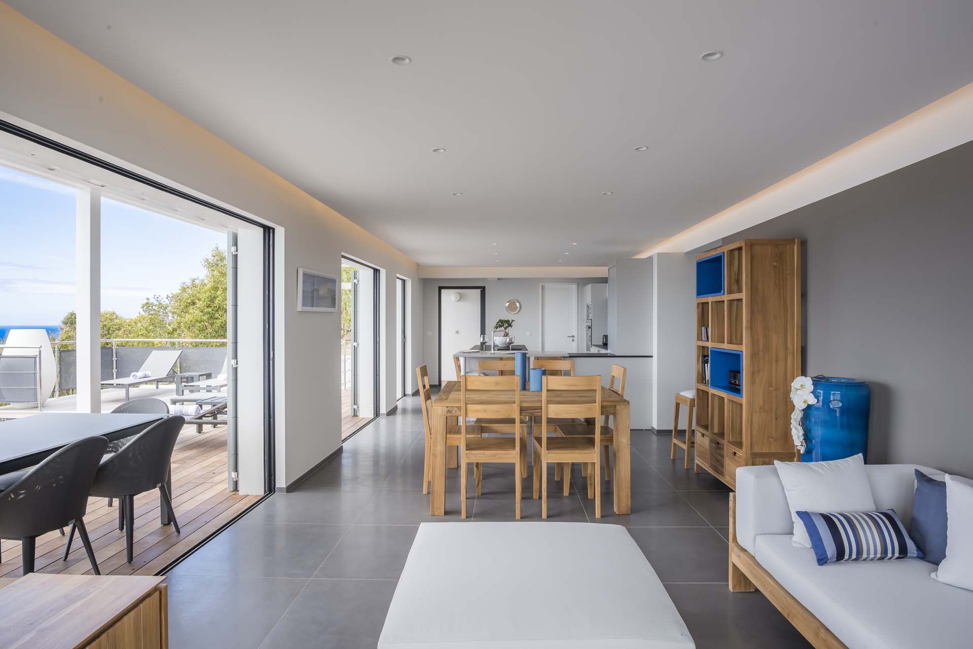 Cette villa très calme et contemporaine bénéficie d’un grand salon lumineux ouvert sur une terrasse où vous pourrez vous relaxer autour de la piscine en admirant la mer.