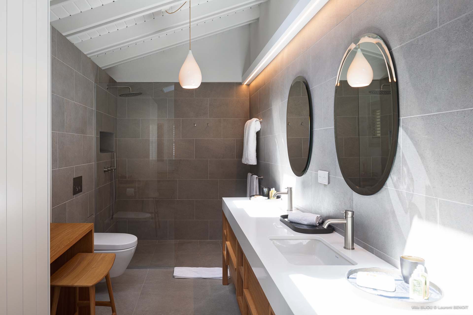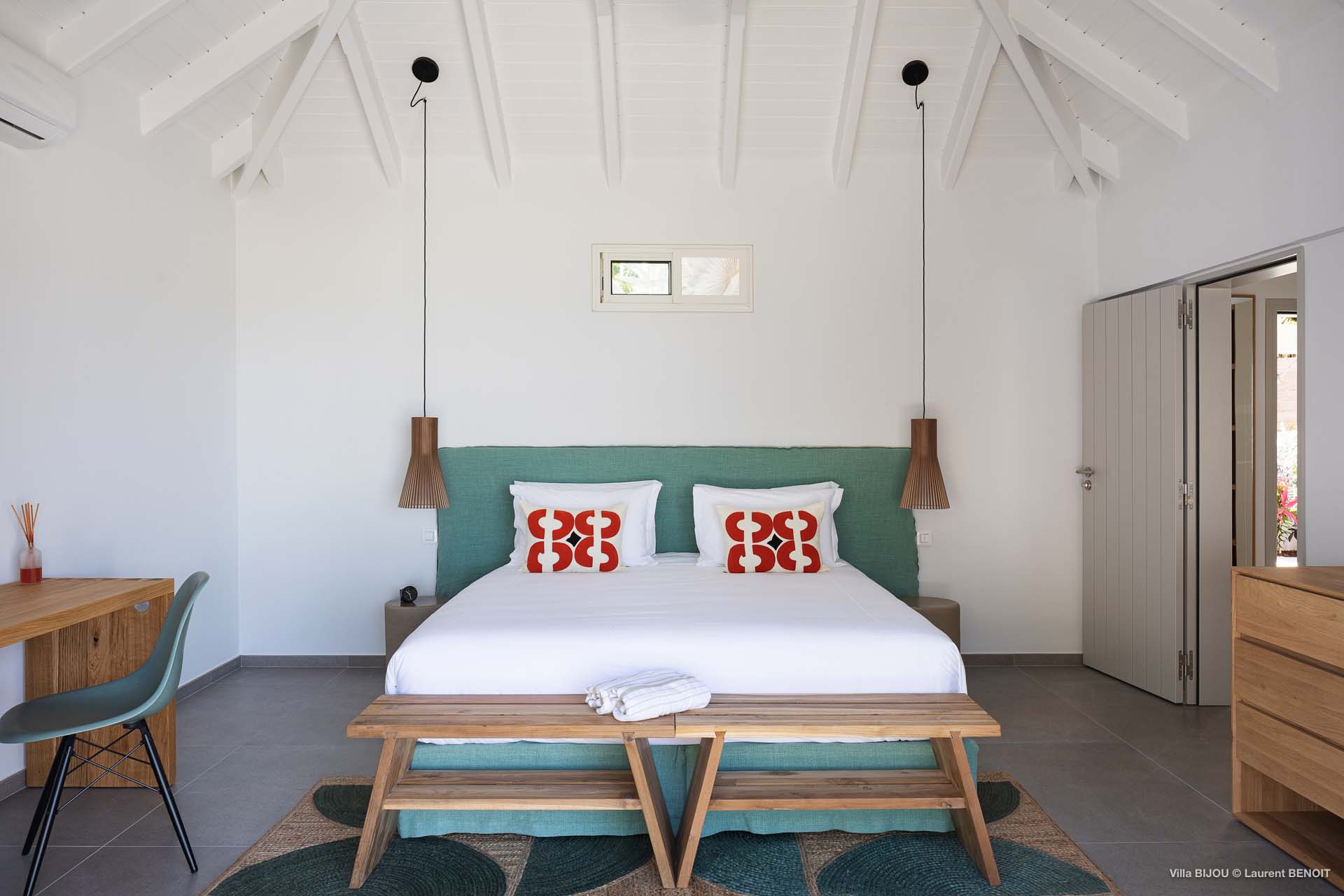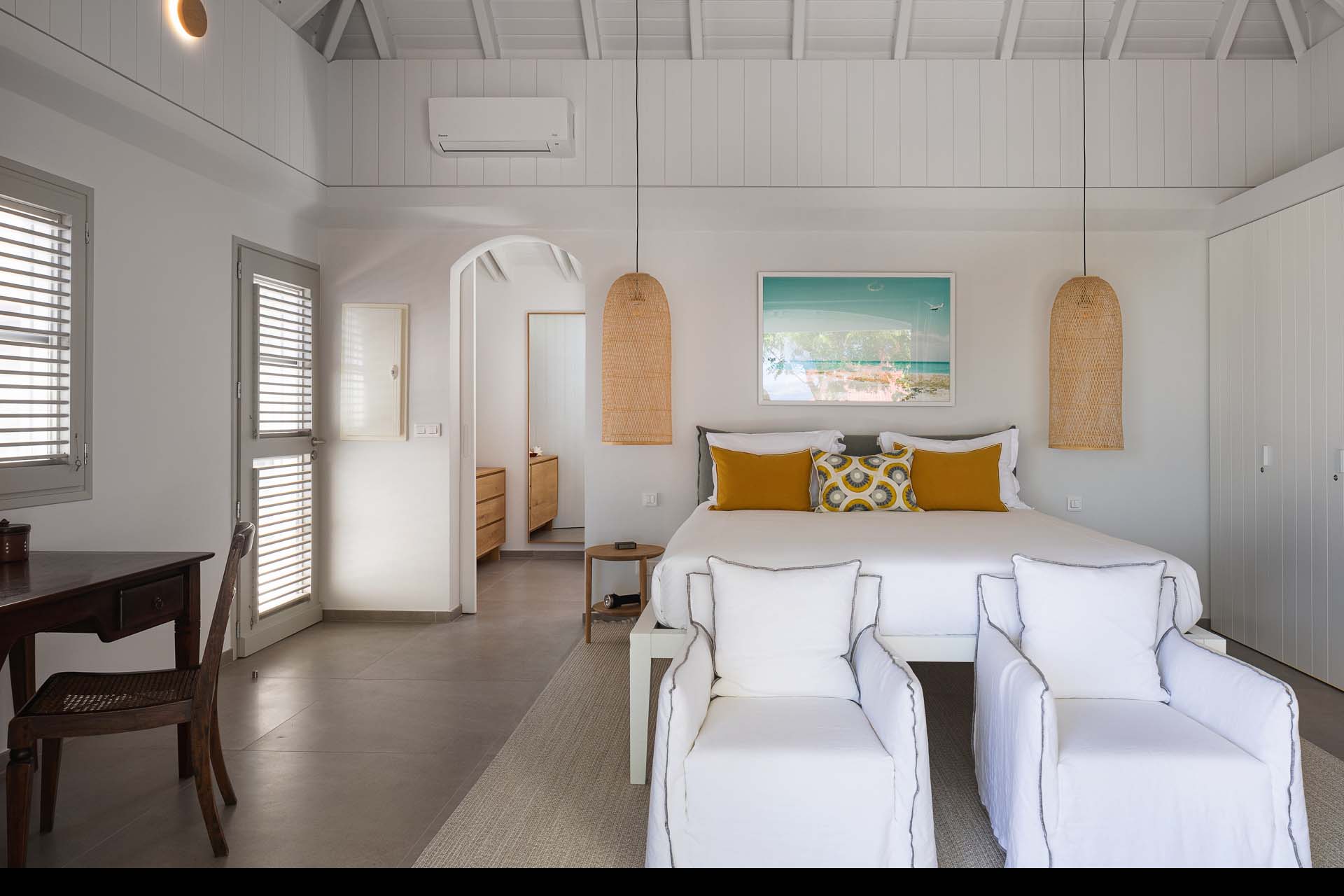 La villa comprend deux chambres climatisées avec salles de bains attenantes, positionnées de part et d’autre du séjour pour offrir intimité et confort. Chacune dispose d’une terrasse privative avec vue mer.