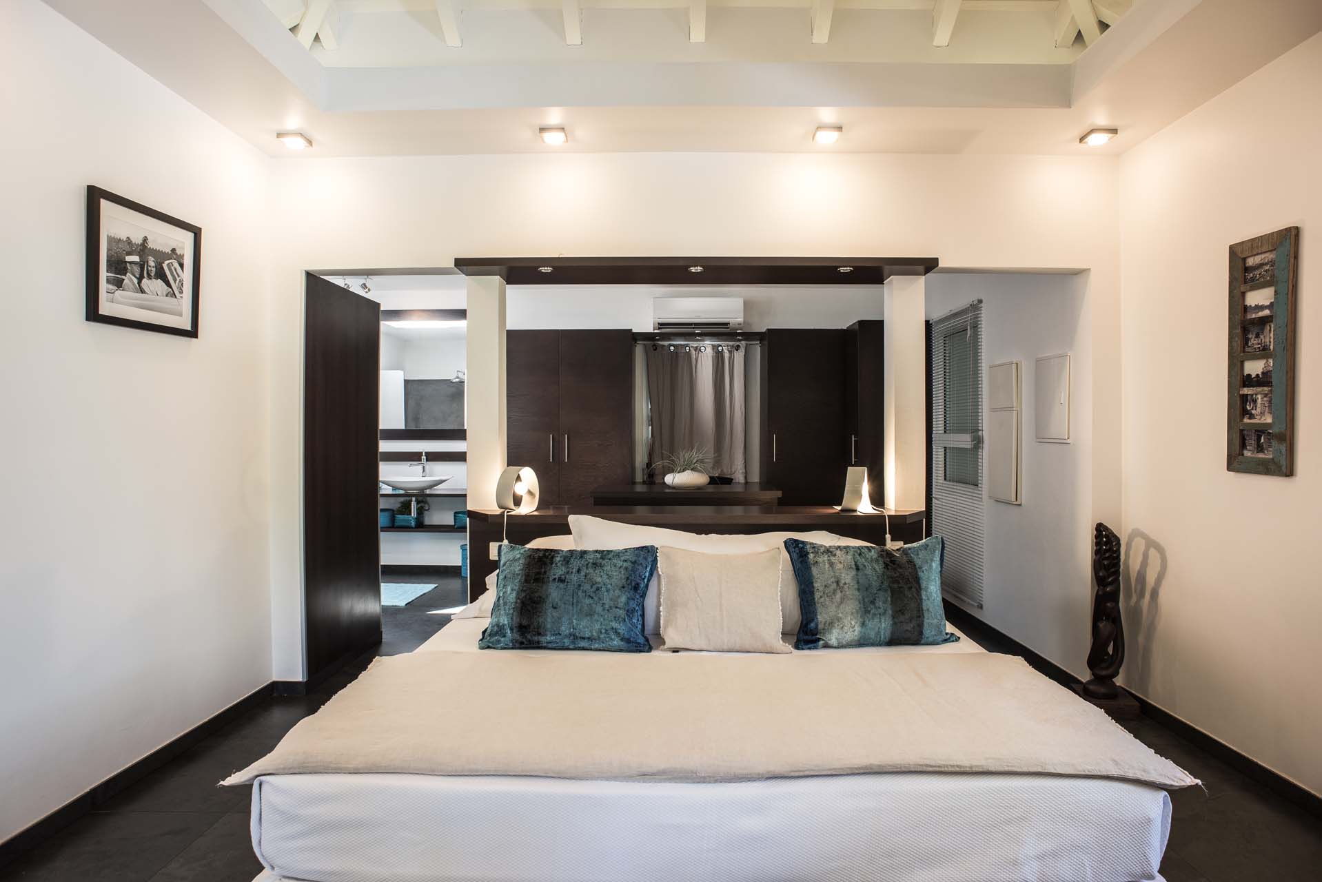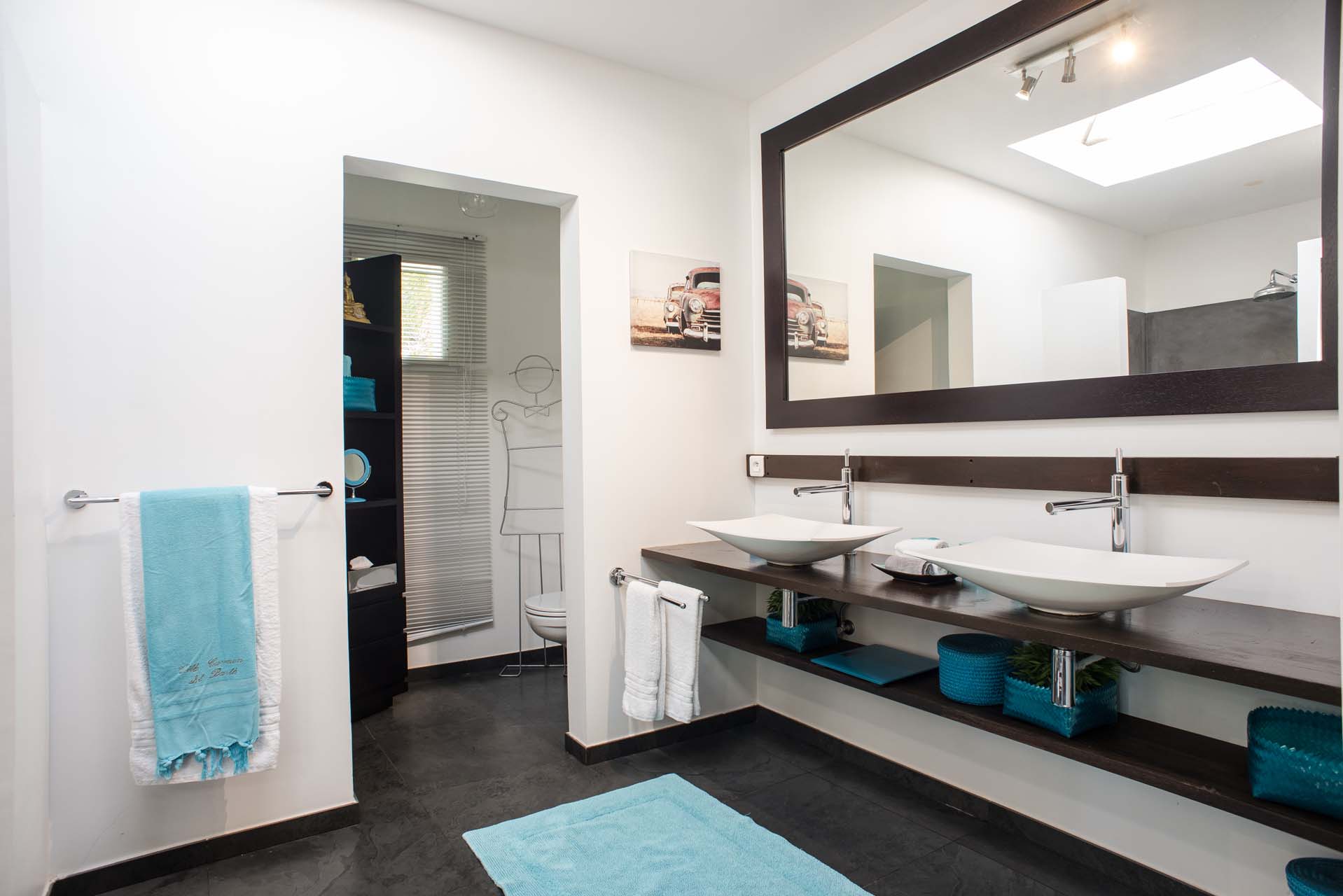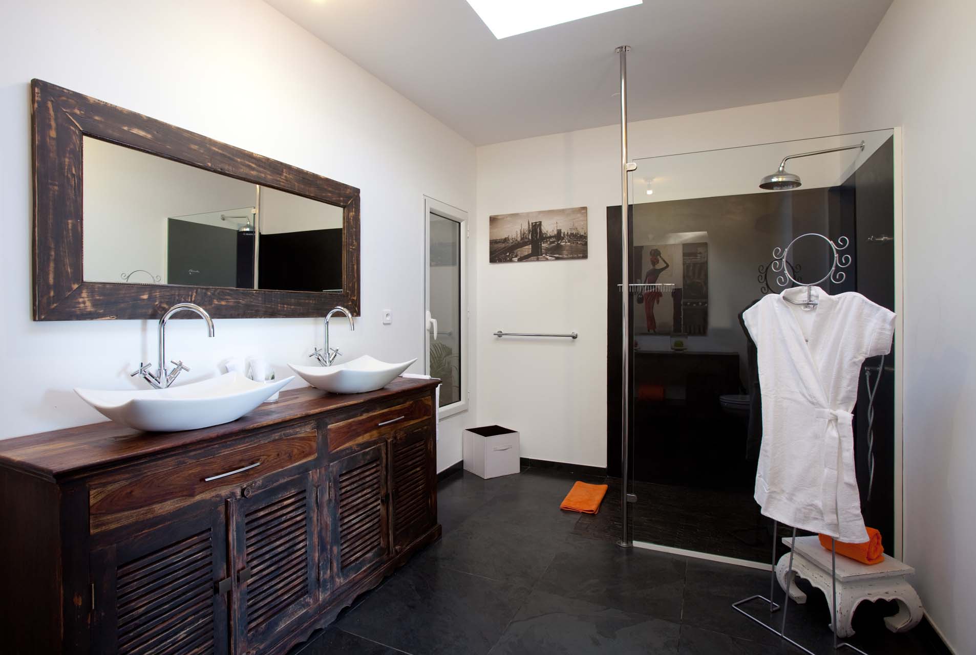 Les trois chambres sont réparties de part et d’autre du séjour. La première située d’un côté de la villa offre plus d’intimité, elle dispose d’une grande salle de bain ouverte sur la chambre. La deuxième et la troisième chambre sont situées de l’autre côté et communicantes. Elles partagent la même salle de bain, idéale pour des parents avec leurs enfants.