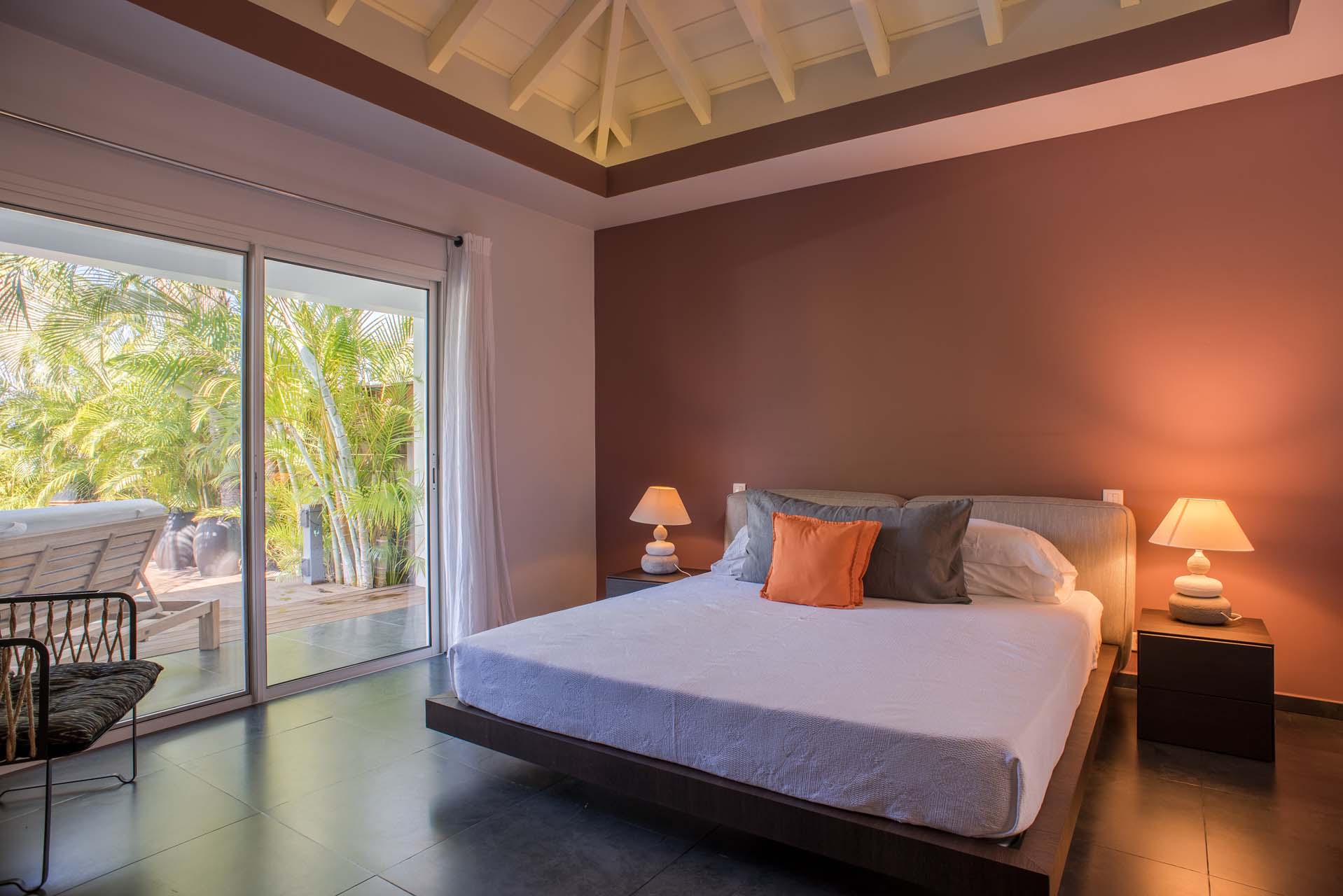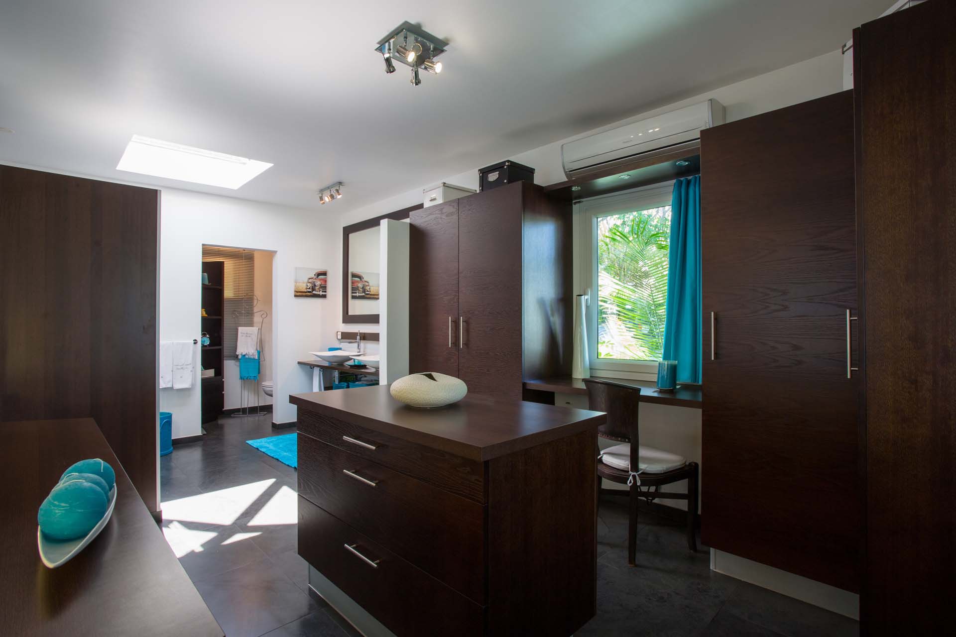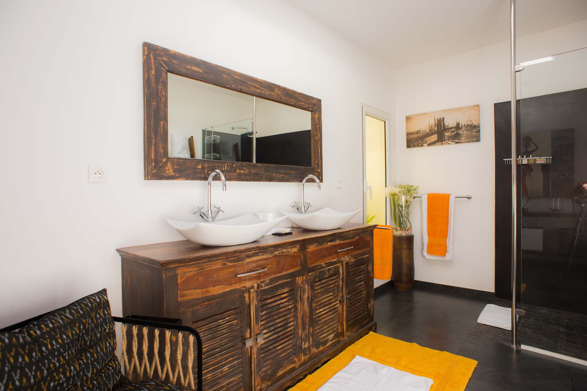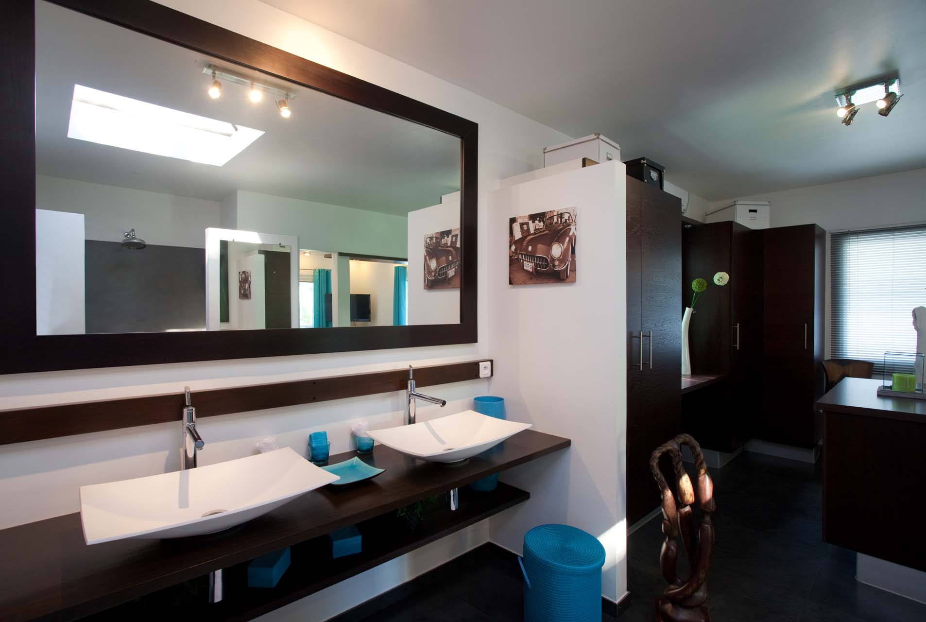 Les trois chambres sont réparties de part et d’autre du séjour. La première située d’un côté de la villa offre plus d’intimité, elle dispose d’une grande salle de bain ouverte sur la chambre. La deuxième et la troisième chambre sont situées de l’autre côté et communicantes. Elles partagent la même salle de bain, idéale pour des parents avec leurs enfants.