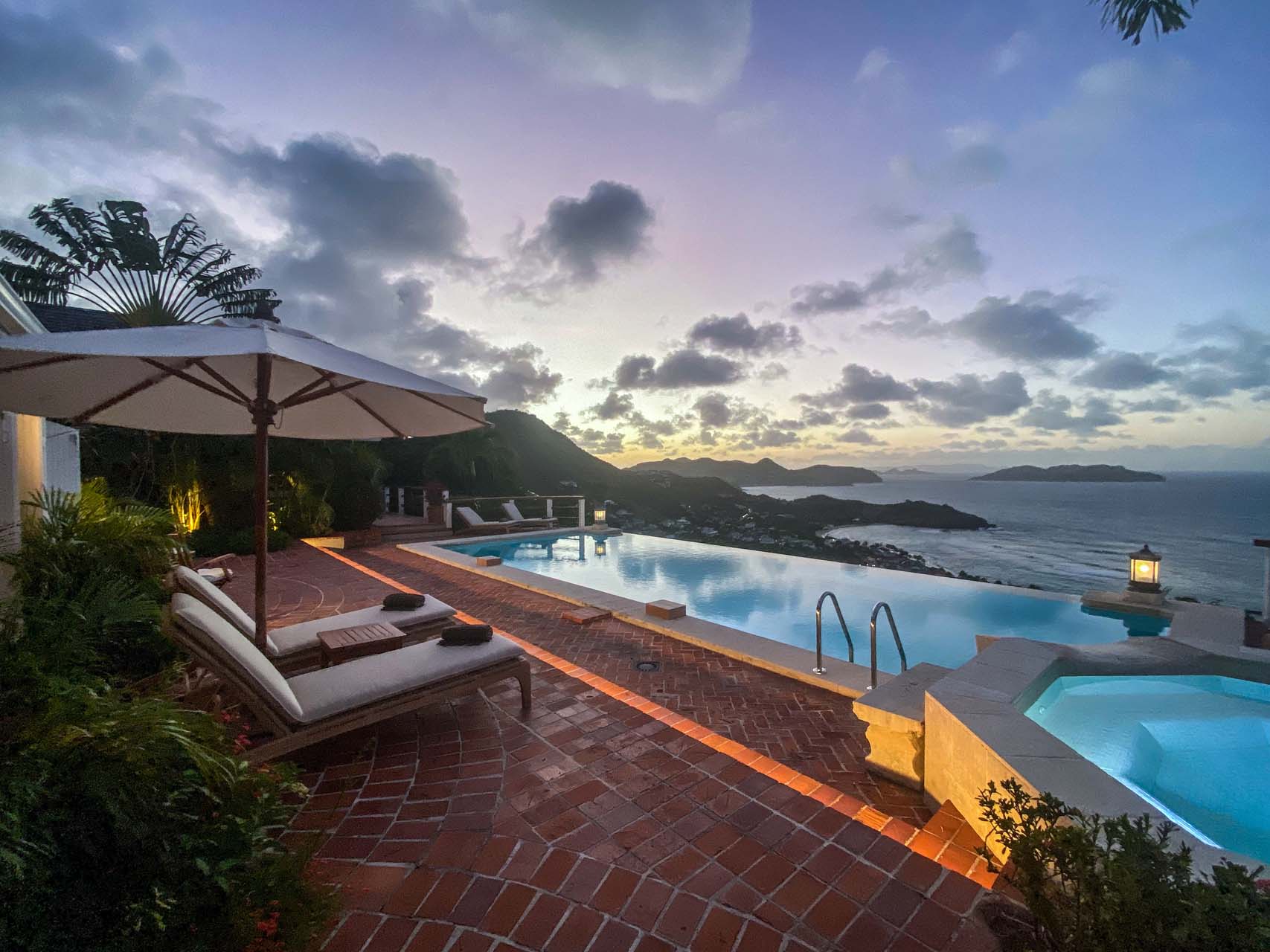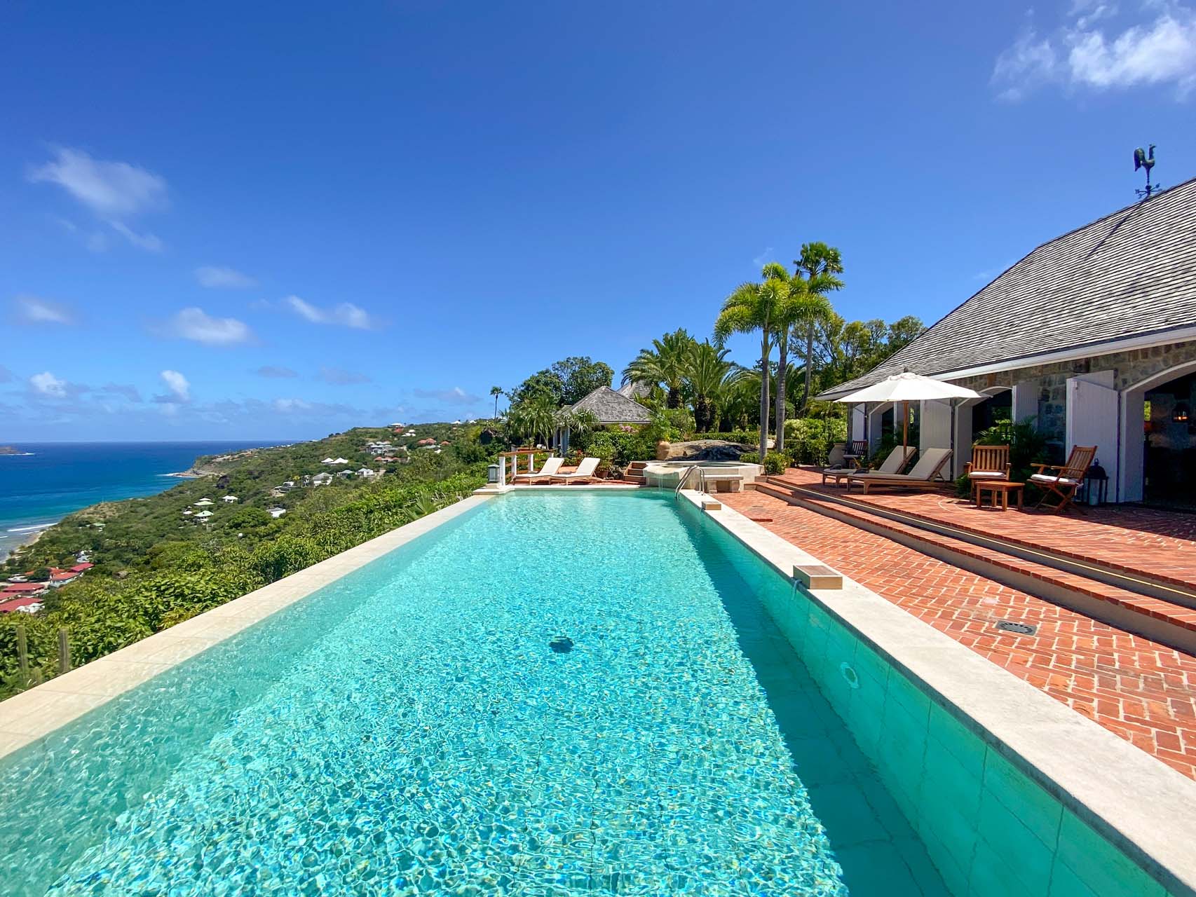 La longue piscine chauffée et son jacuzzi prônent la vue époustouflante.