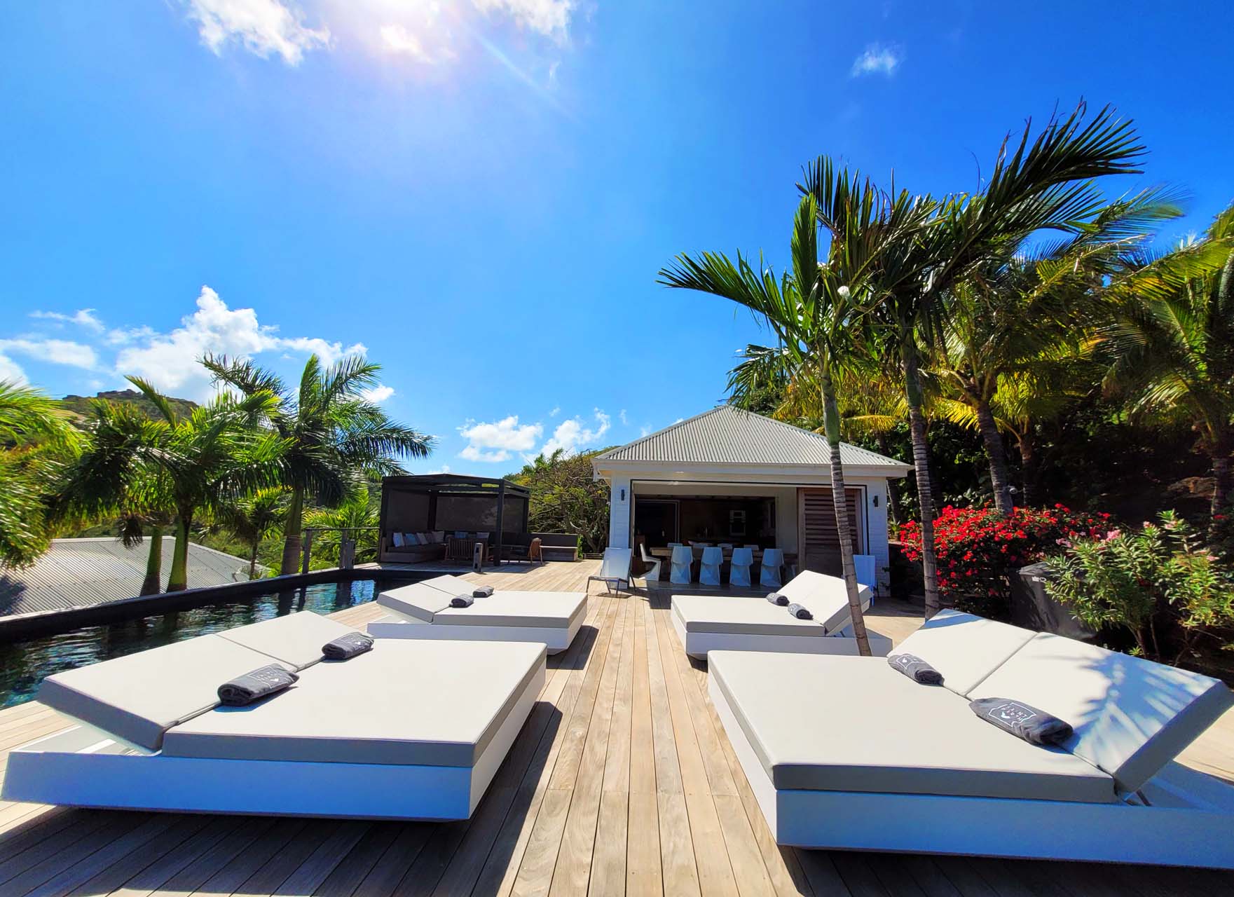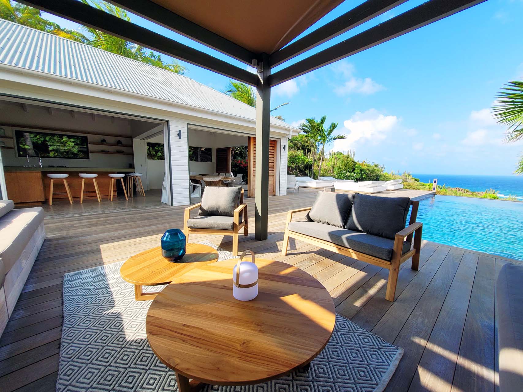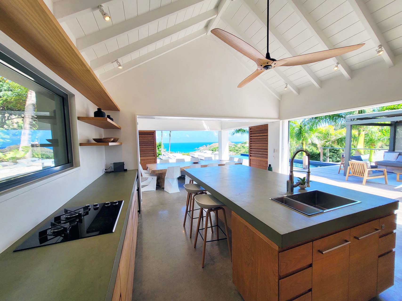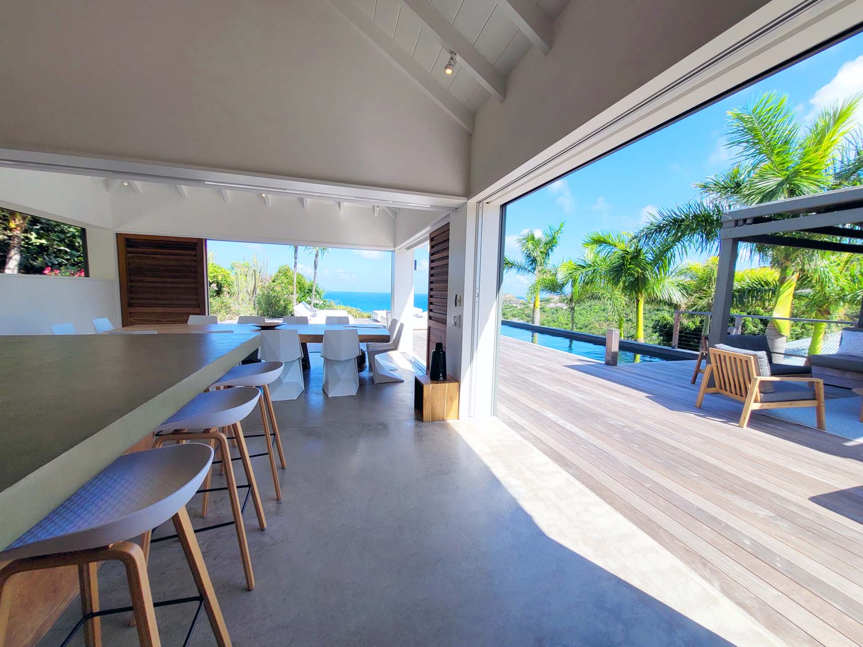 – Une villa principale avec la cuisine et la salle à manger ouvertes sur le deck, la piscine et la vue sur l’océan. A l’arrière une agréable salle de télévision climatisée.