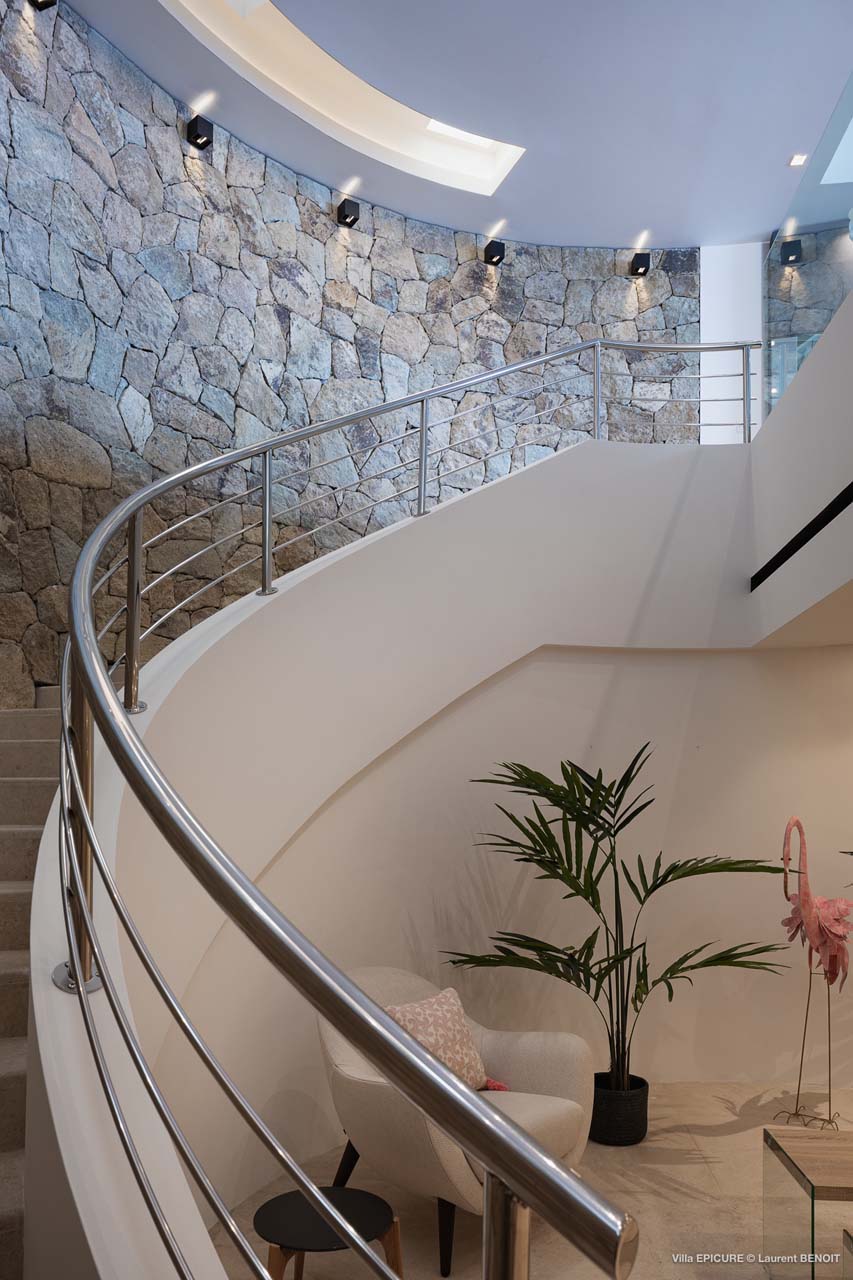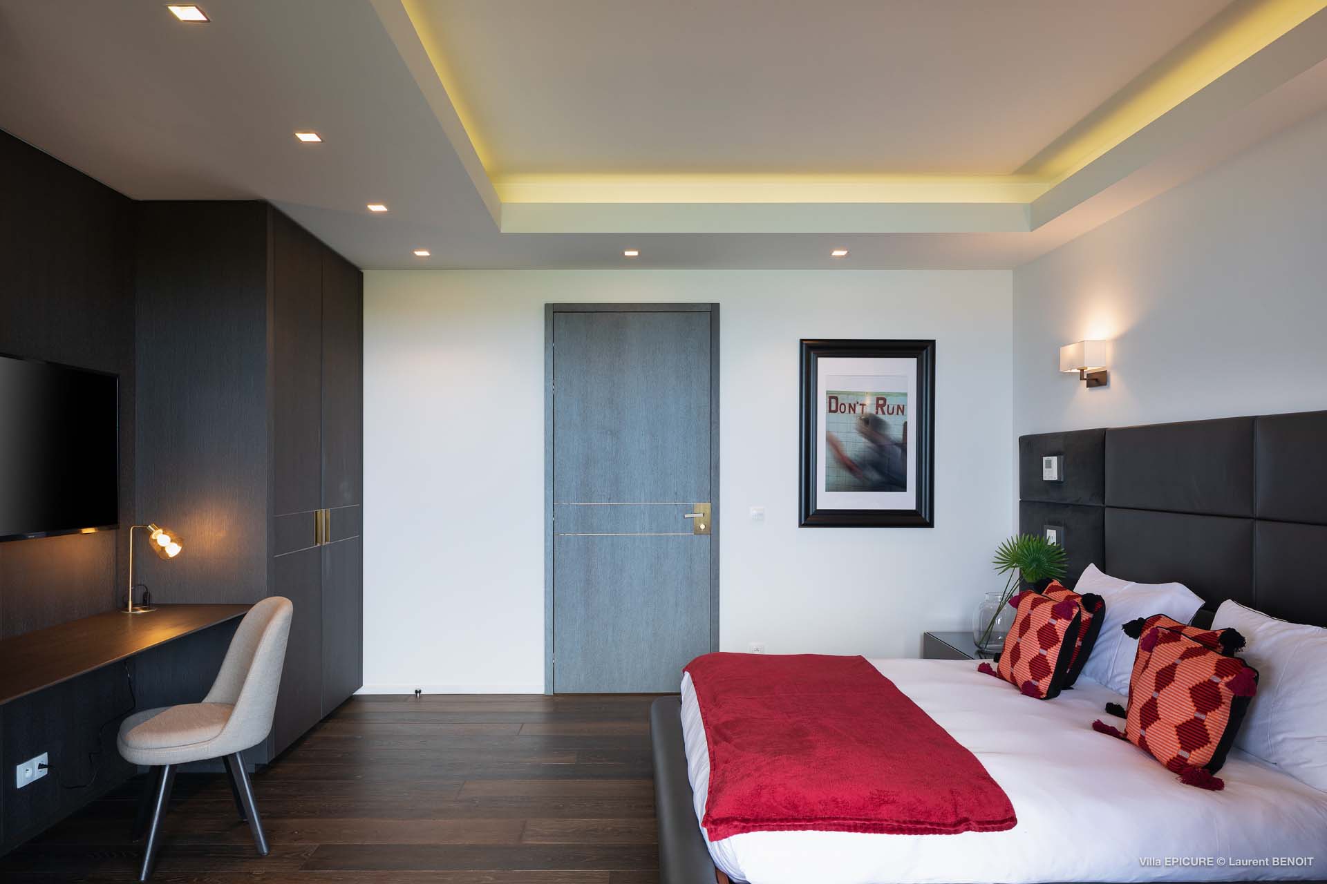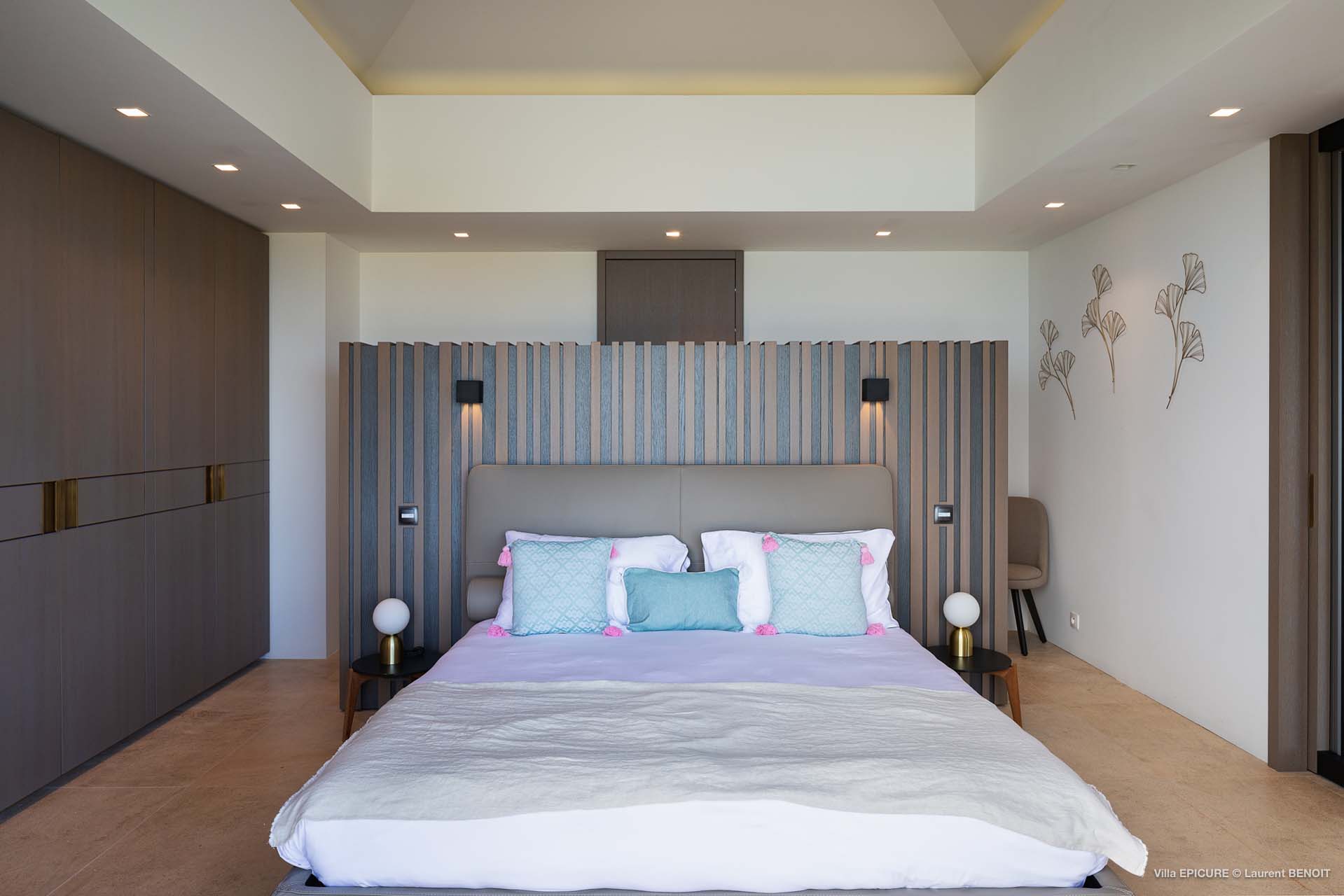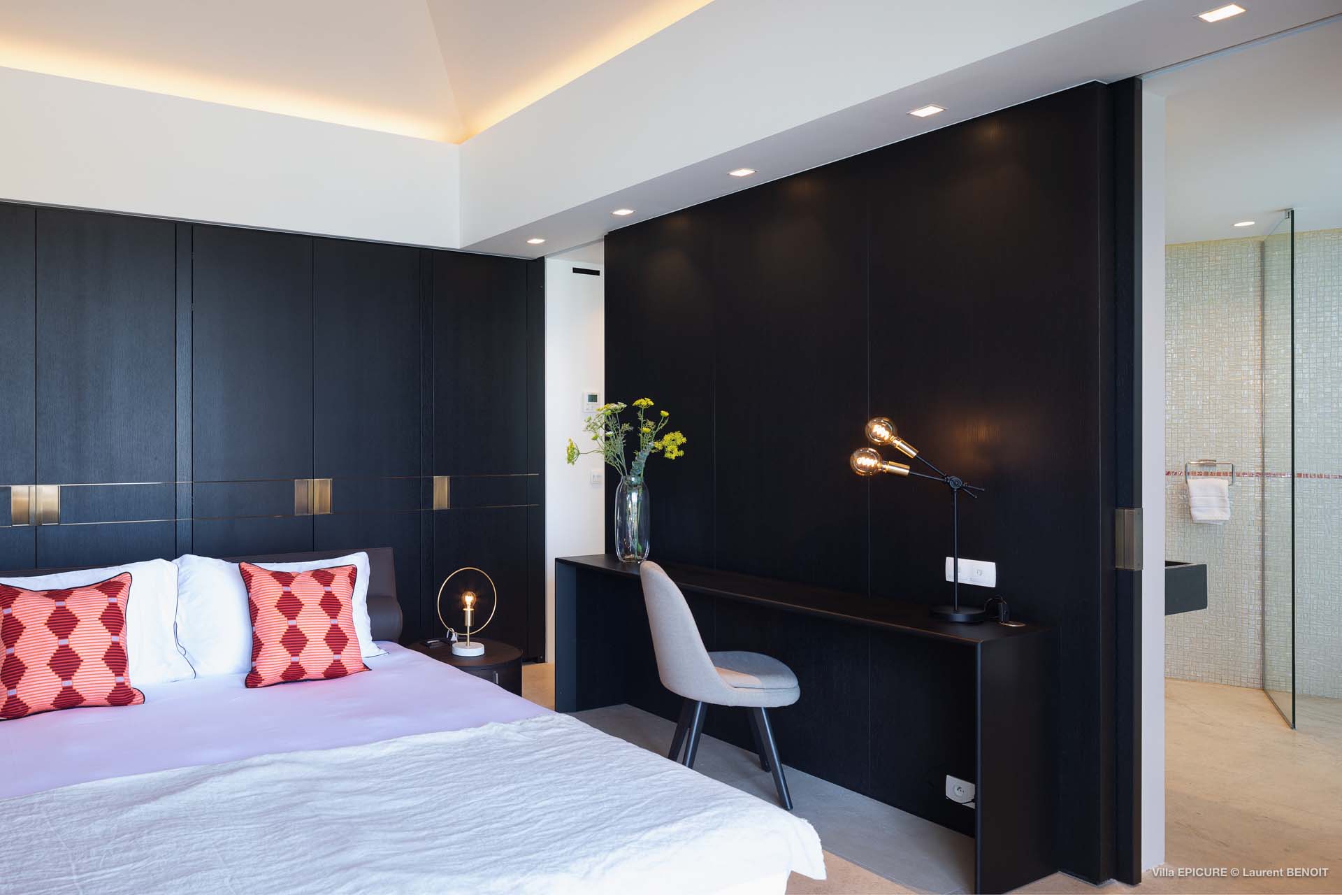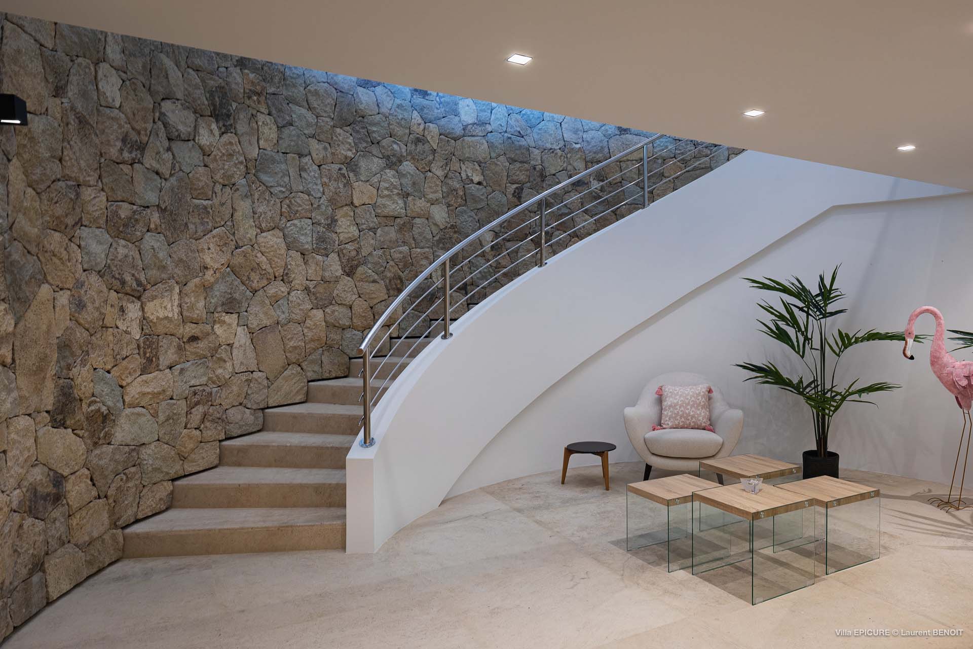 Sept chambres au design travaillé vous accueilleront et sauront sans nul doute vous plonger dans une ambiance relaxante. Trois d’entre elles se situent au niveau principal de la villa et les quatre autres sont à l’étage inférieur accessible par un majestueux escalier en pierre.