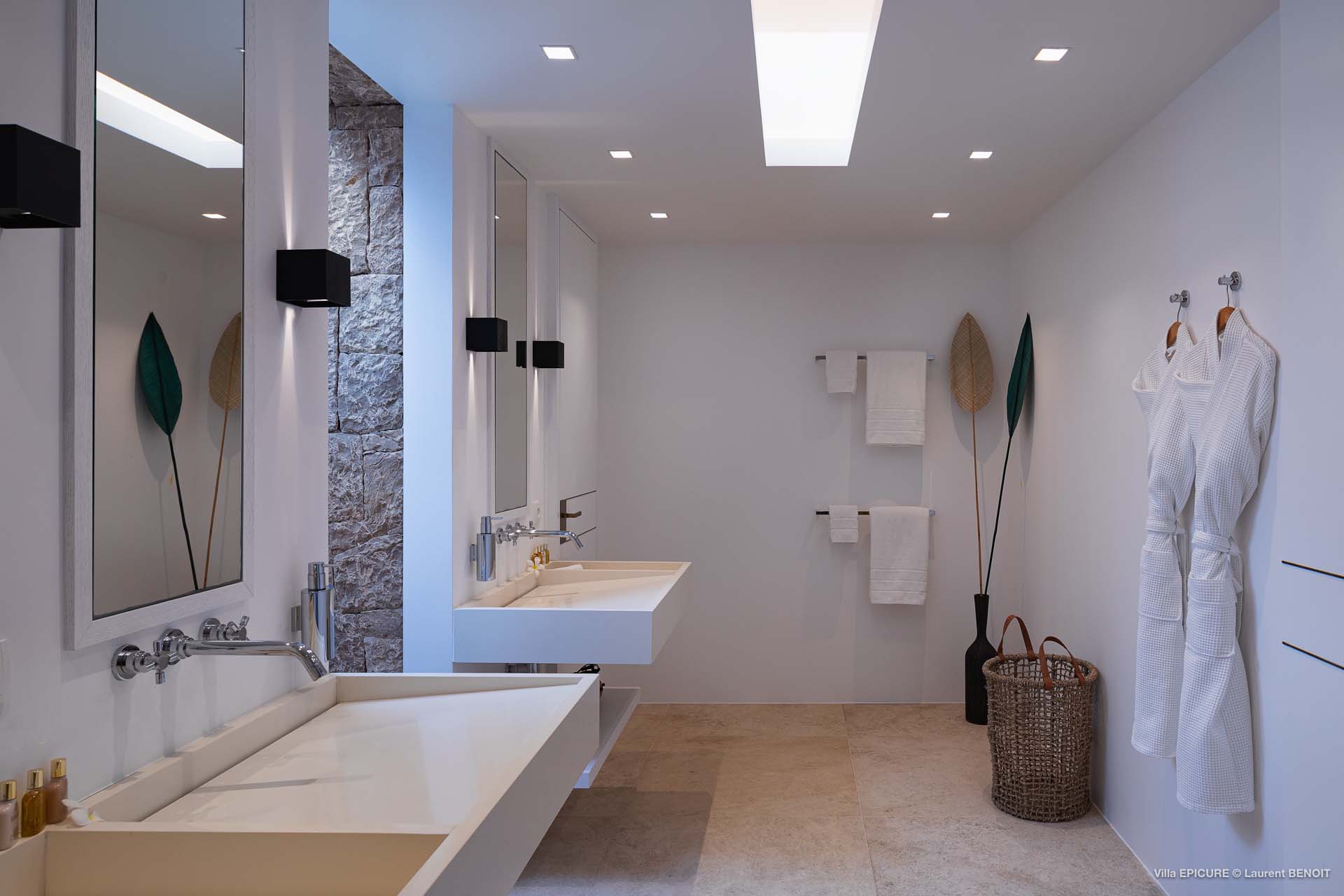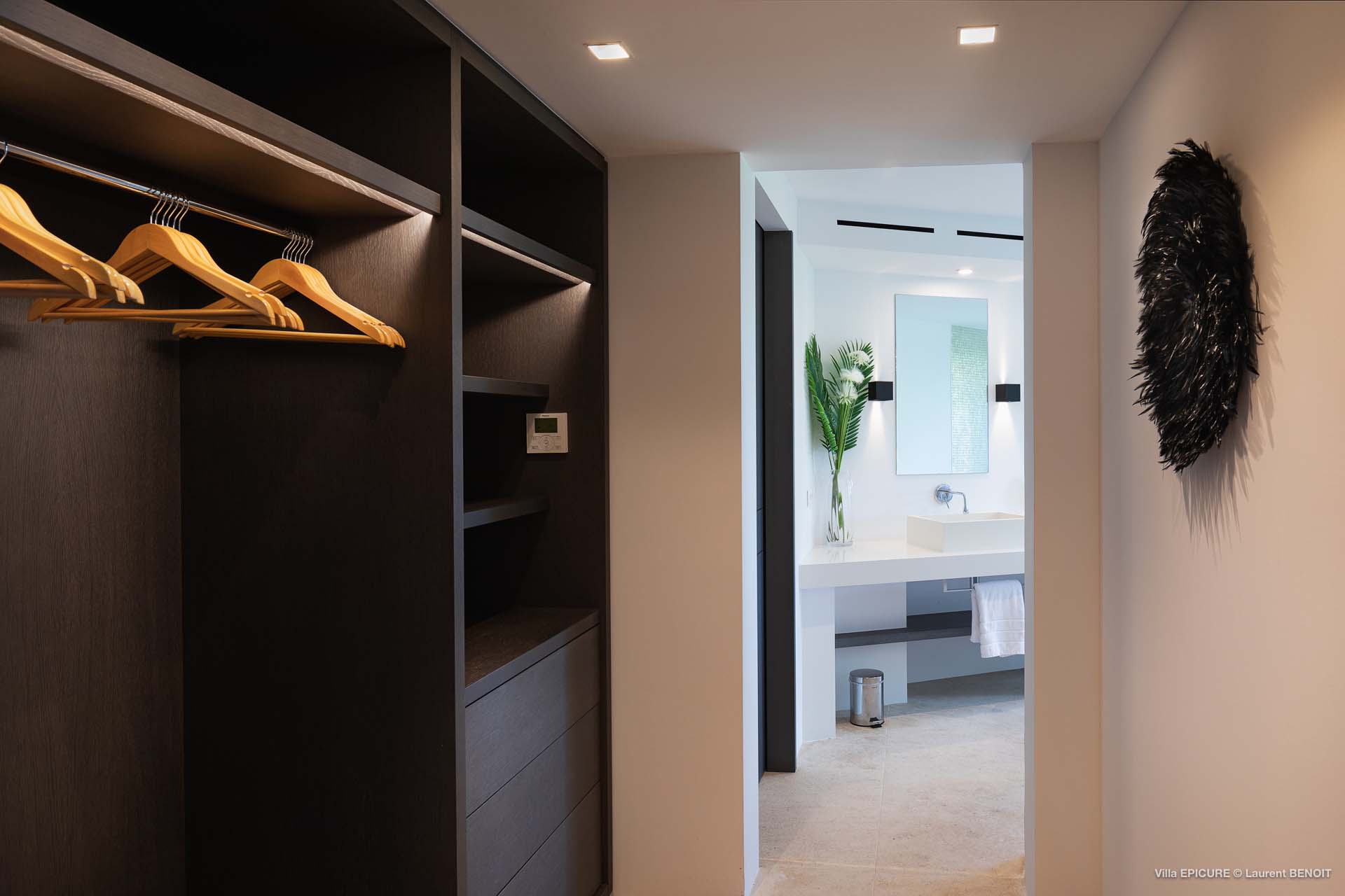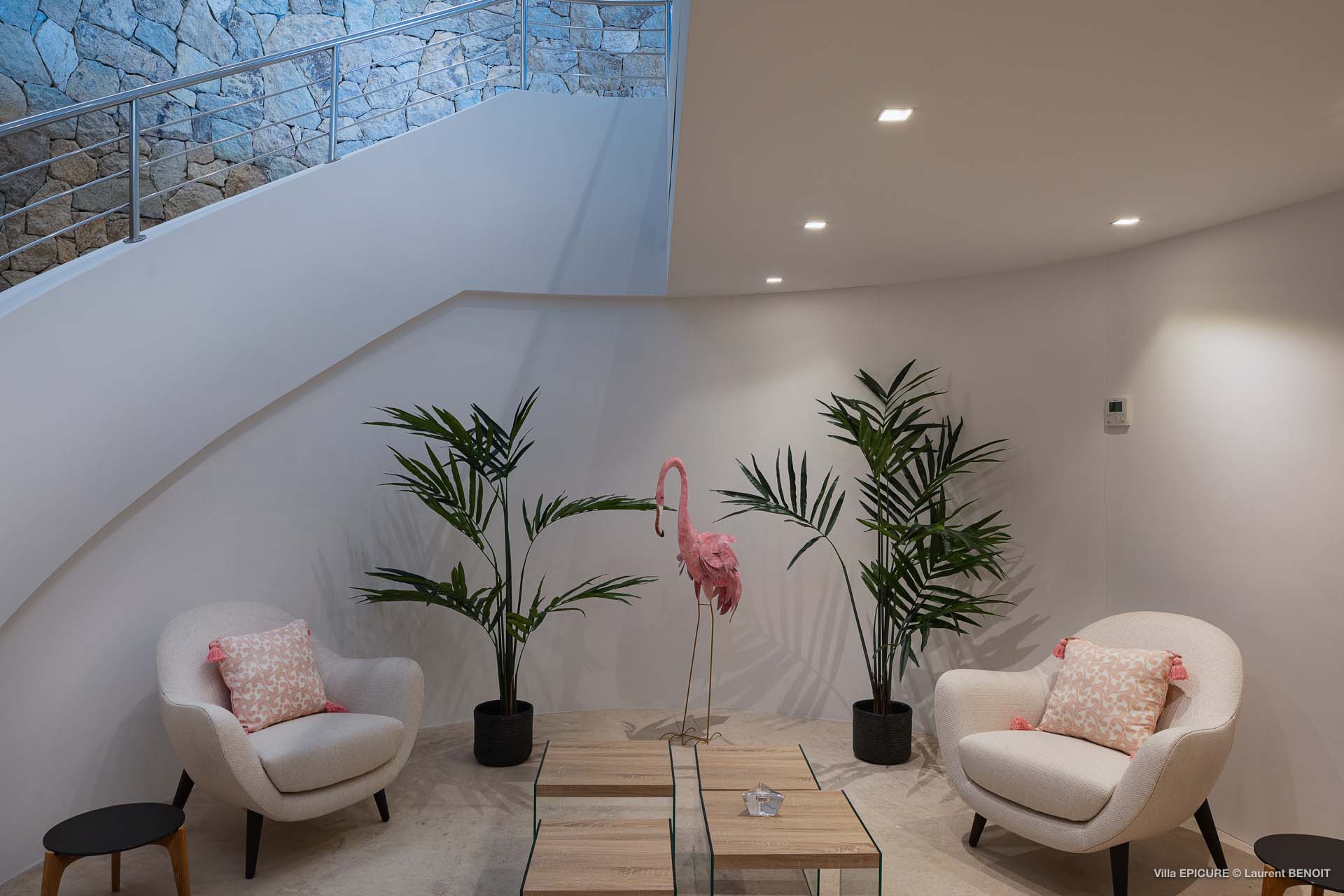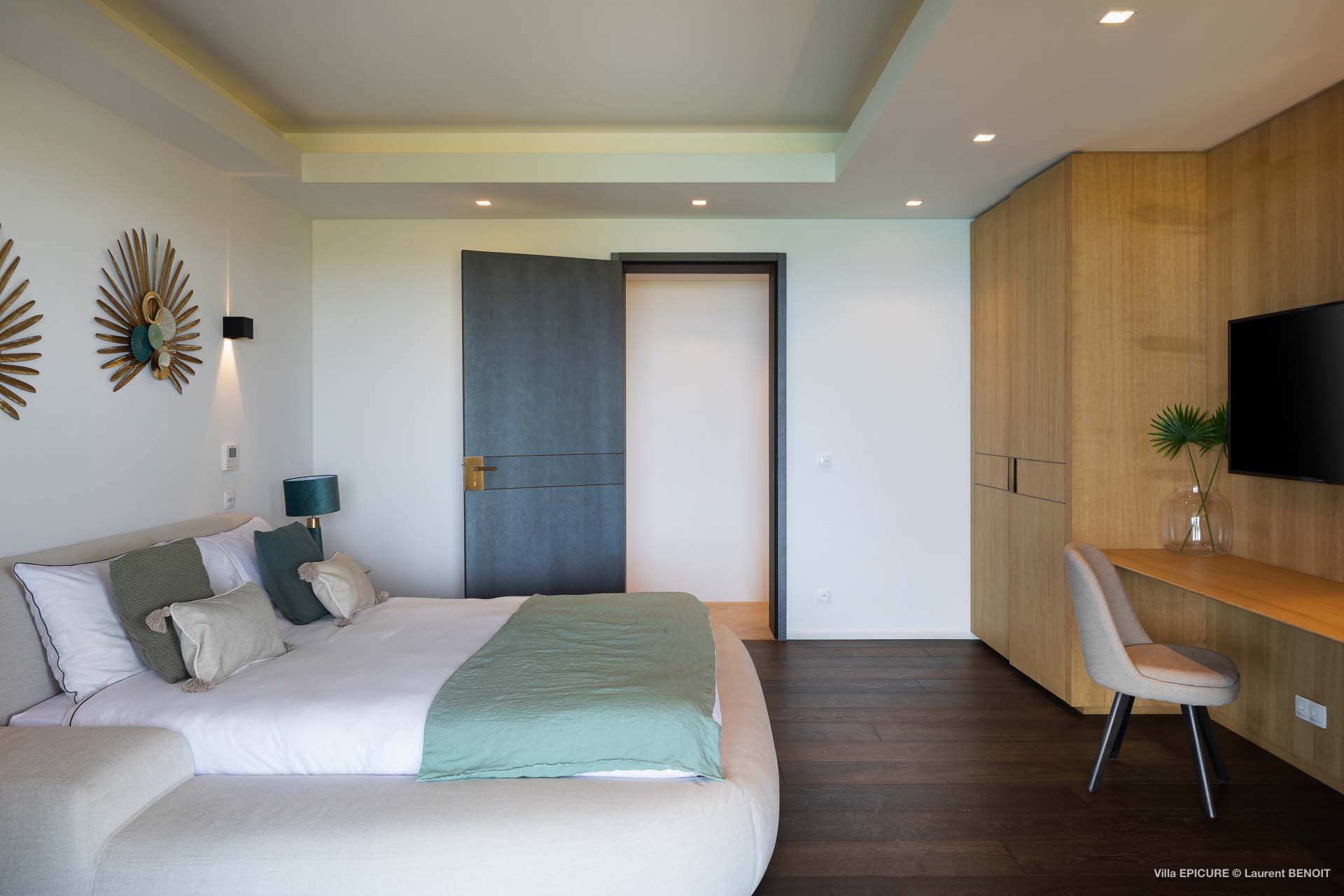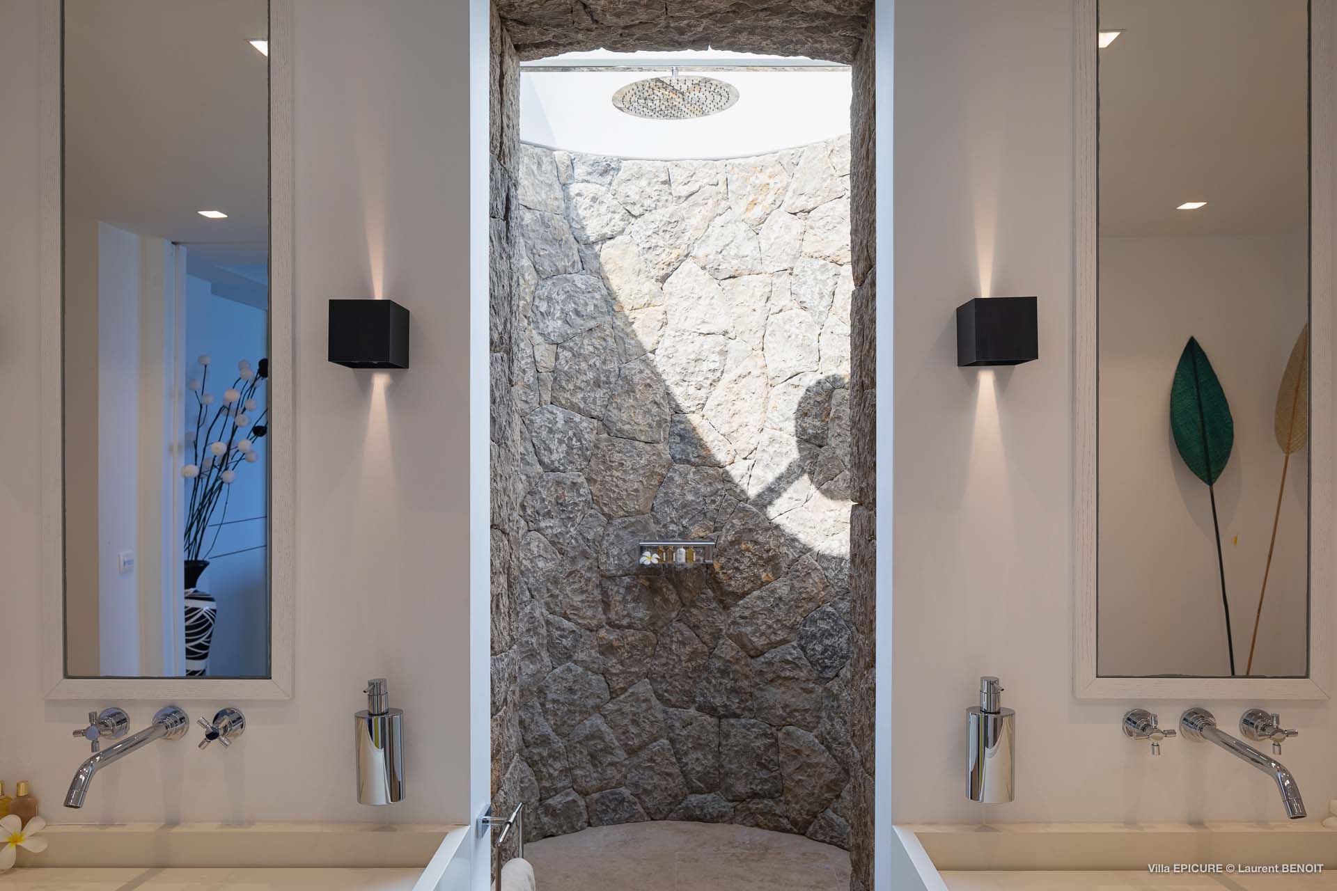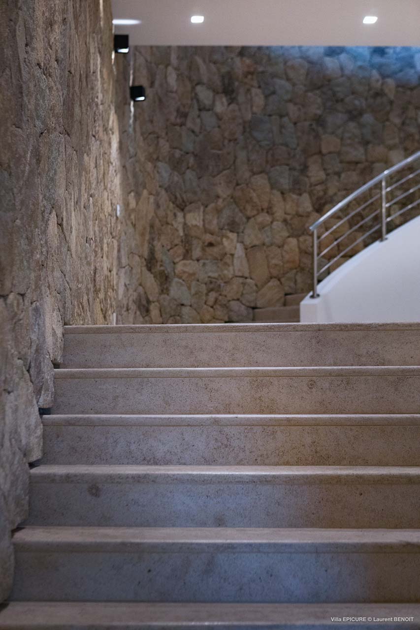 Sept chambres au design travaillé vous accueilleront et sauront sans nul doute vous plonger dans une ambiance relaxante. Trois d’entre elles se situent au niveau principal de la villa et les quatre autres sont à l’étage inférieur accessible par un majestueux escalier en pierre.