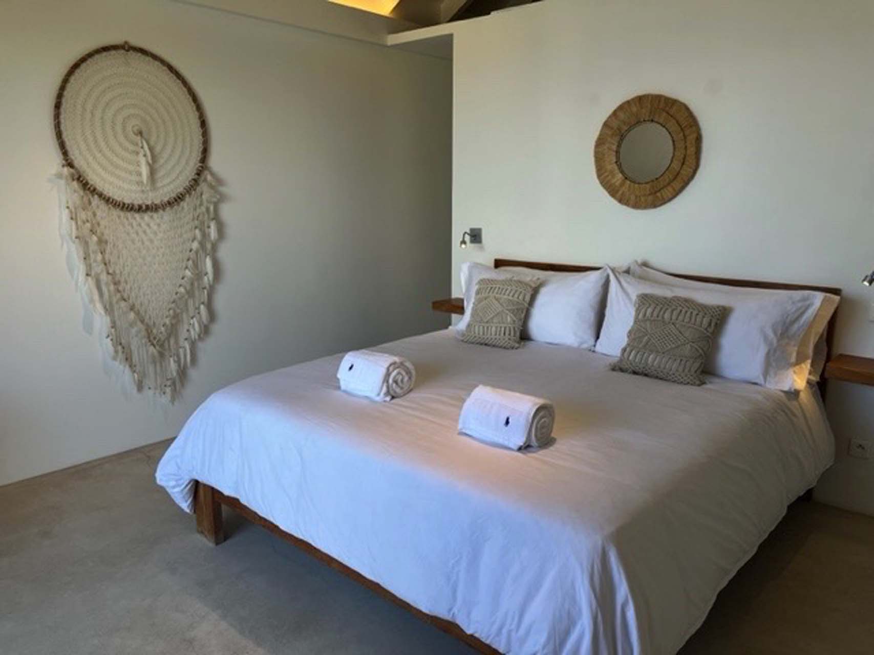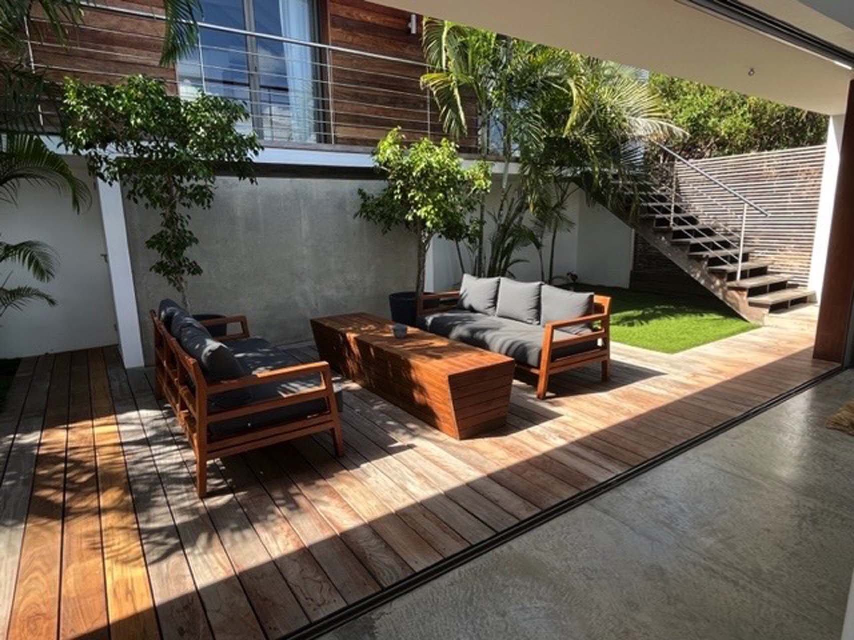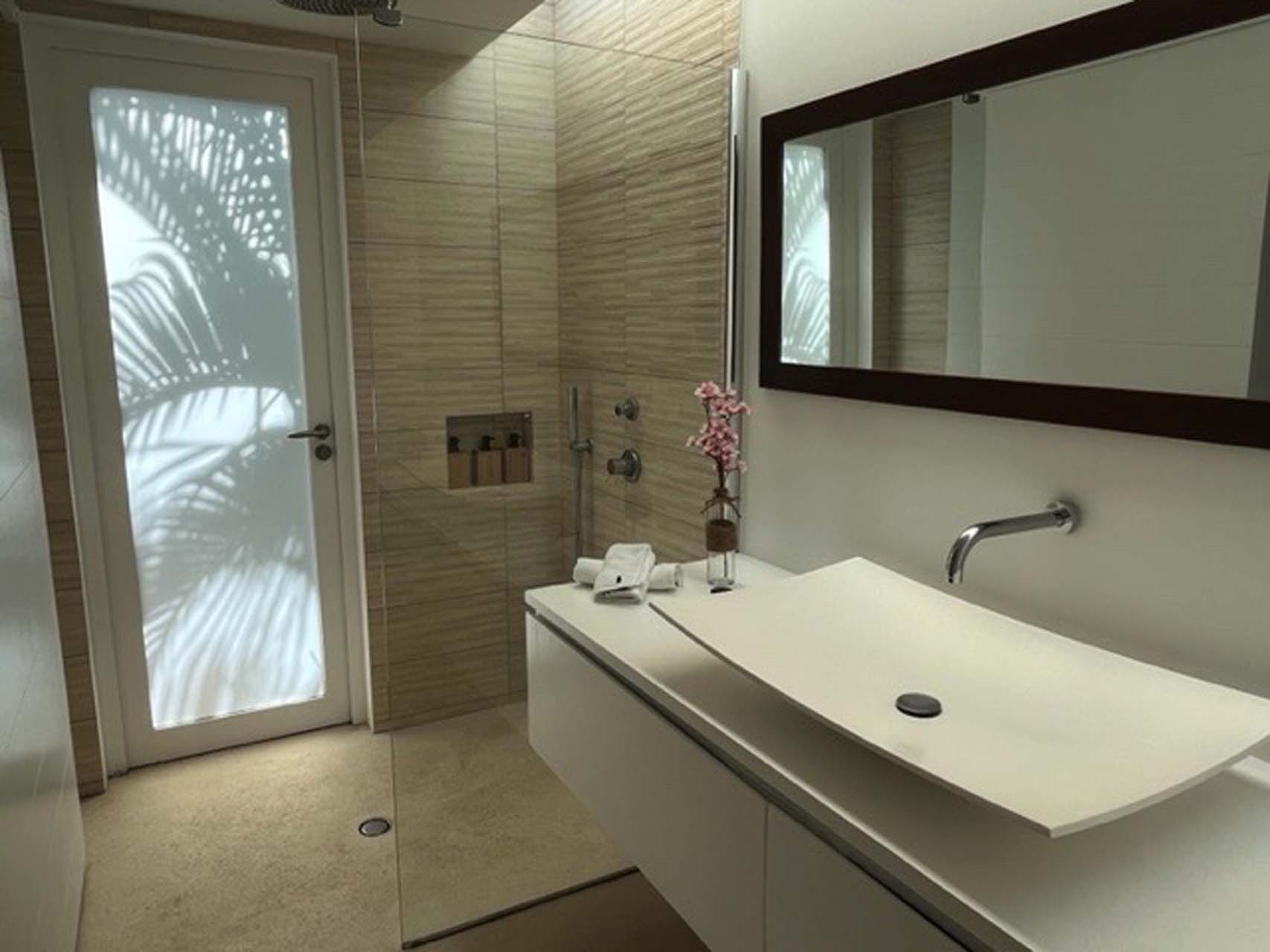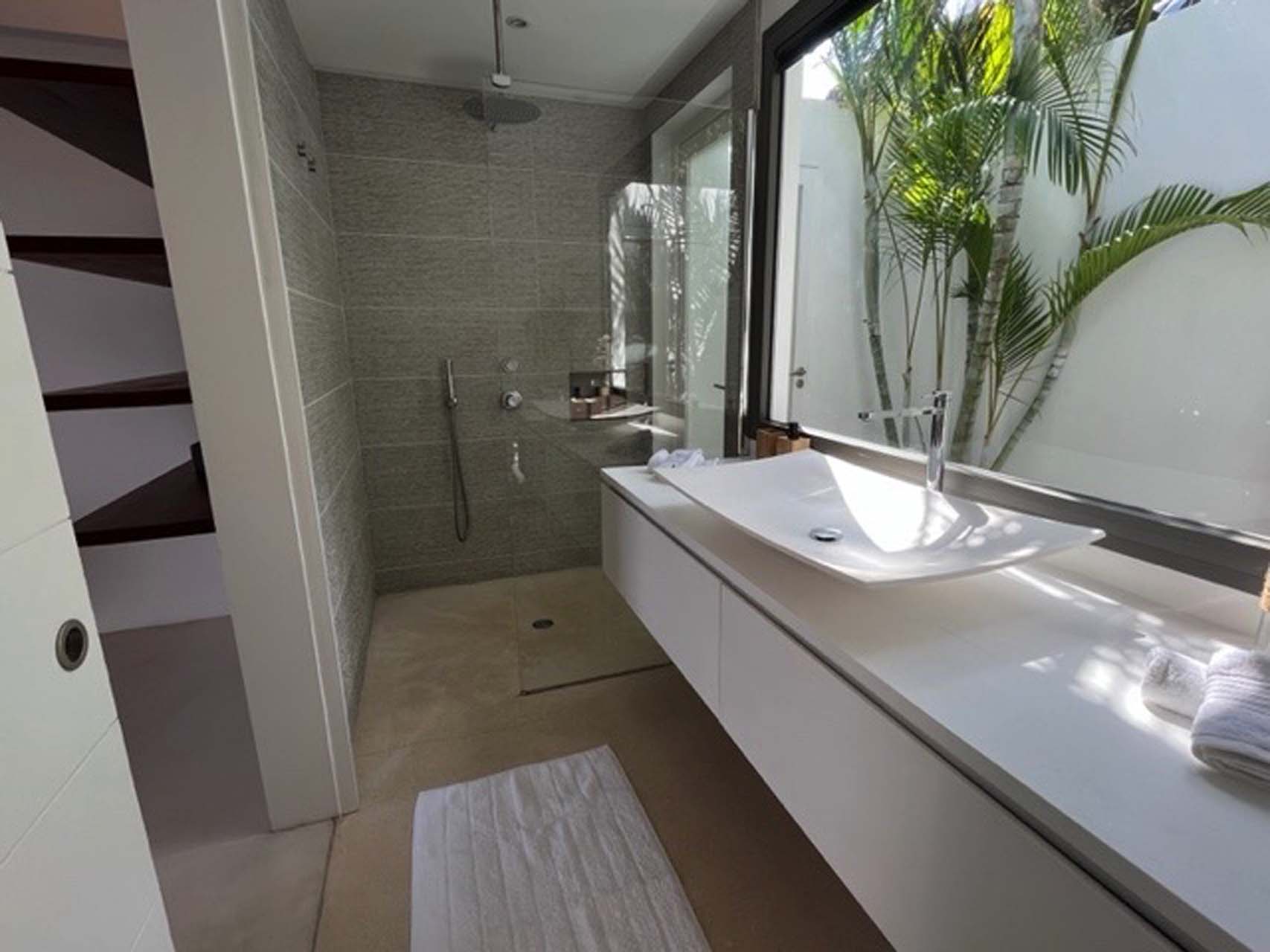 En traversant le salon extérieur et sa fontaine murale, vous accéderez aux trois chambres climatisées. Toutes possèdent leurs propres salles de bain avec douche à l’italienne et ont accès à une douche extérieure.