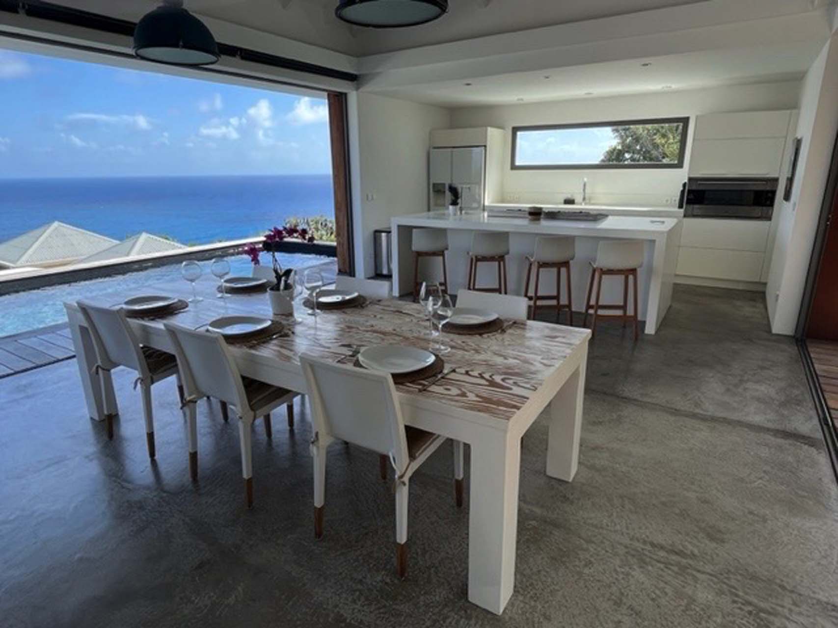 La cuisine moderne et bien équipée avec machine à glaçons pour vos cocktails , est ouverte sur le salon et la salle à manger. L’espace est ouvert des deux côtés, permettant à une légère brise de rafraîchir la chaleur tropicale. La terrasse, orienté vers l’Est est parfait pour admirer le paysage et le lever de soleil.