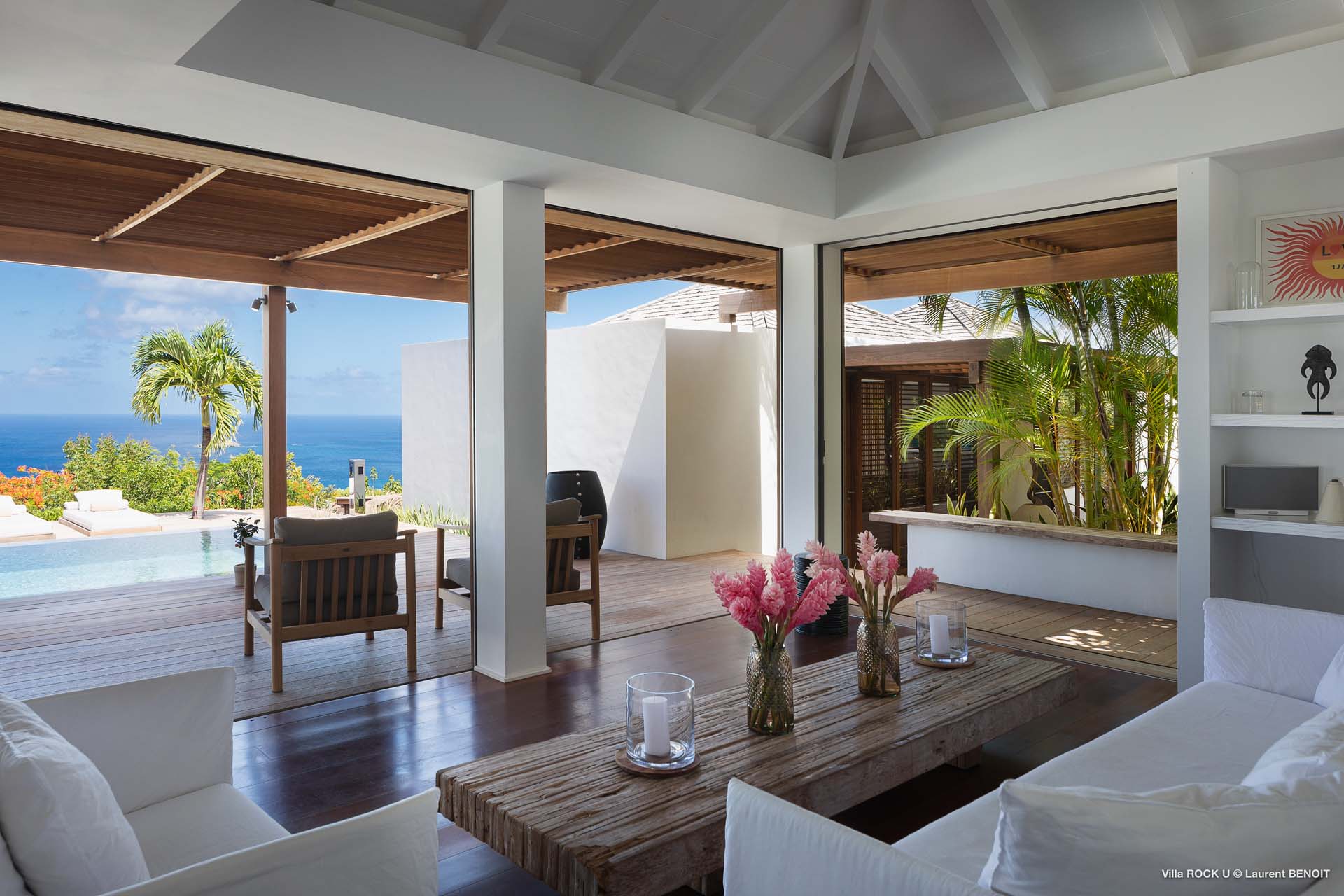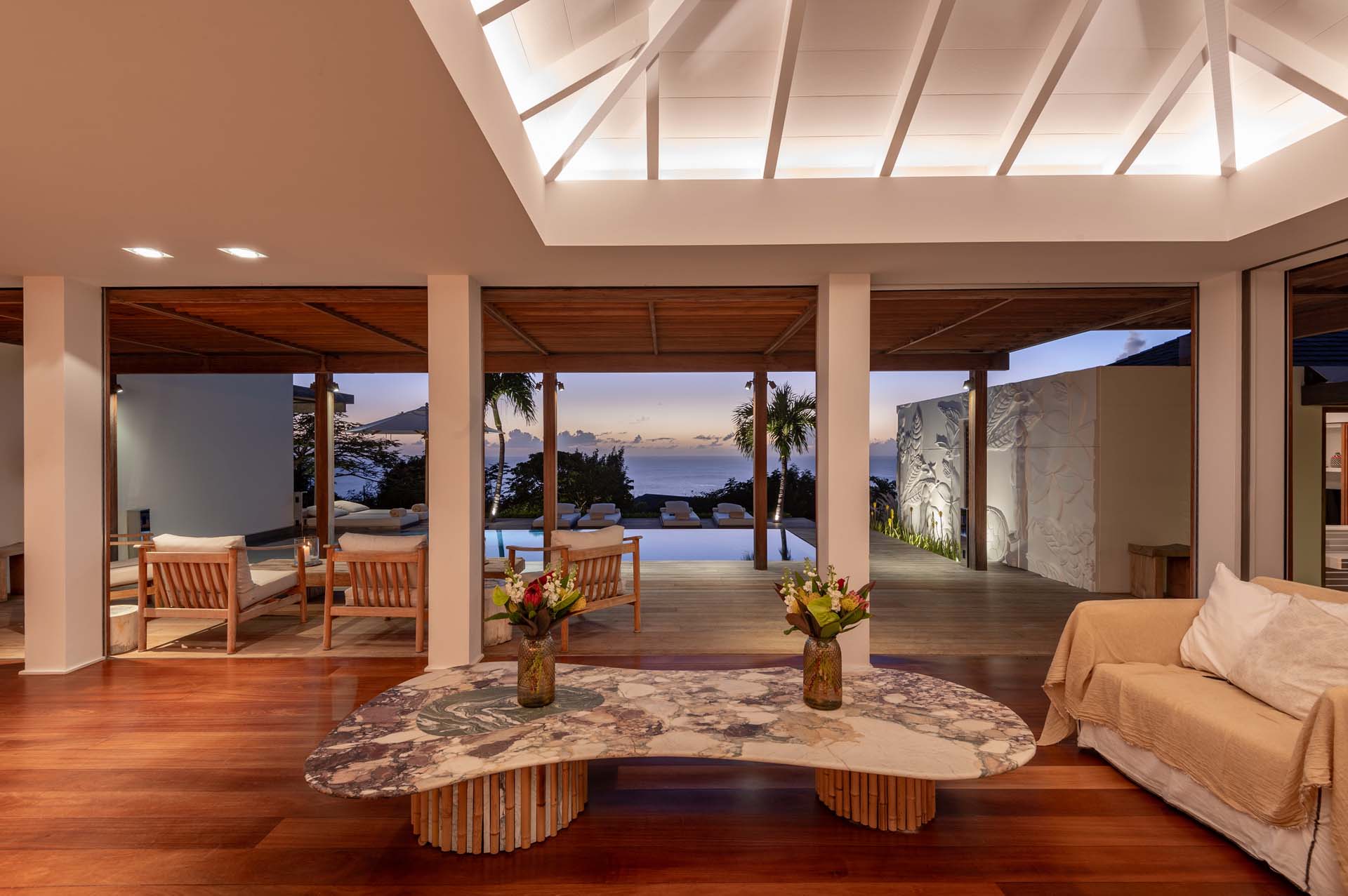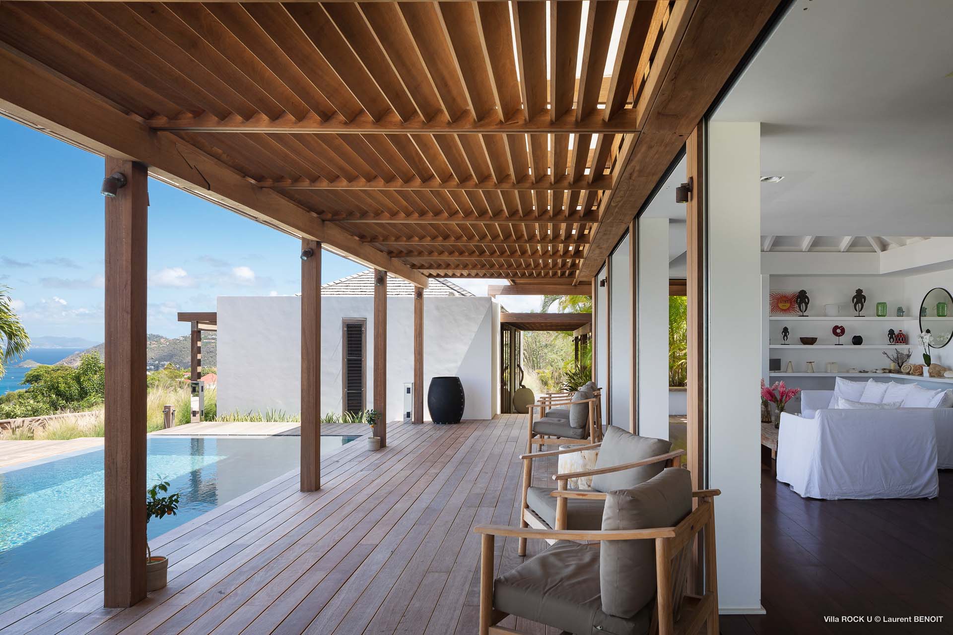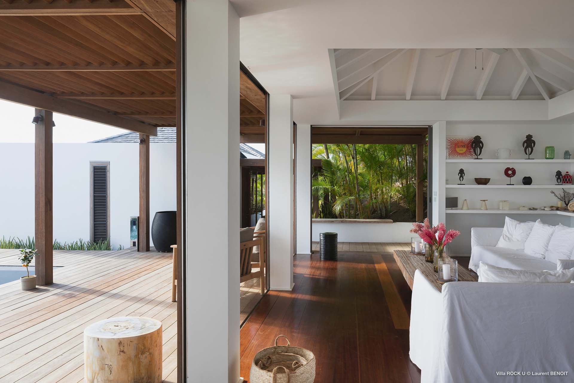 – Le salon ouvert sur la piscine et le deck ensoleillé,