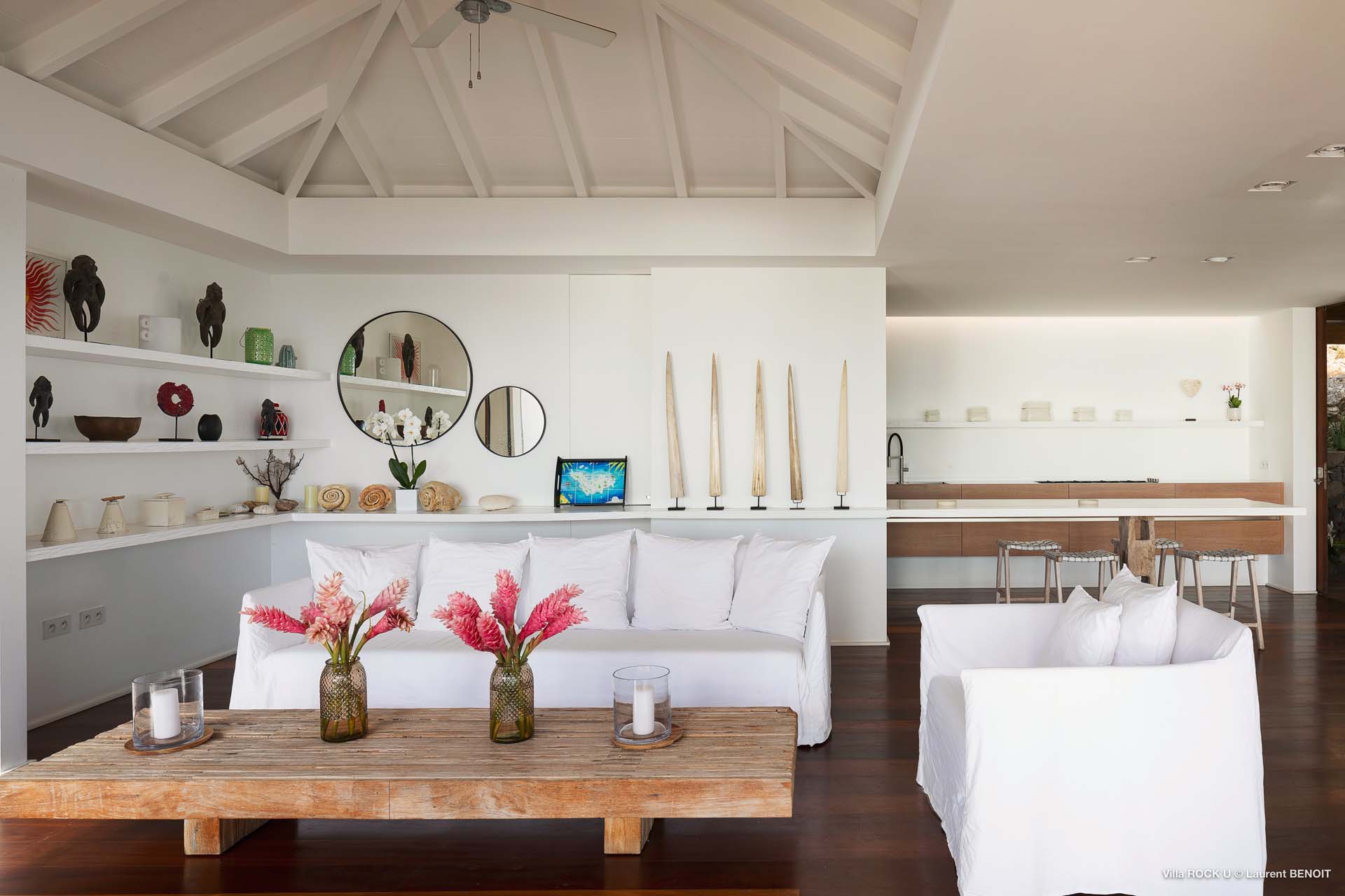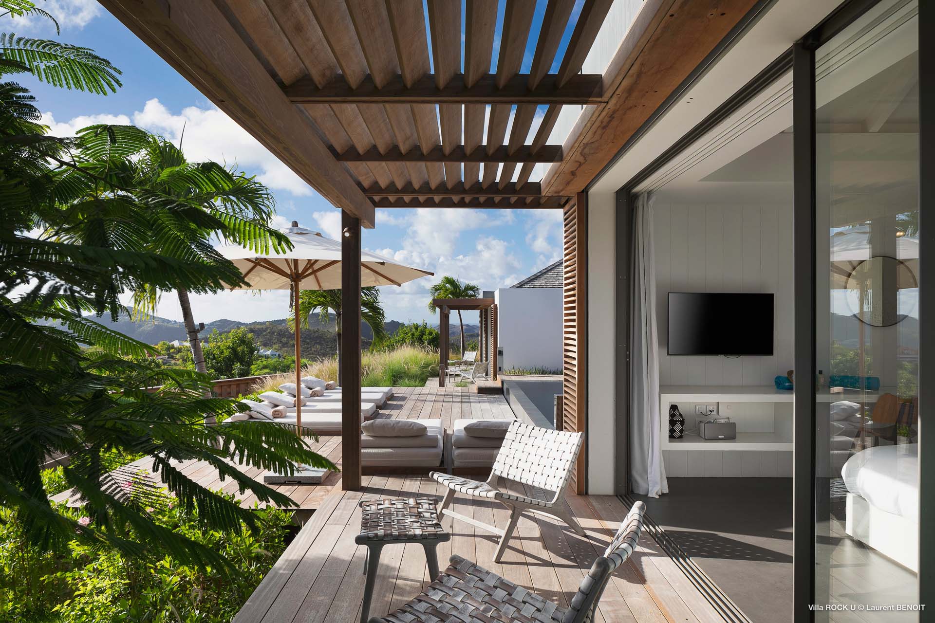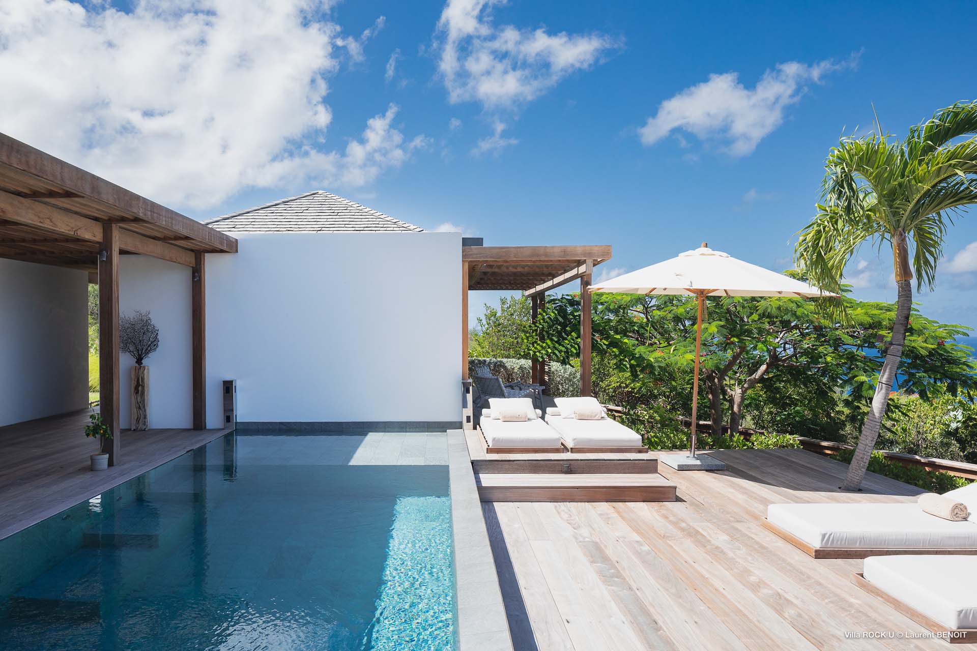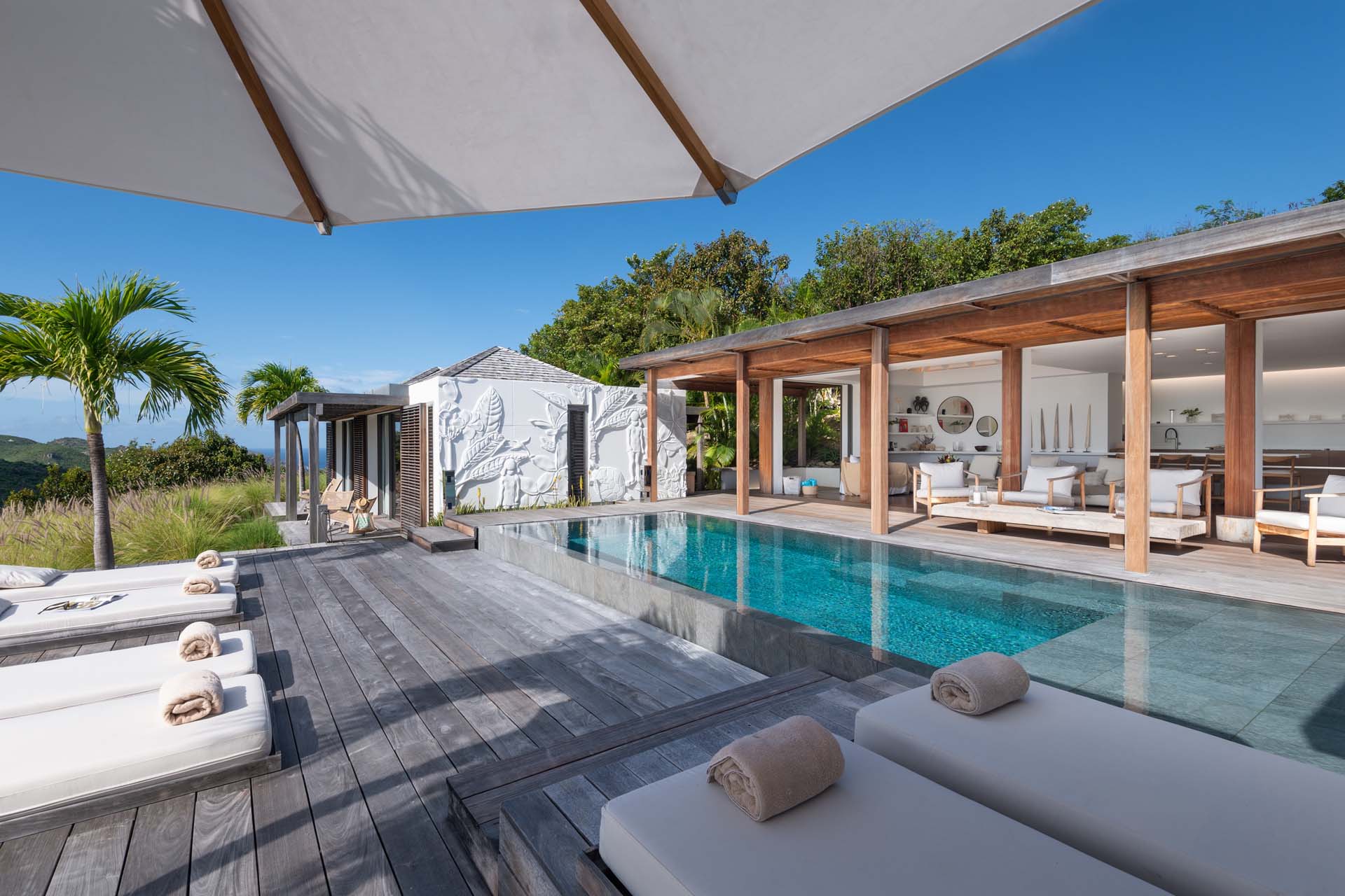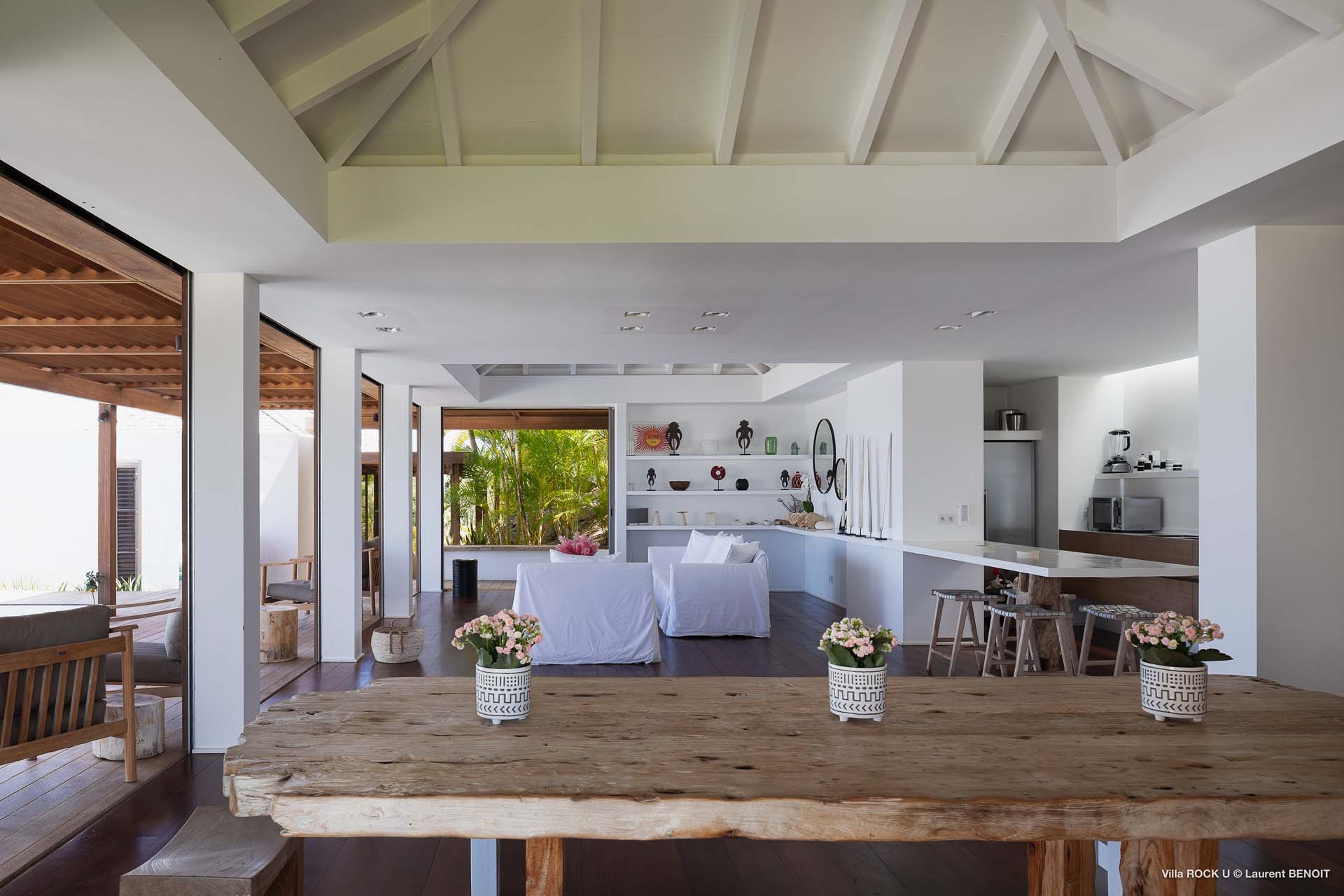 – Le salon ouvert sur la piscine et le deck ensoleillé,