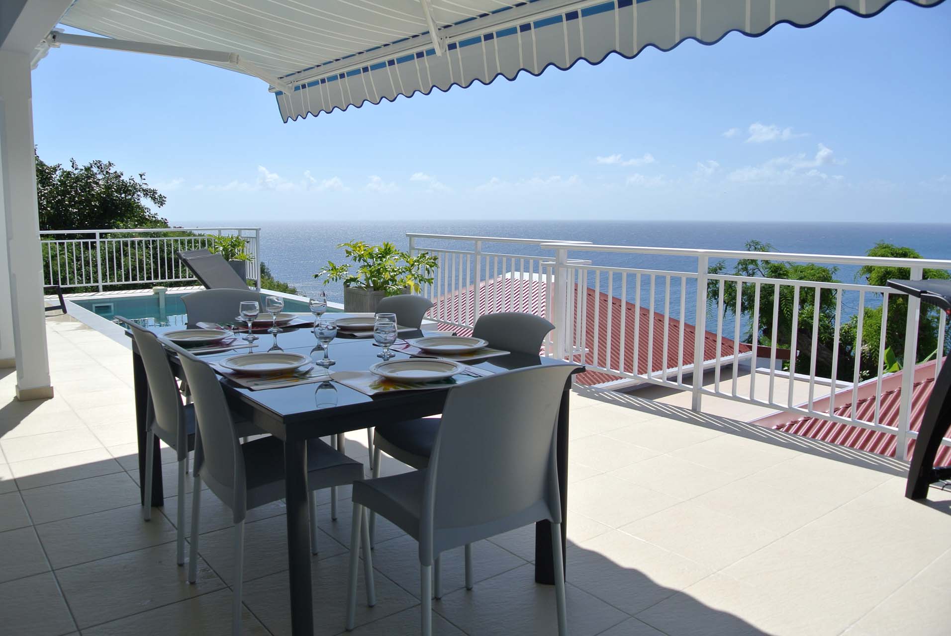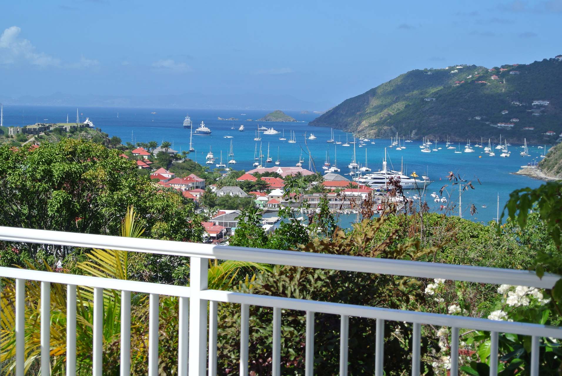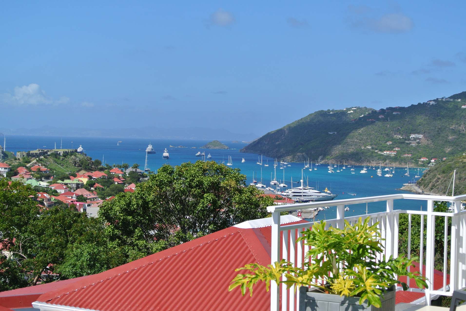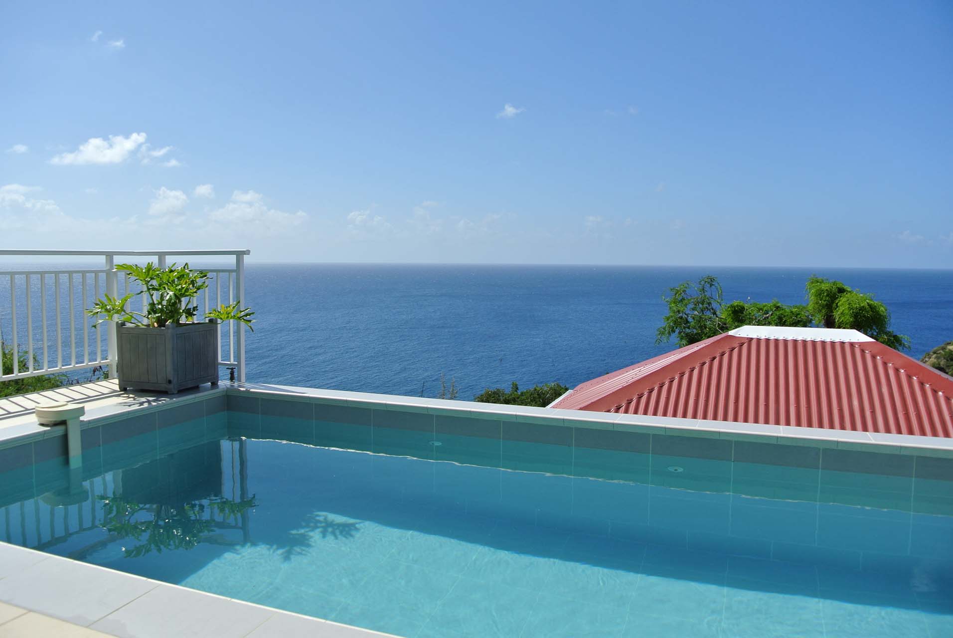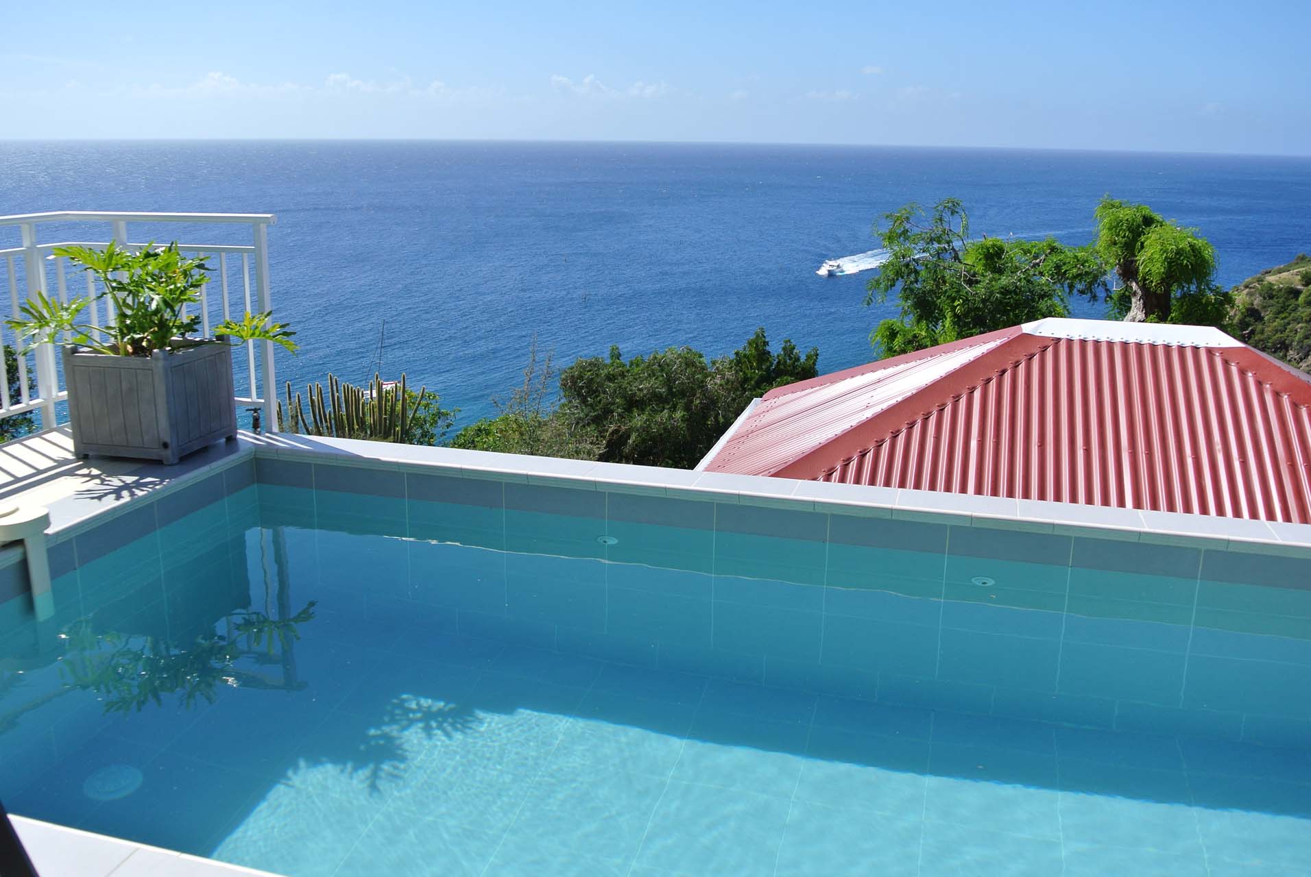Depuis la terrasse et la piscine, la vue est absolument incroyable, l’océan à perte de vue, le port de Gustavia et le soleil couchant.