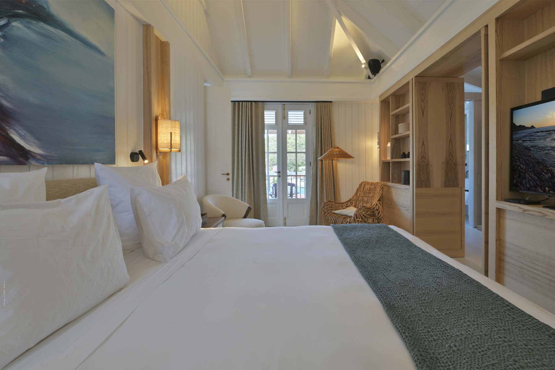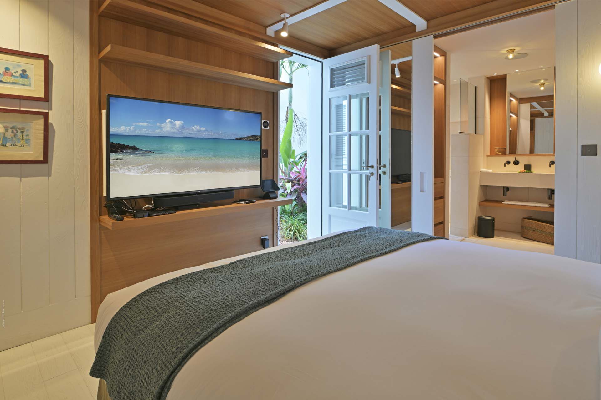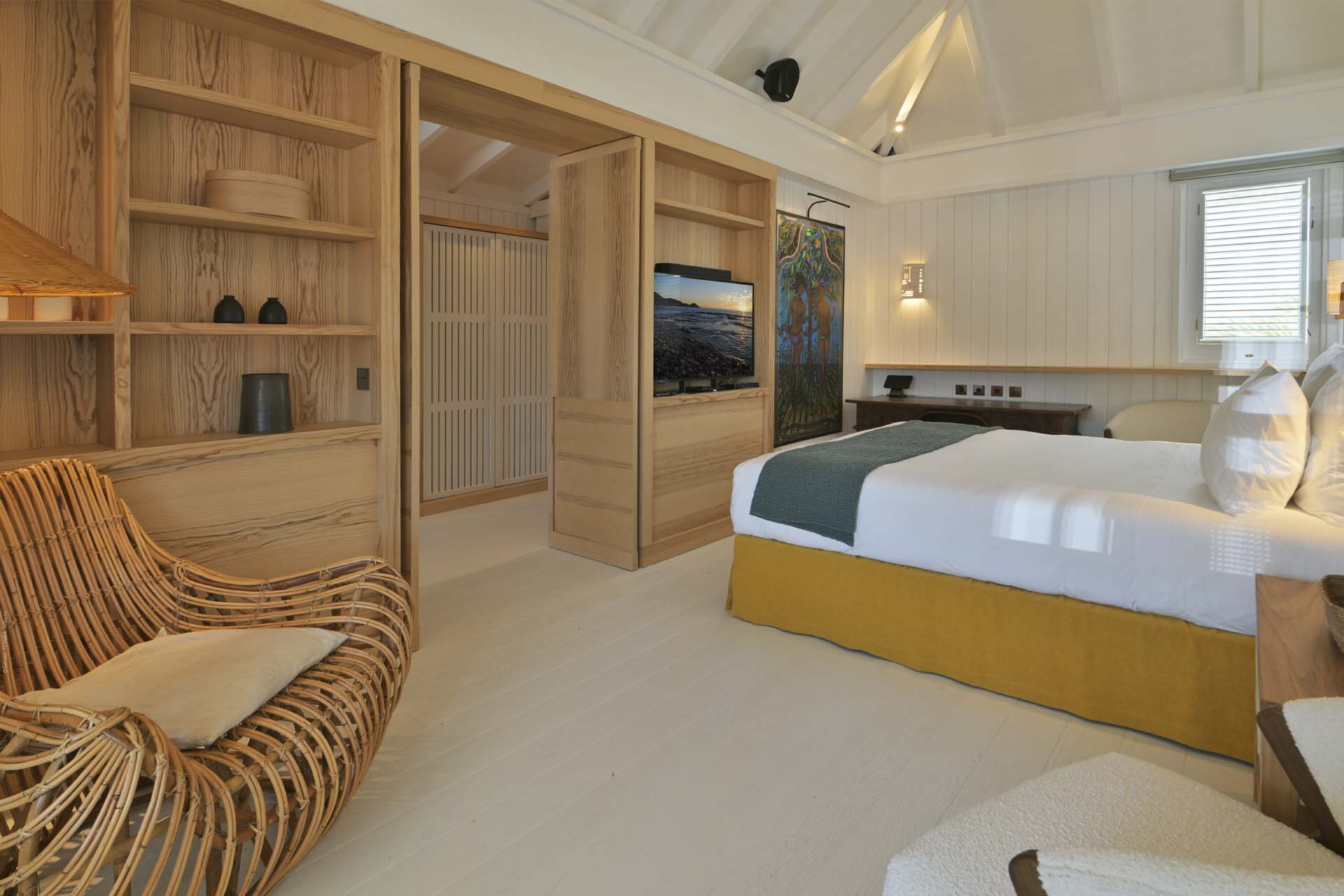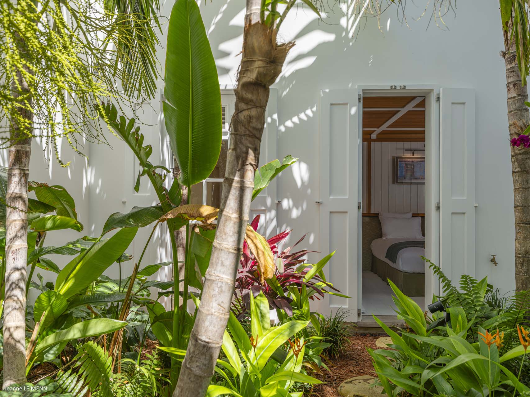 Chacune dispose d’un lit queen-size, d’une salle de bain privative avec douche à l’italienne et toilettes, ainsi que d’équipements haut de gamme : climatisation, dressing, coffre-fort et rideaux occultants. Une d’entre elles offrent une vue imprenable sur la mer, tandis que les trois autres s’ouvrent avec élégance sur la piscine ou le jardin tropical.