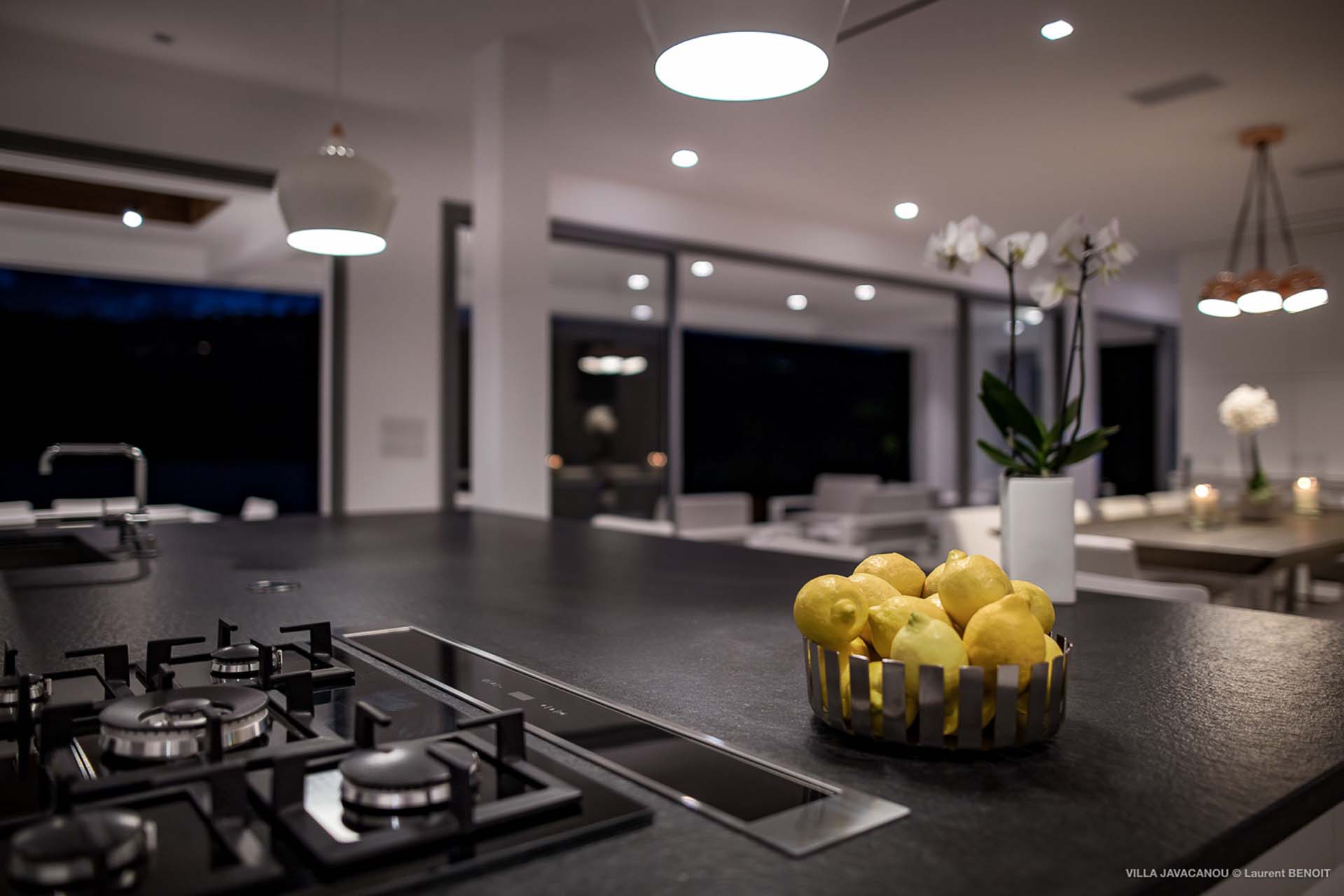 Le salon et la cuisine s’ouvrent sur le magnifique espace extérieur.