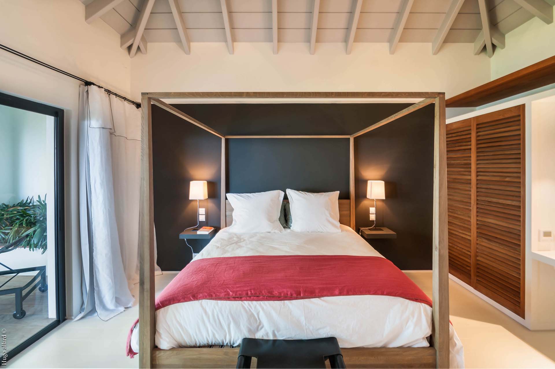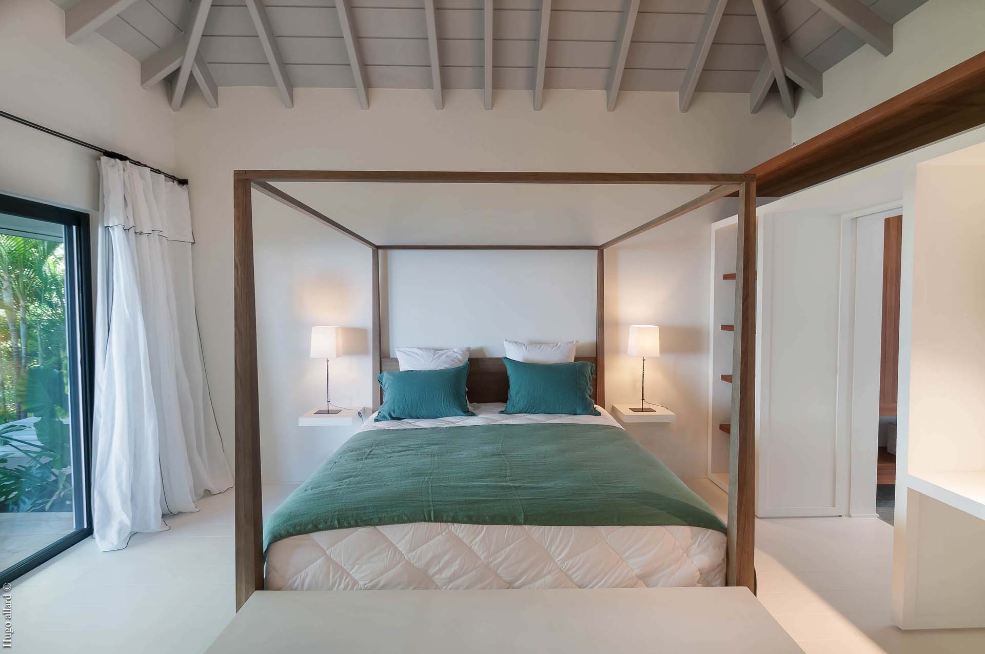 Construite sur deux niveaux, vous trouverez au niveau supérieur la chambre principale et au niveau inférieur, celui de la piscine, le salon climatisé, la cuisine et deux chambres avec un accès par la terrasse. La quatrième chambre se situe dans un bungalow privé accessible par la terrasse. Elle possède une douche intérieure et une douche extérieure.