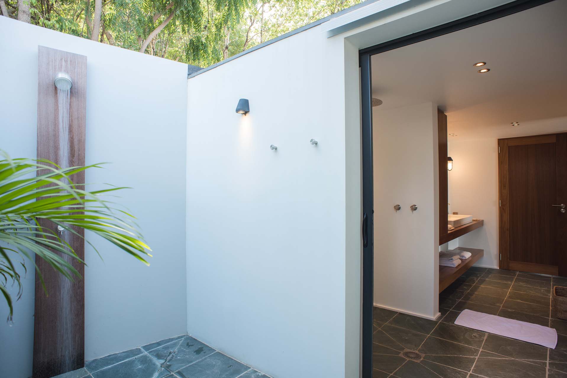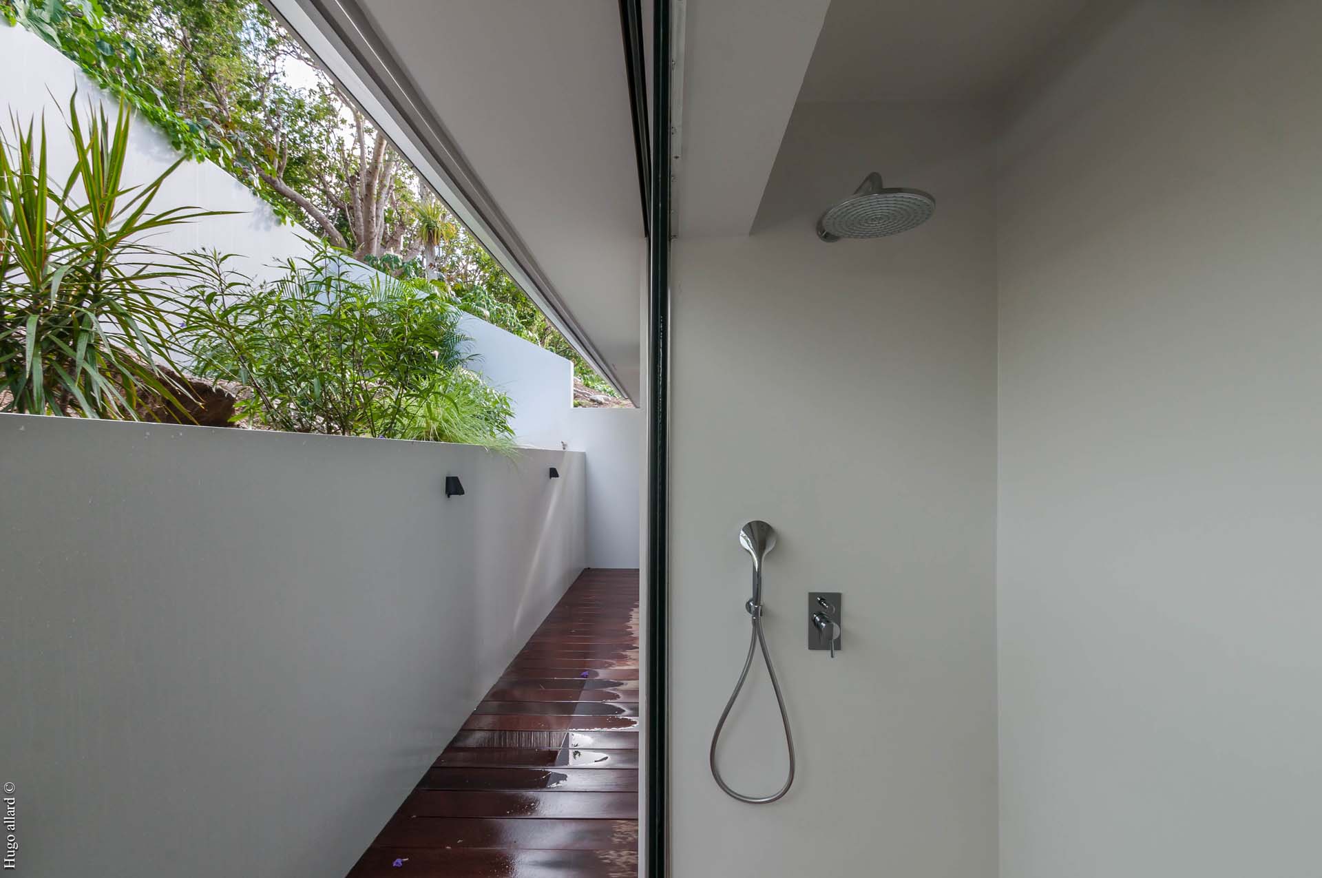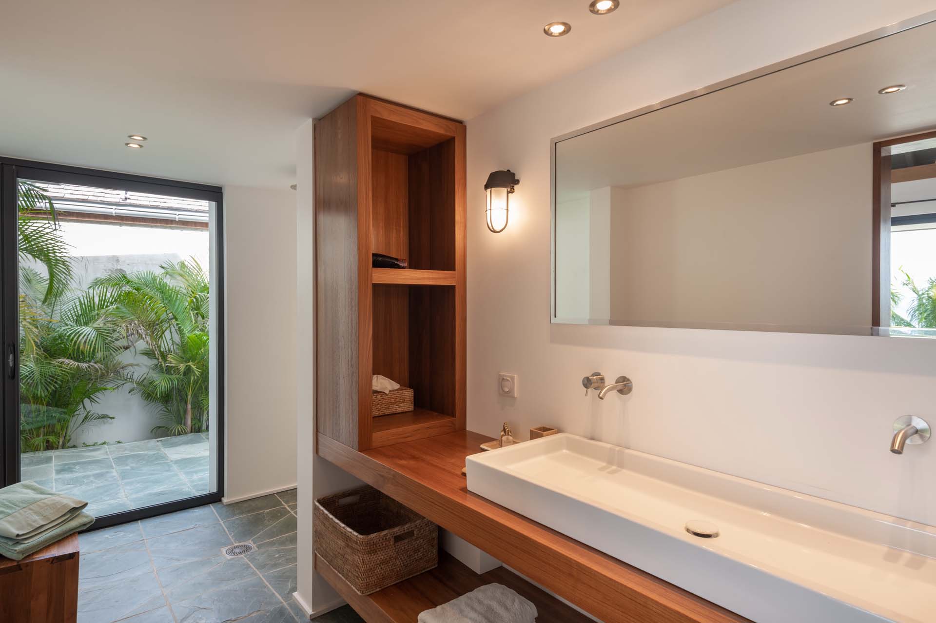 Construite sur deux niveaux, vous trouverez au niveau supérieur la chambre principale et au niveau inférieur, celui de la piscine, le salon climatisé, la cuisine et deux chambres avec un accès par la terrasse. La quatrième chambre se situe dans un bungalow privé accessible par la terrasse. Elle possède une douche intérieure et une douche extérieure.