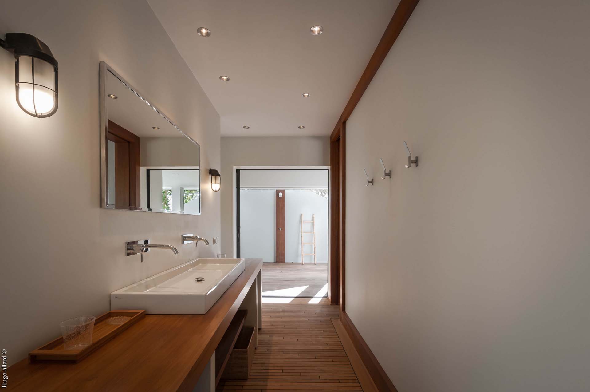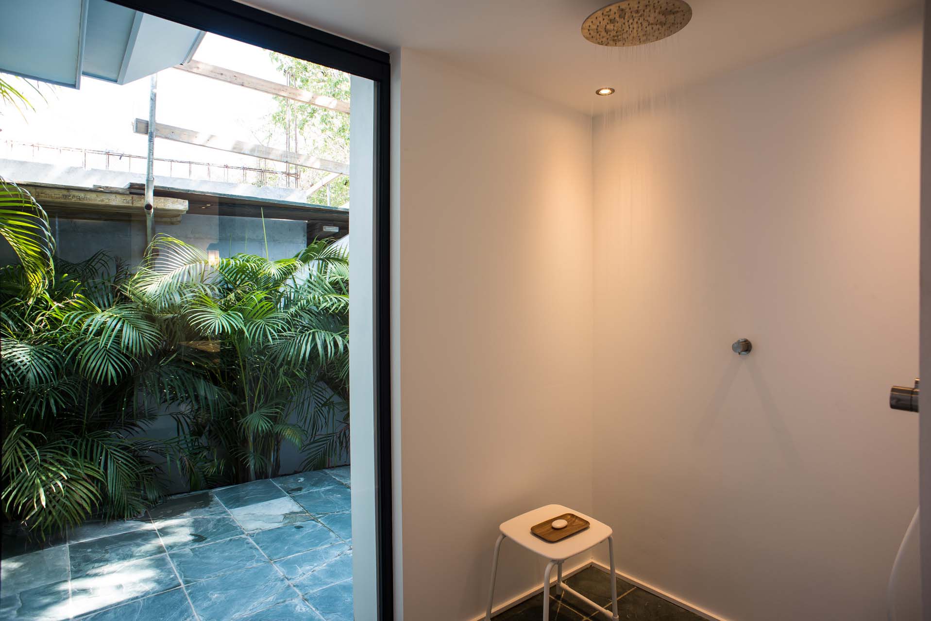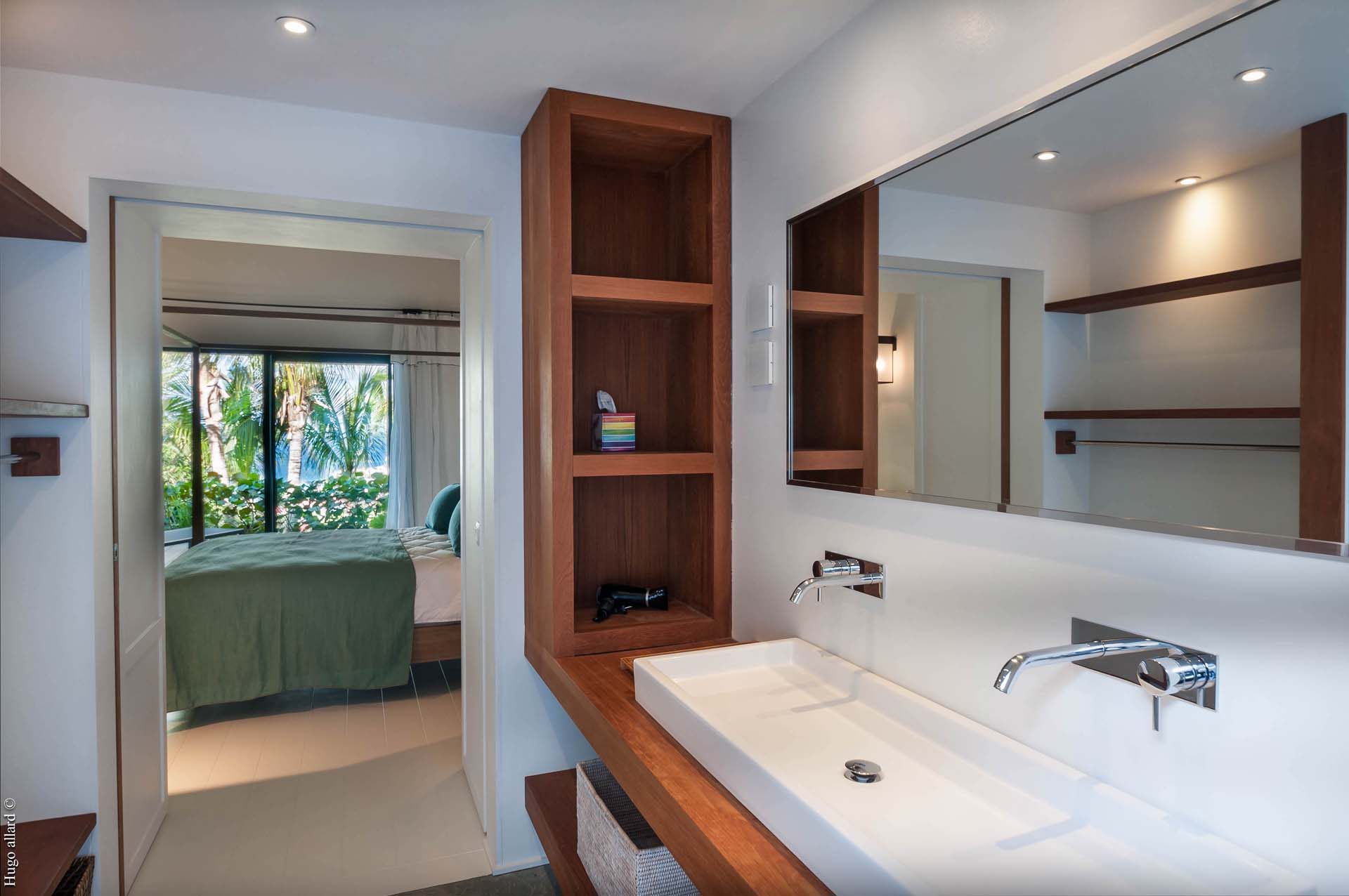 Construite sur deux niveaux, vous trouverez au niveau supérieur la chambre principale et au niveau inférieur, celui de la piscine, le salon climatisé, la cuisine et deux chambres avec un accès par la terrasse. La quatrième chambre se situe dans un bungalow privé accessible par la terrasse. Elle possède une douche intérieure et une douche extérieure.