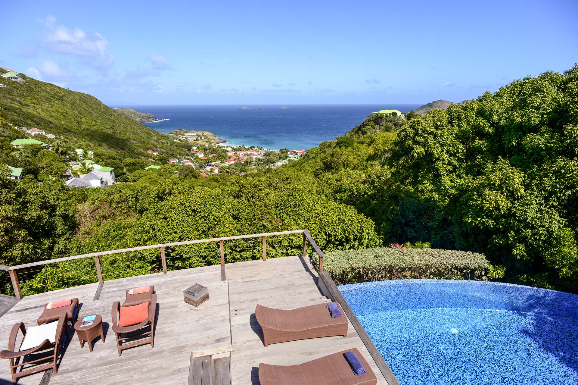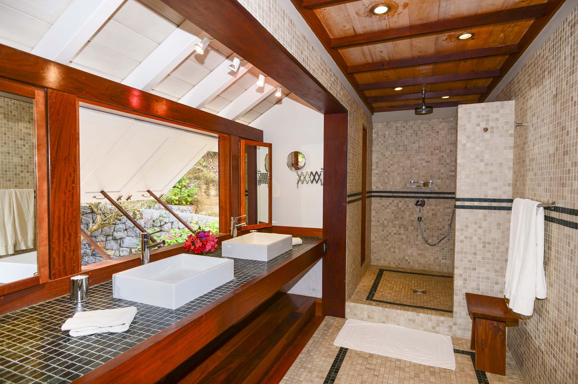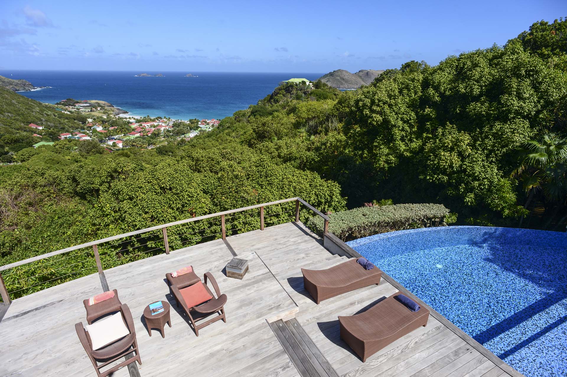 Deux des chambres sont à l’étage supérieur. Elles s’ouvrent sur deux terrasses avec chacune un solarium privé dominant l’océan.