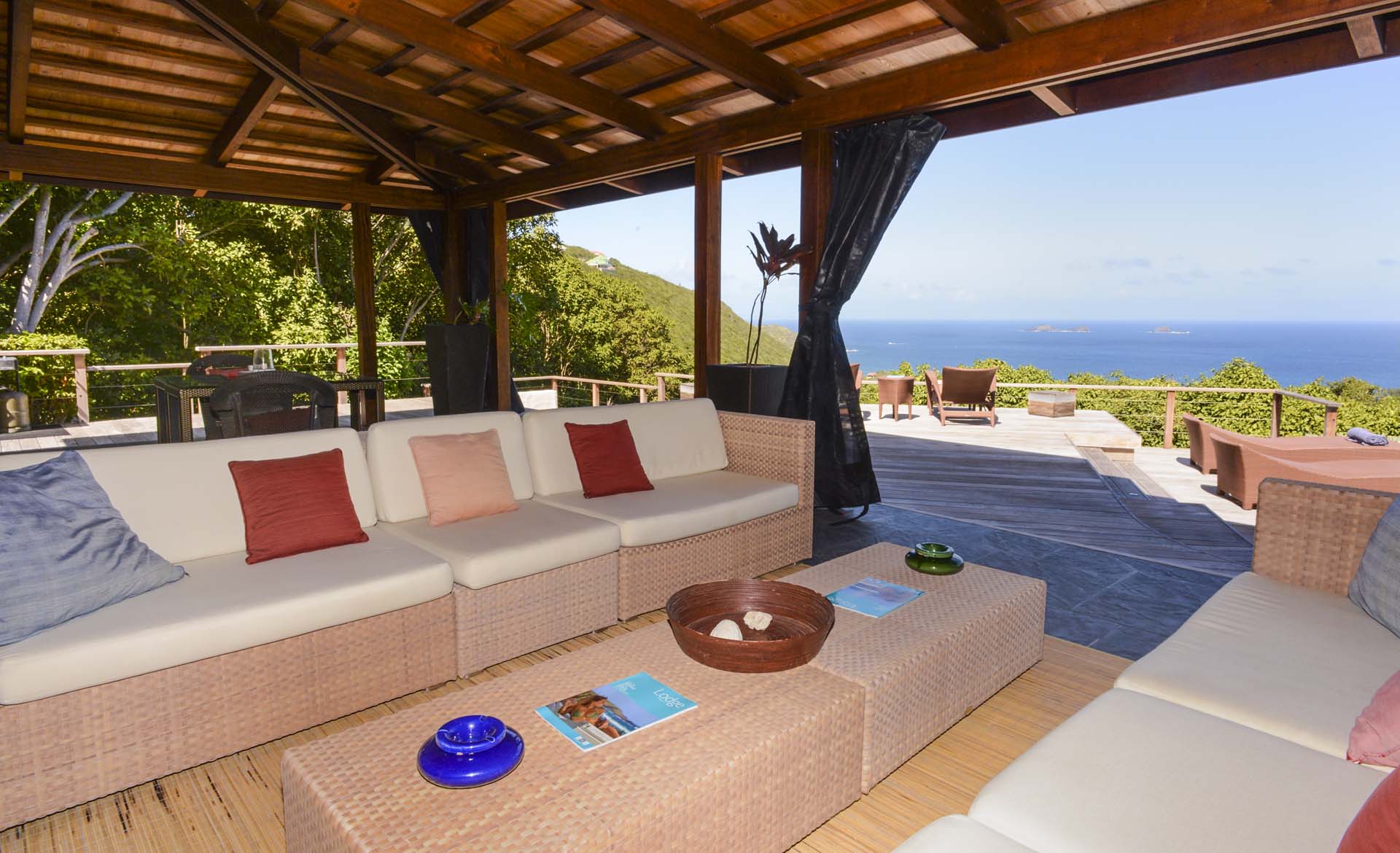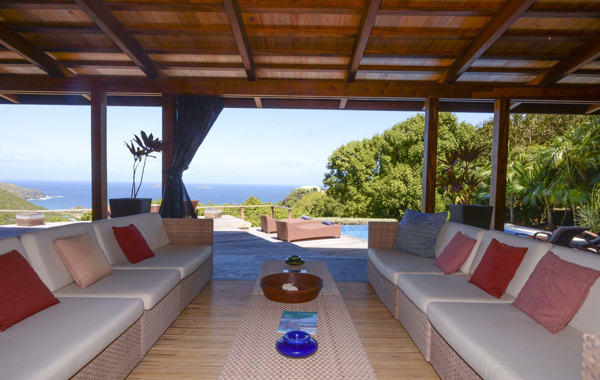 L’espace extérieur avec une grande terrasse couverte, un salon, une table pour déjeuner et une cuisine est extrêmement agréable.