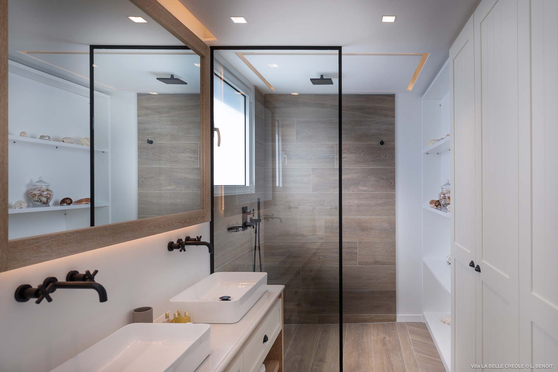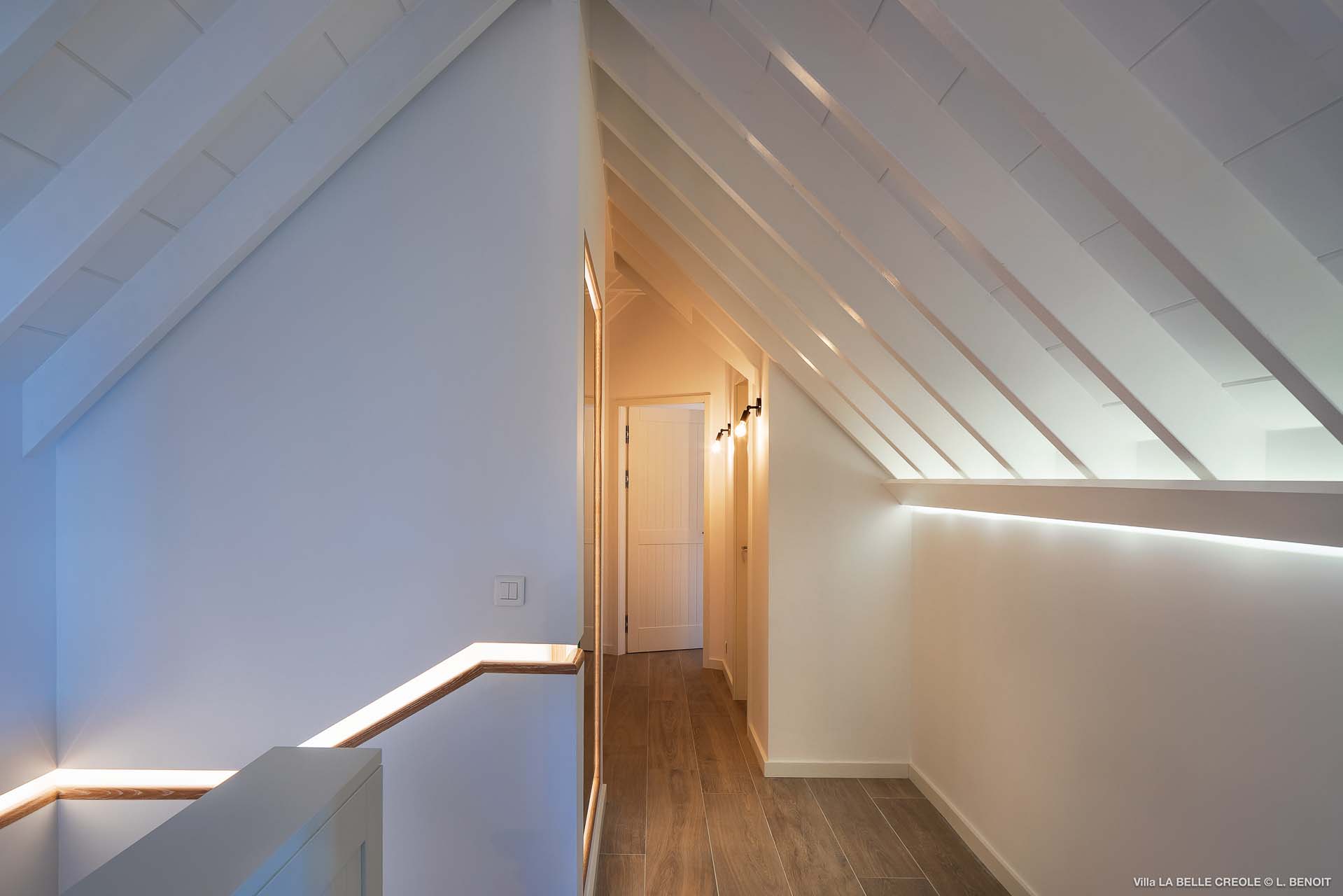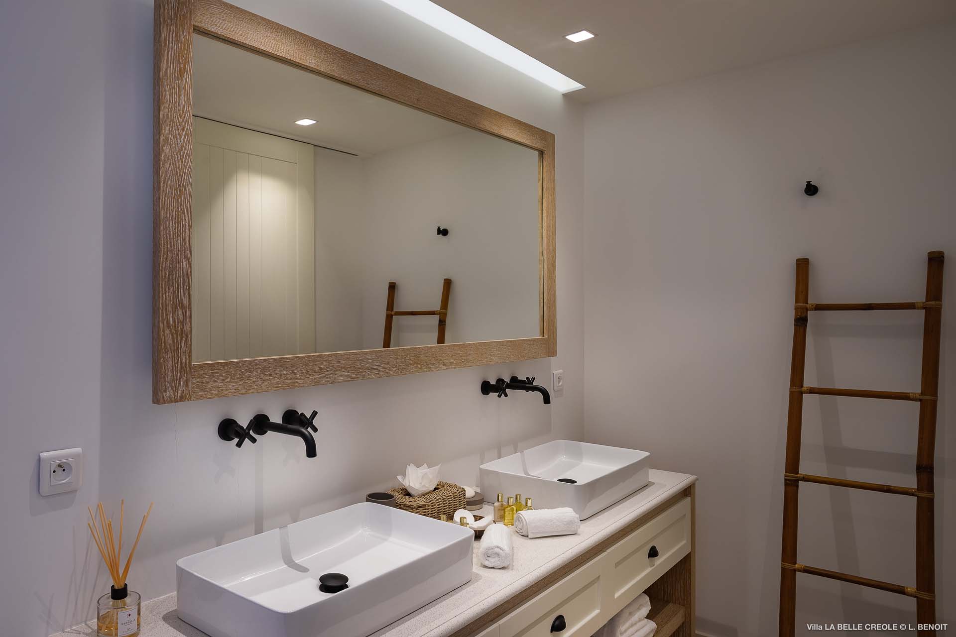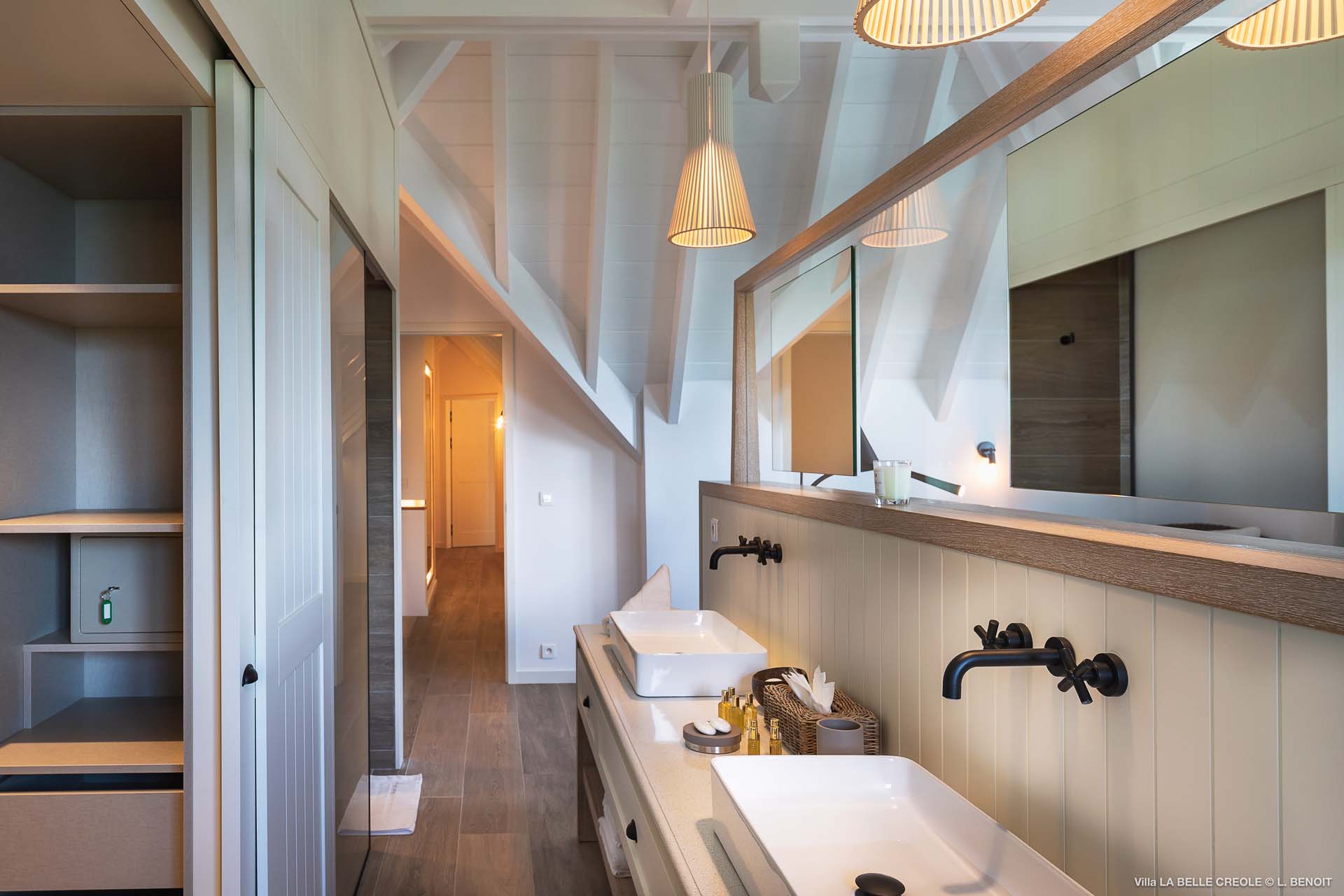 La décoration intérieure de La Belle Créole mêle harmonieusement des éléments de beauté naturelle et de charme colonial. Les riches planchers en bois se mêlent aux carreaux rustiques en terre cuite, et les élégants meubles coloniaux blancs. Des canapés d’un blanc éclatant ponctuent l’espace, s’harmonisant avec la lueur du plafond blanc, évoquant une ambiance à la fois caribéenne et coloniale.