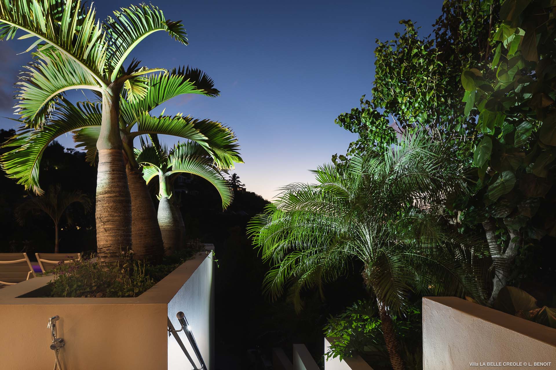 Au niveau inférieur de ce sanctuaire, une piscine entourée d’une terrasse offre une vue panoramique sur les collines et l’océan, invitant à se prélasser sous la chaleur du soleil des Caraïbes.