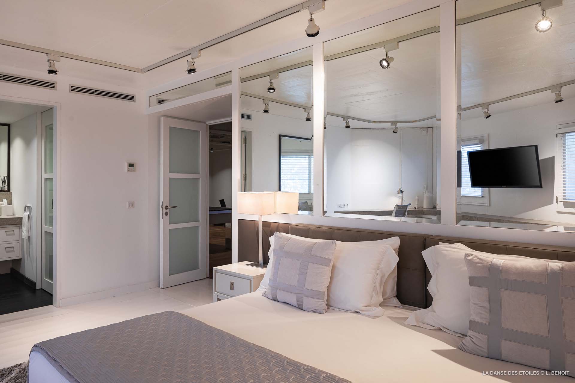 La villa est composée de cinq chambres, dont trois principales situées au niveau du séjour et de la piscine, la master offrant un accès direct à l’espace extérieur et une vue imprenable sur la mer. Deux autres chambres se trouvent à l’étage inférieur, accessible depuis la terrasse, où vous trouverez également une salle de fitness, un deuxième salon TV ainsi qu’une salle de massage.