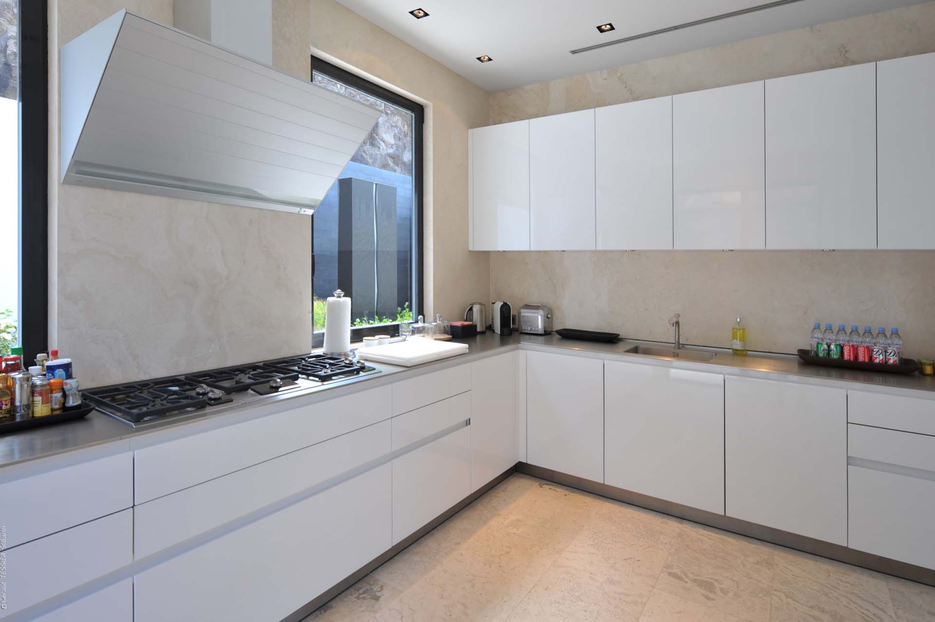 Deux des chambres sont situées au niveau principal, accessibles de part et d’autres de la terrasse. Des escaliers situés de chaque côté de la piscine conduisent au niveau inférieur de la villa. Là, se trouvent trois autres chambres. La quatrième et la cinquième chambre sont communicantes.