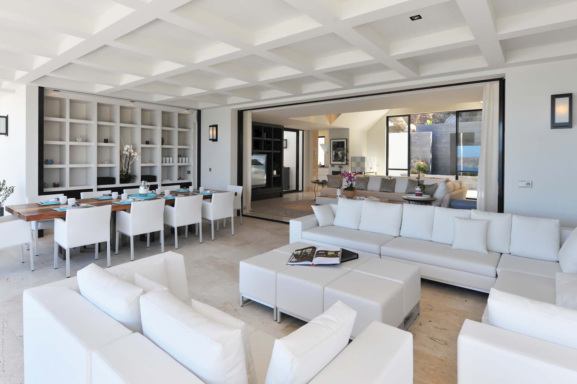 L’espace de vie est composé d’un premier grand salon intérieur ouvert sur la salle à manger extérieure ainsi qu’un second salon extérieur.