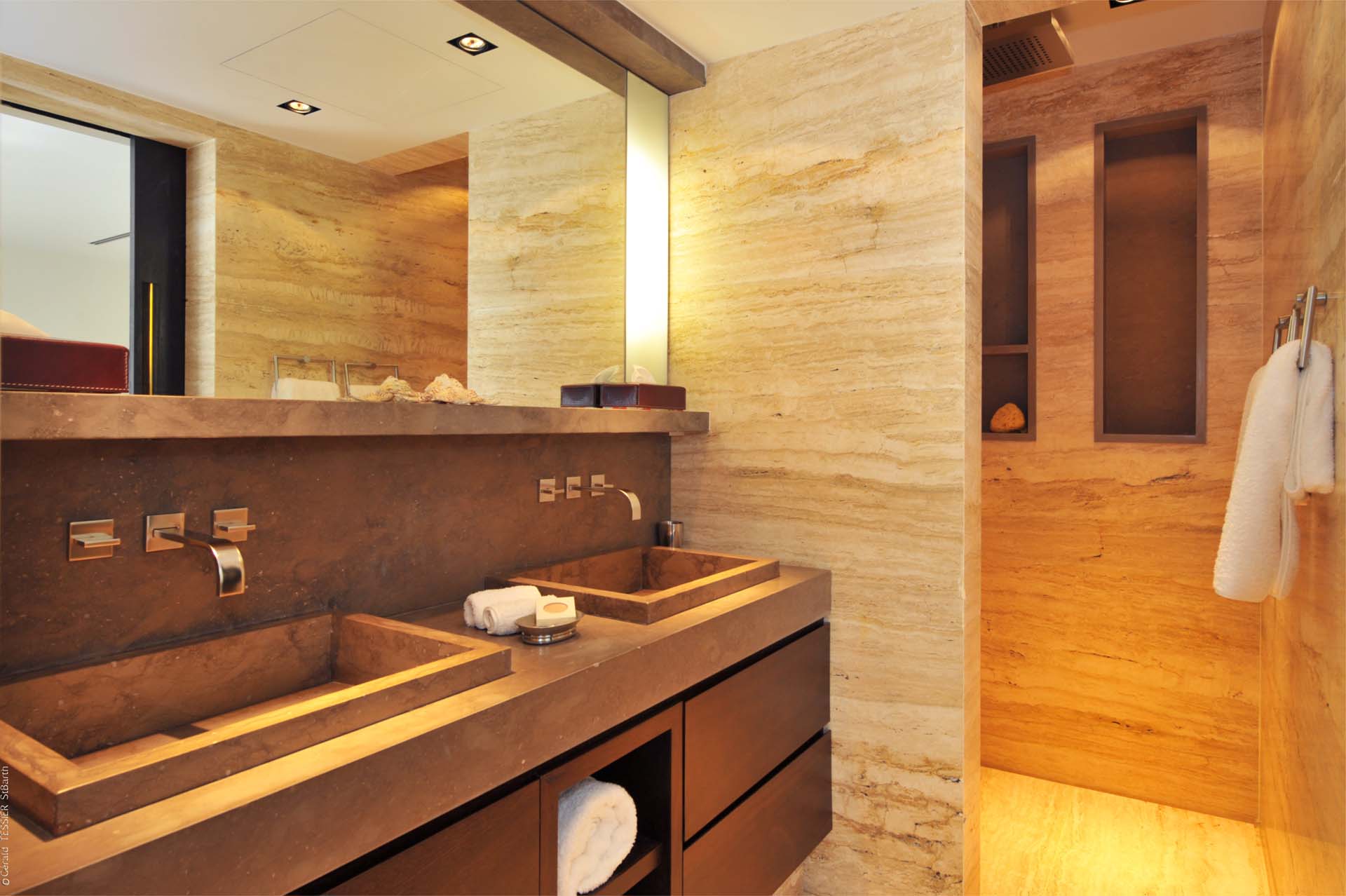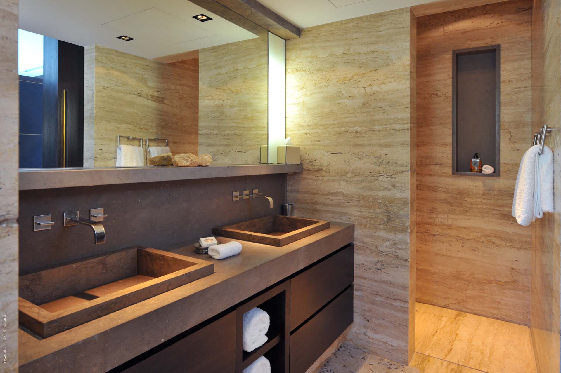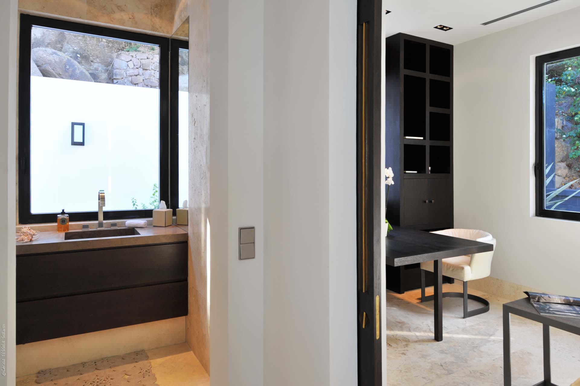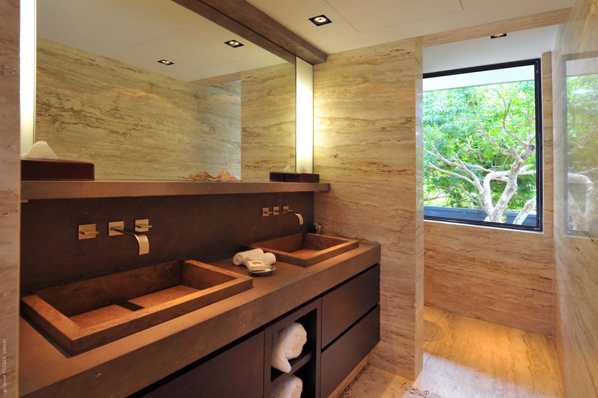 Deux des chambres sont situées au niveau principal, accessibles de part et d’autres de la terrasse. Des escaliers situés de chaque côté de la piscine conduisent au niveau inférieur de la villa. Là, se trouvent trois autres chambres. La quatrième et la cinquième chambre sont communicantes.