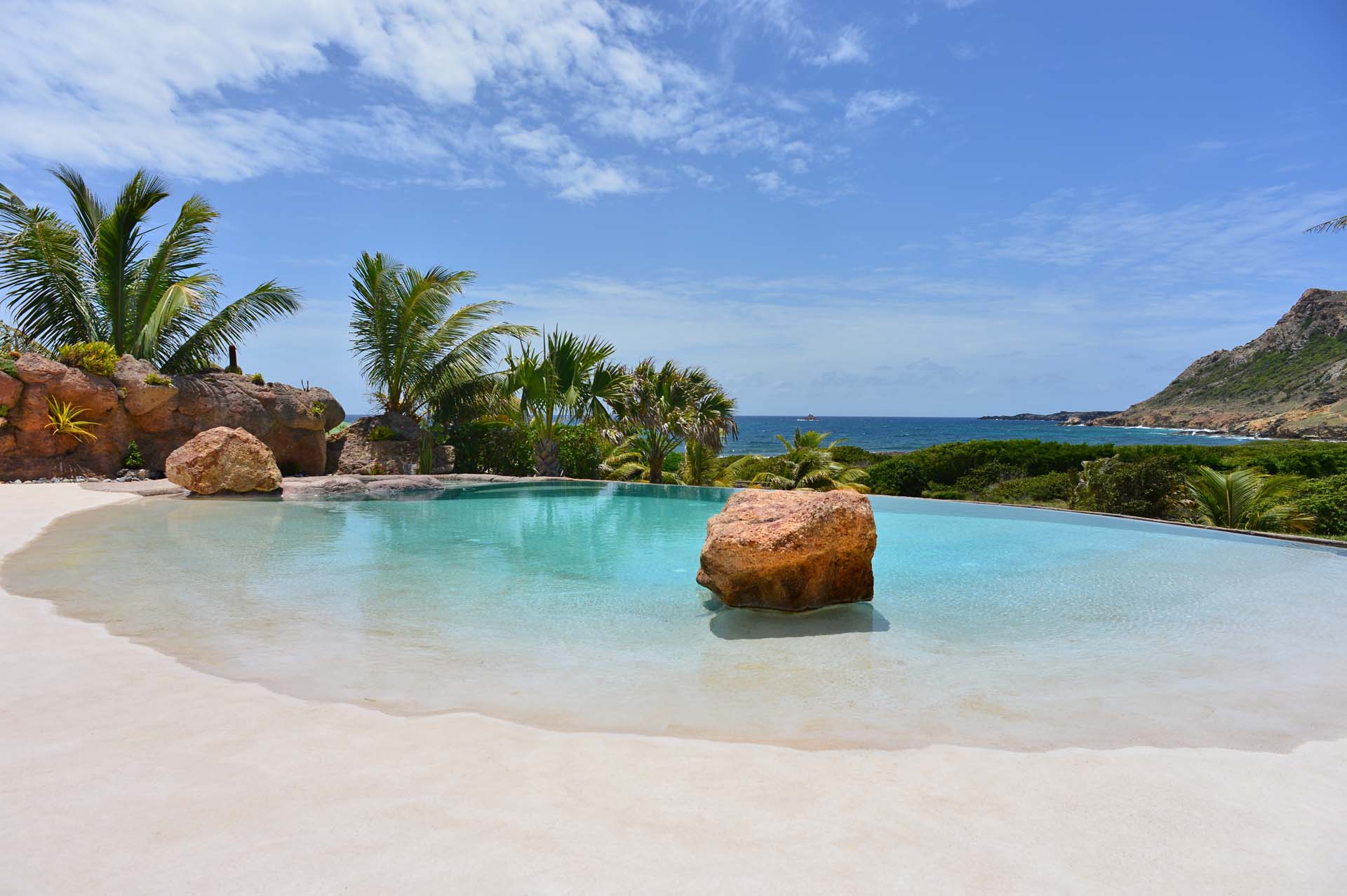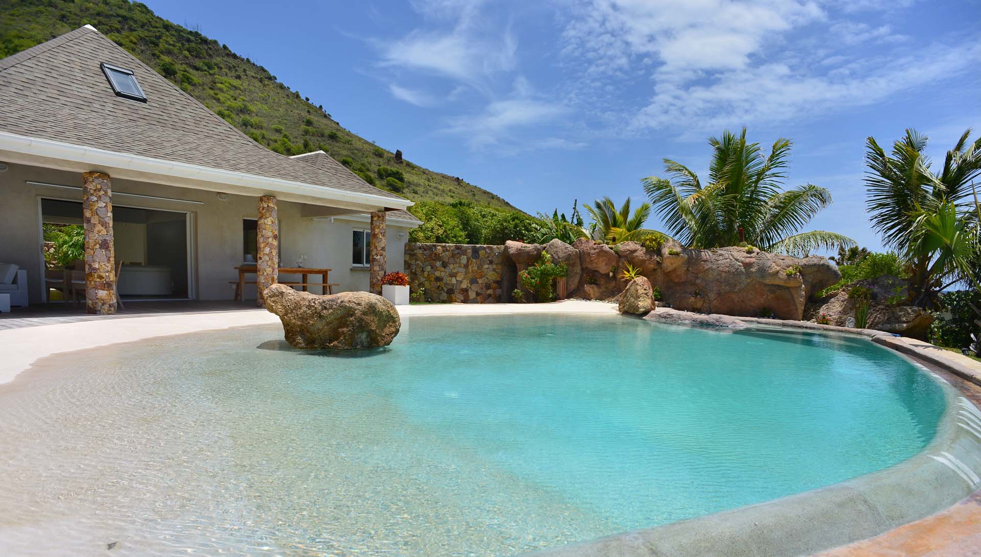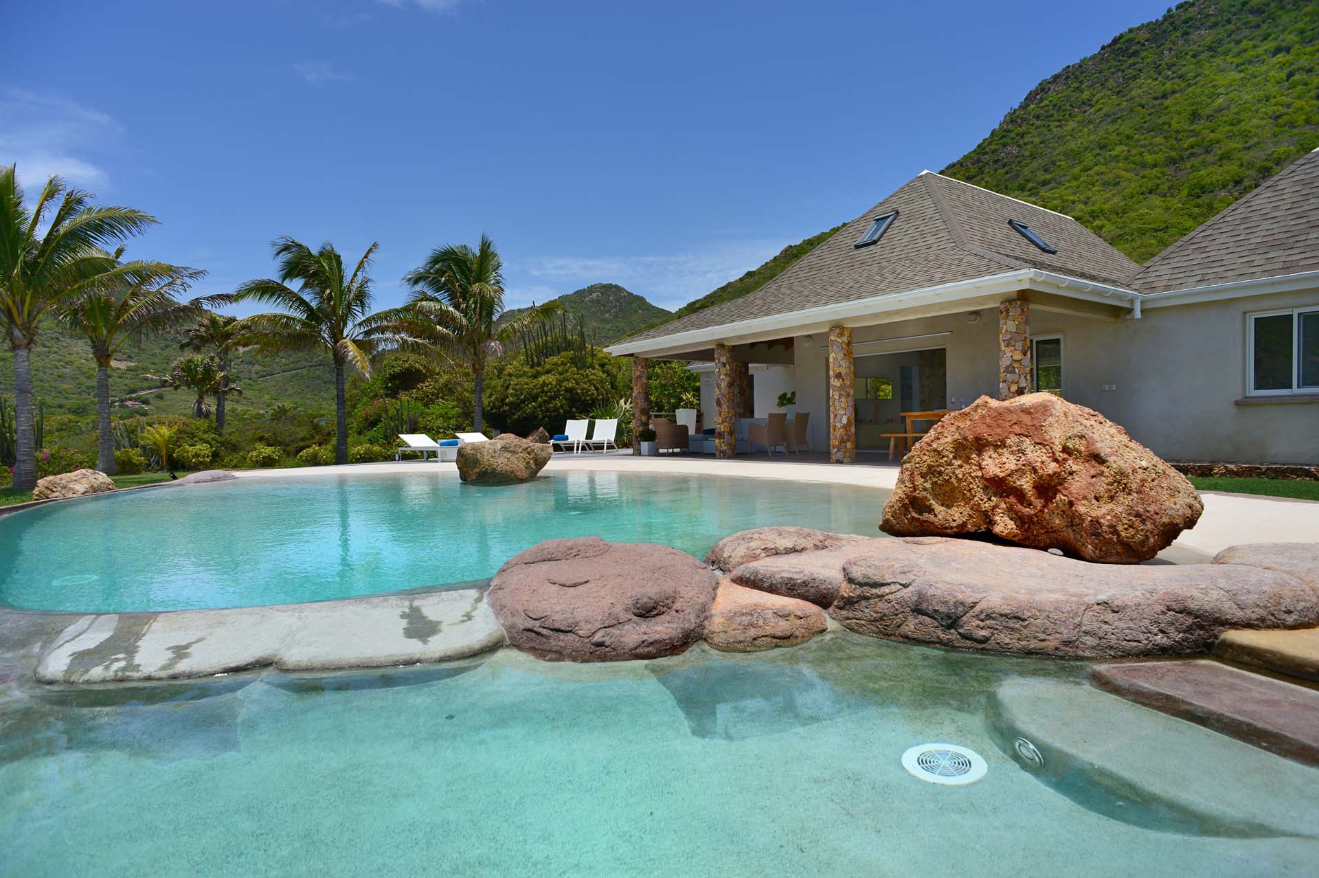 La terrasse enchante par son décor idyllique : une piscine chauffée évoquant un bassin naturel se fond harmonieusement dans un jardin luxuriant. Des transats, un espace repas en plein air et un salon ombragé promettent des instants de détente absolue sous le soleil de Saint-Barth.