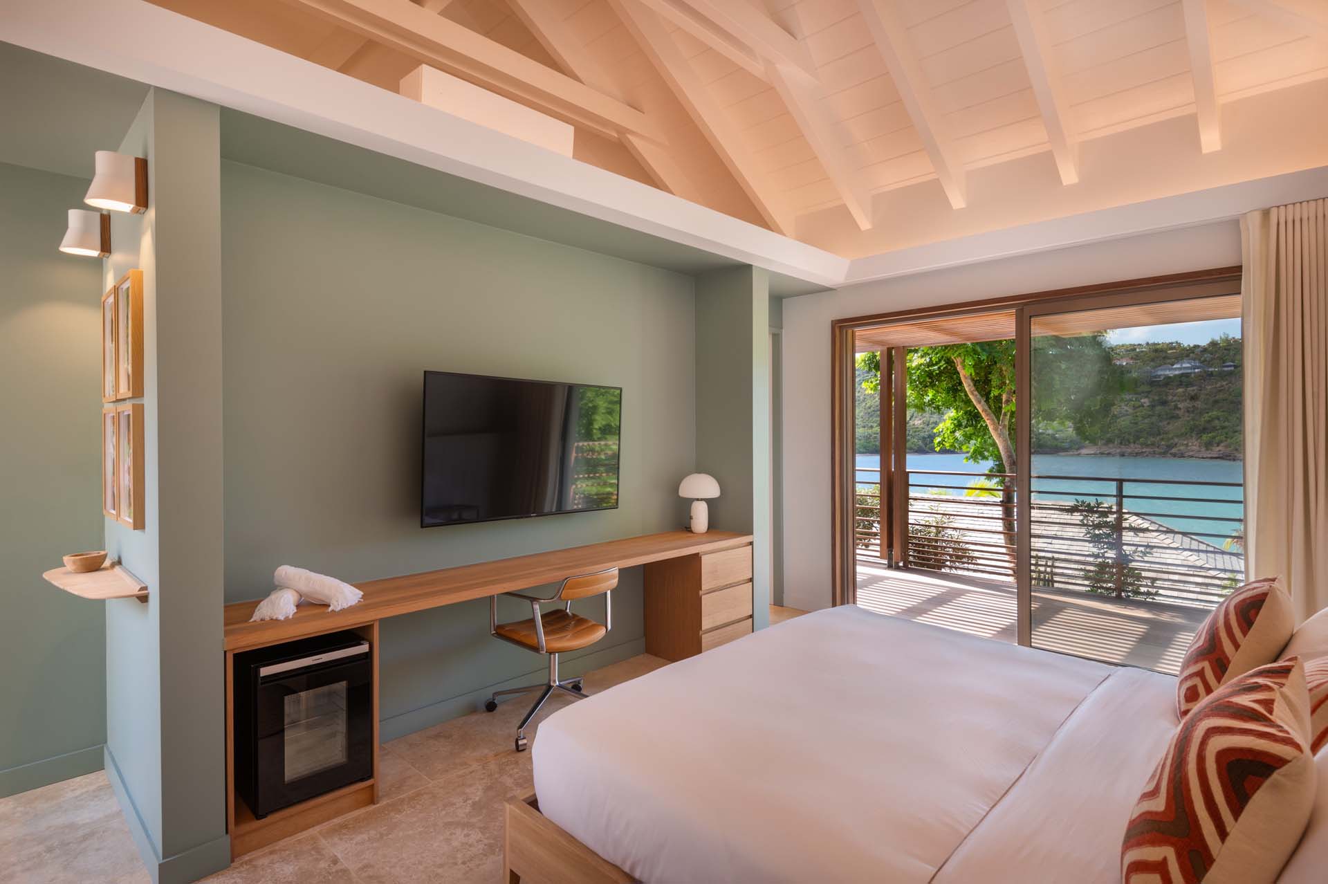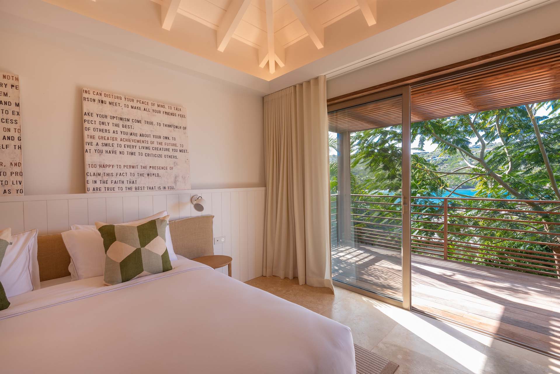 Côté nuit, la villa Linda dispose de cinq chambres climatisées, toutes avec salles de bains privatives et télévision. La suite parentale, située au cœur de la villa, s’ouvre directement sur la terrasse et dispose d’une douche extérieure entourée de plantes tropicales. Les quatre autres suites, réparties dans des bungalows indépendants, disposent chacune d’un balcon privé avec vue imprenable sur la baie. La décoration y est joyeuse et moderne, mêlant teintes naturelles et touches de couleur vives dans un esprit chic et balnéaire.