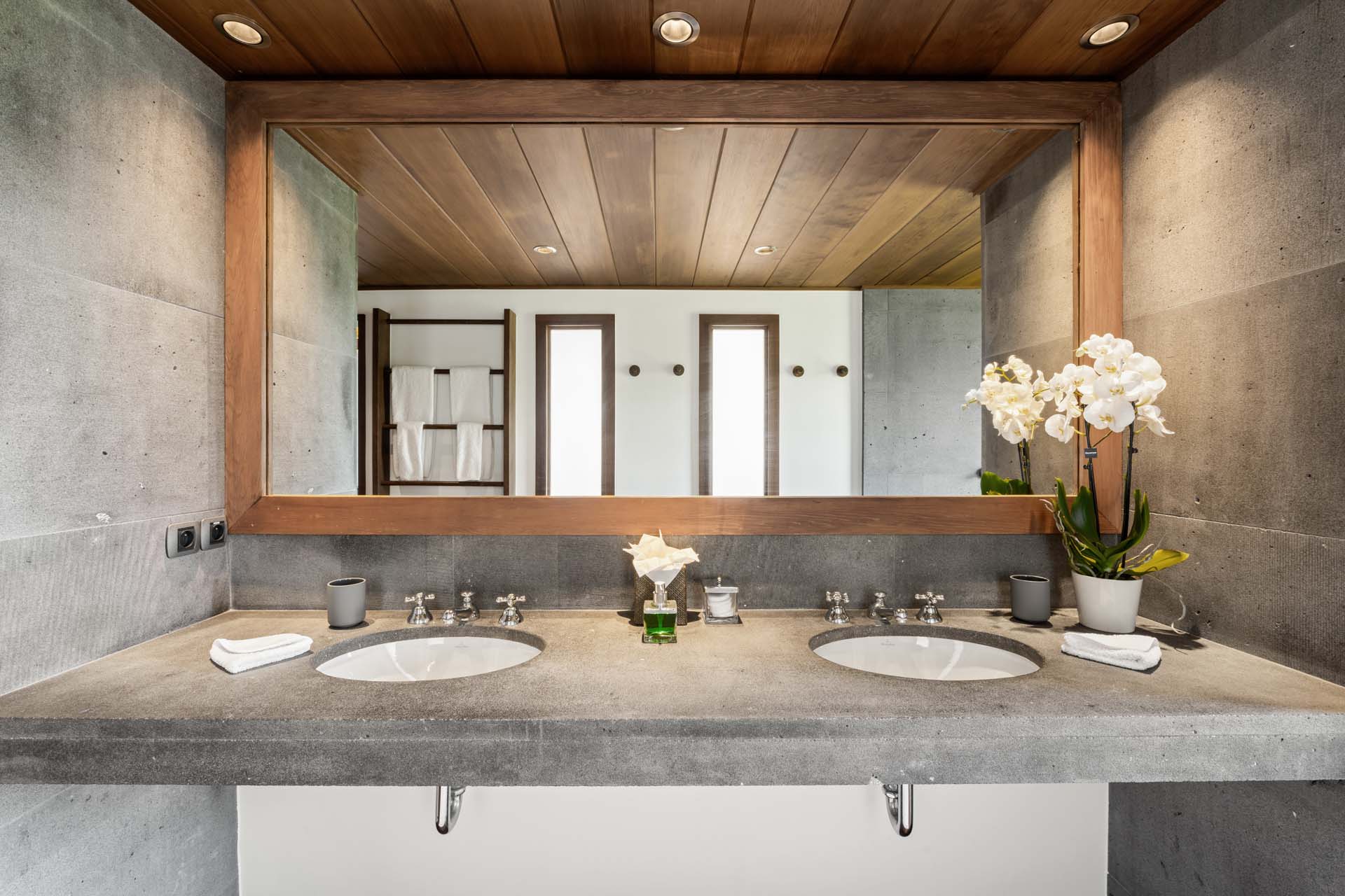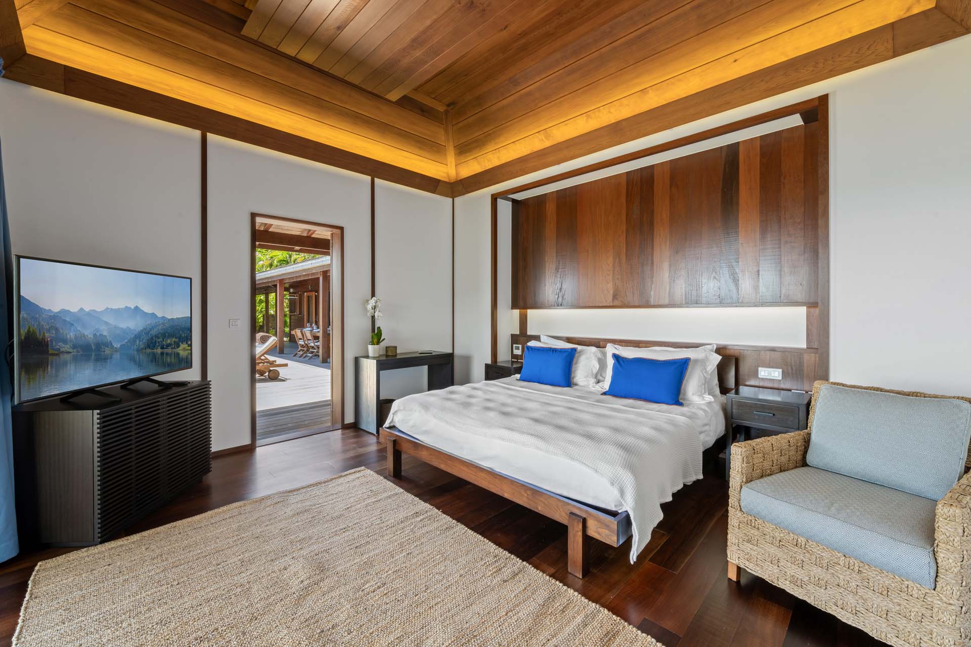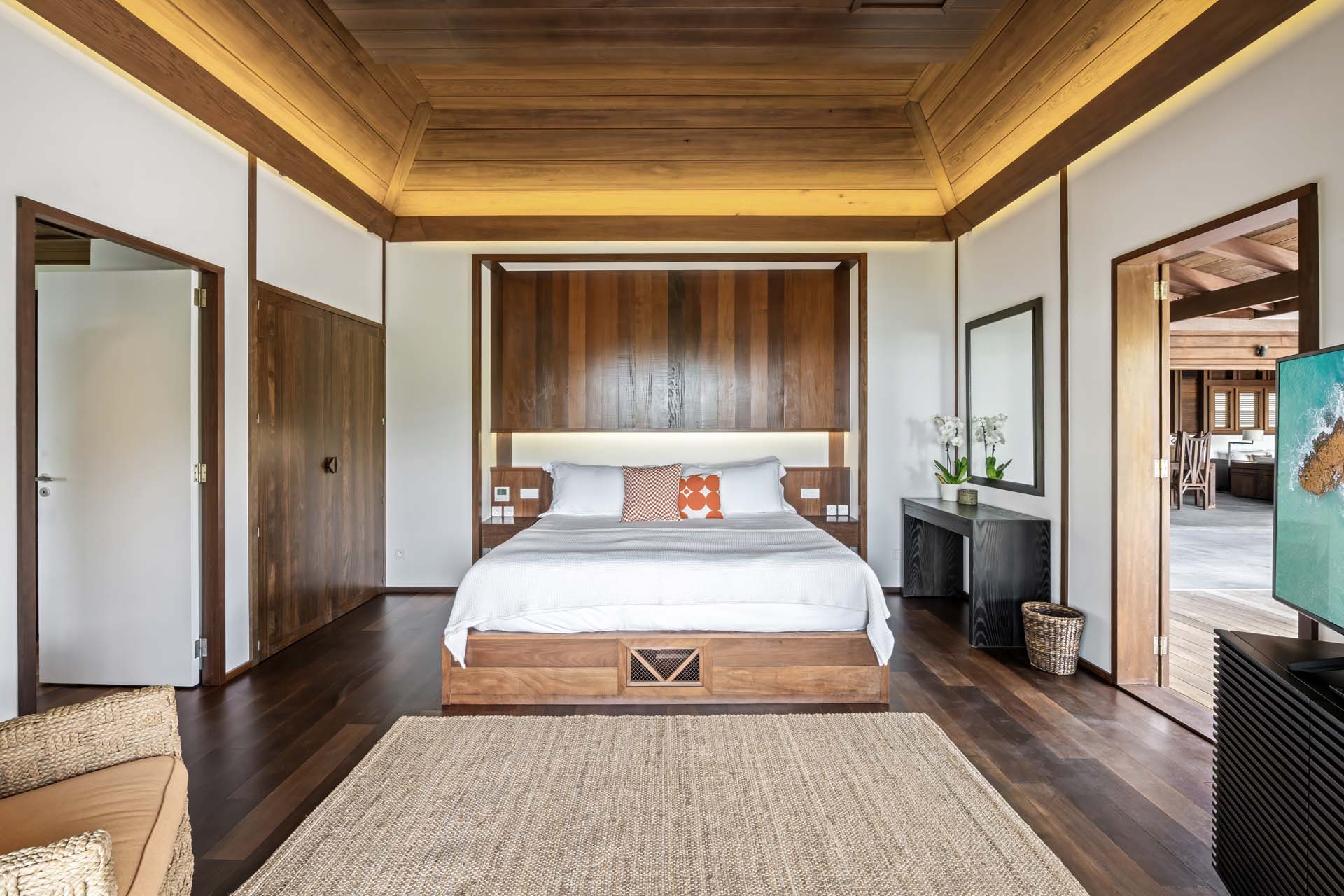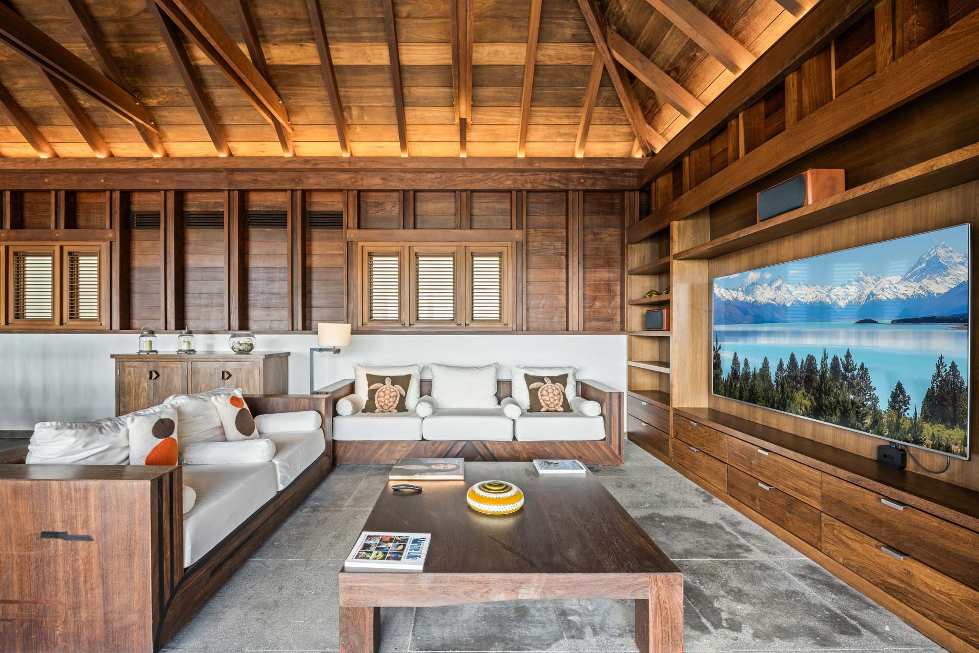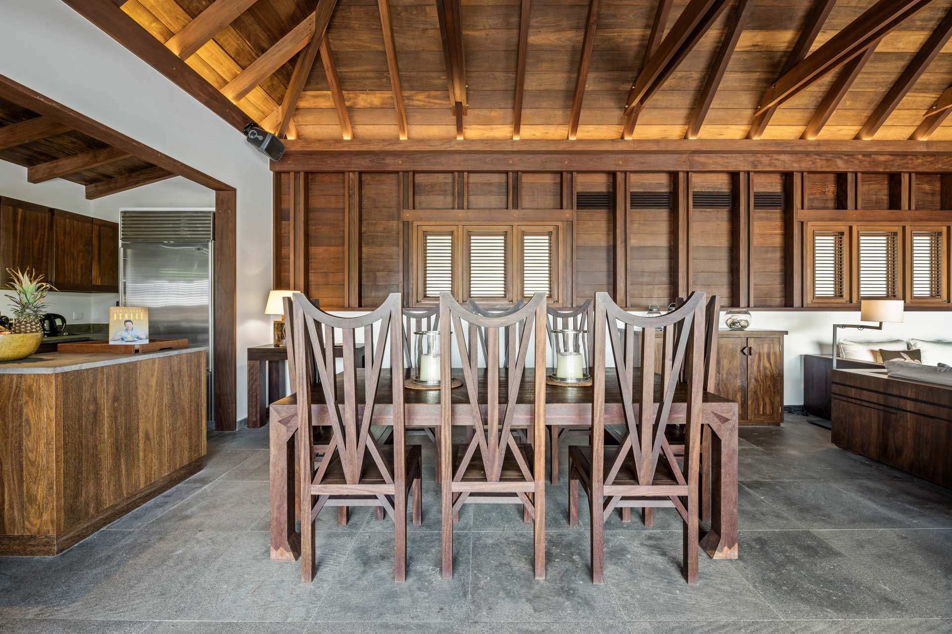 Les espaces de vie, élégamment décorés, comprennent un salon avec écran HD, une salle à manger sous un plafond voûté, et une cuisine moderne en bois et inox.