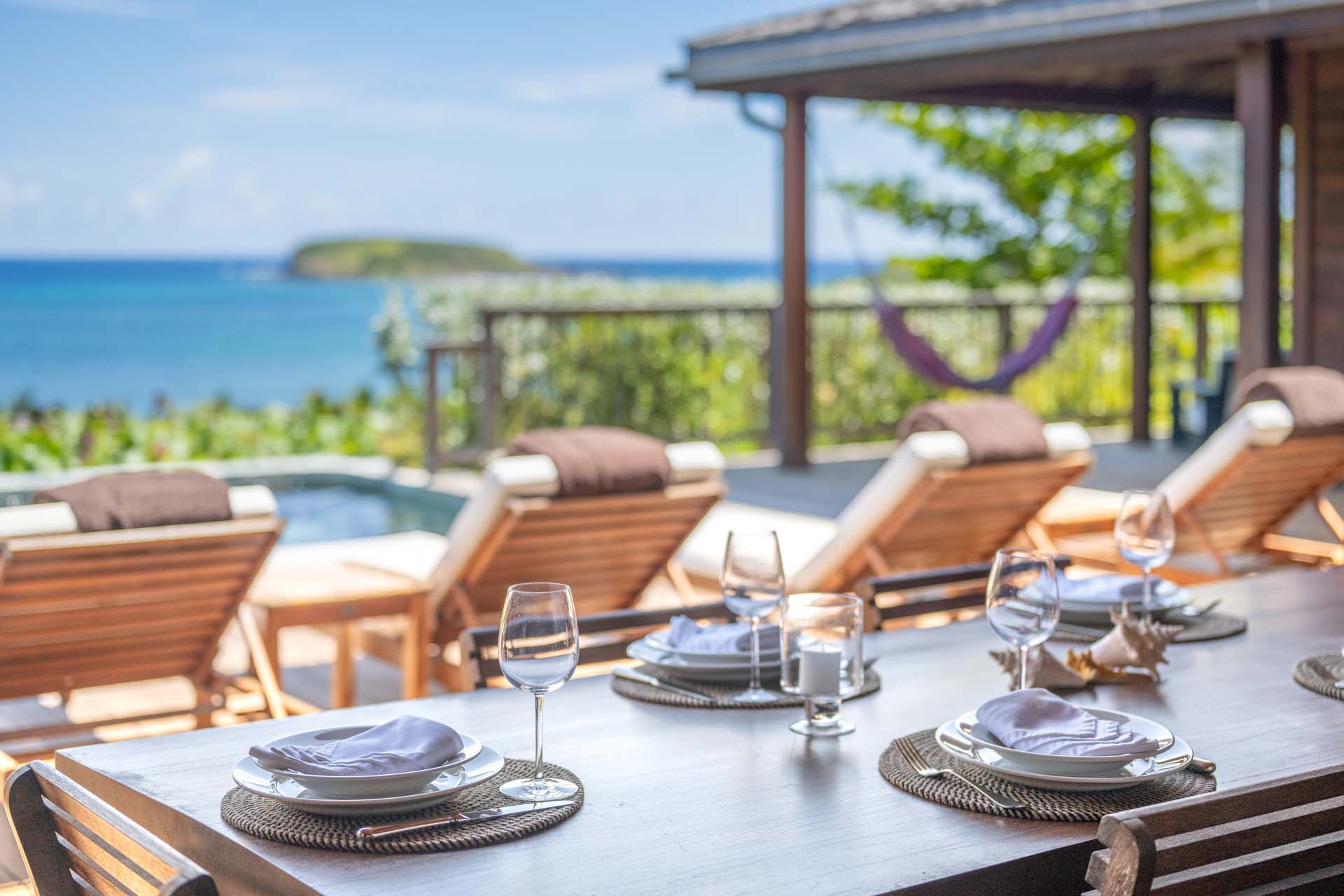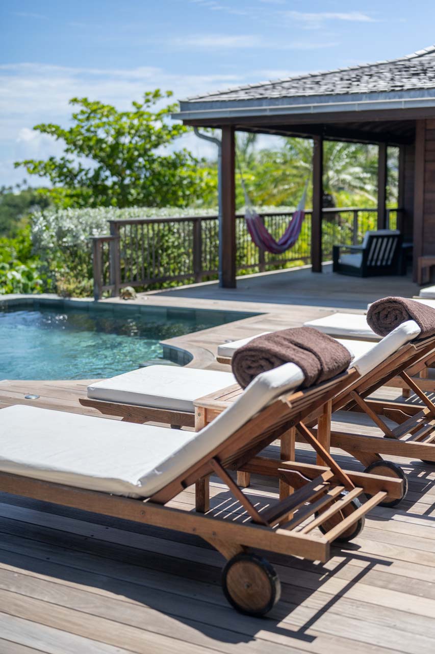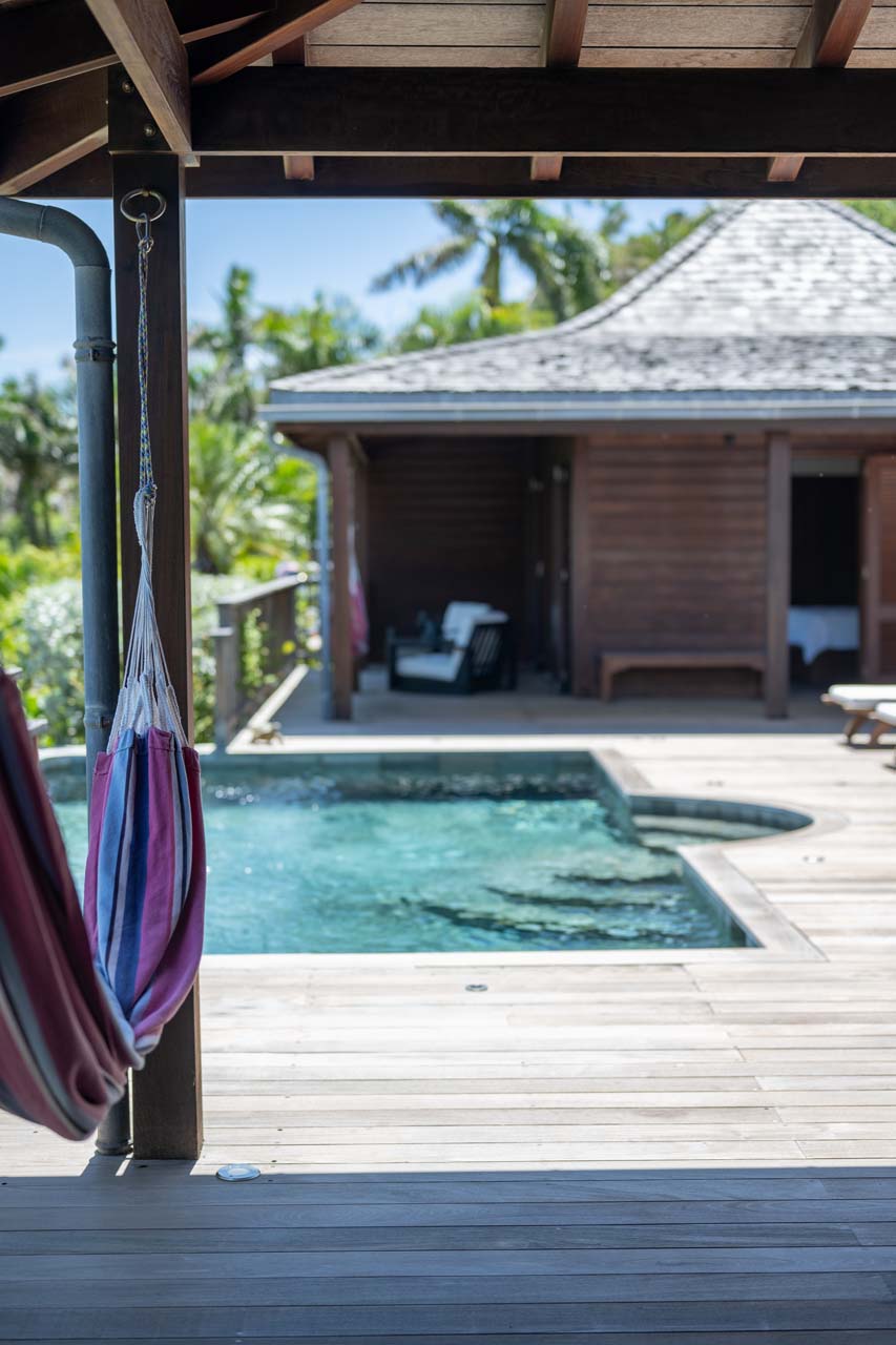 À l’extérieur, une terrasse avec piscine chauffée, transats, hamacs et coin repas ombragé invite à la détente et au bien-être.