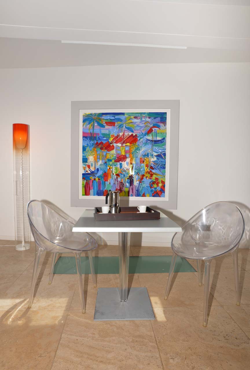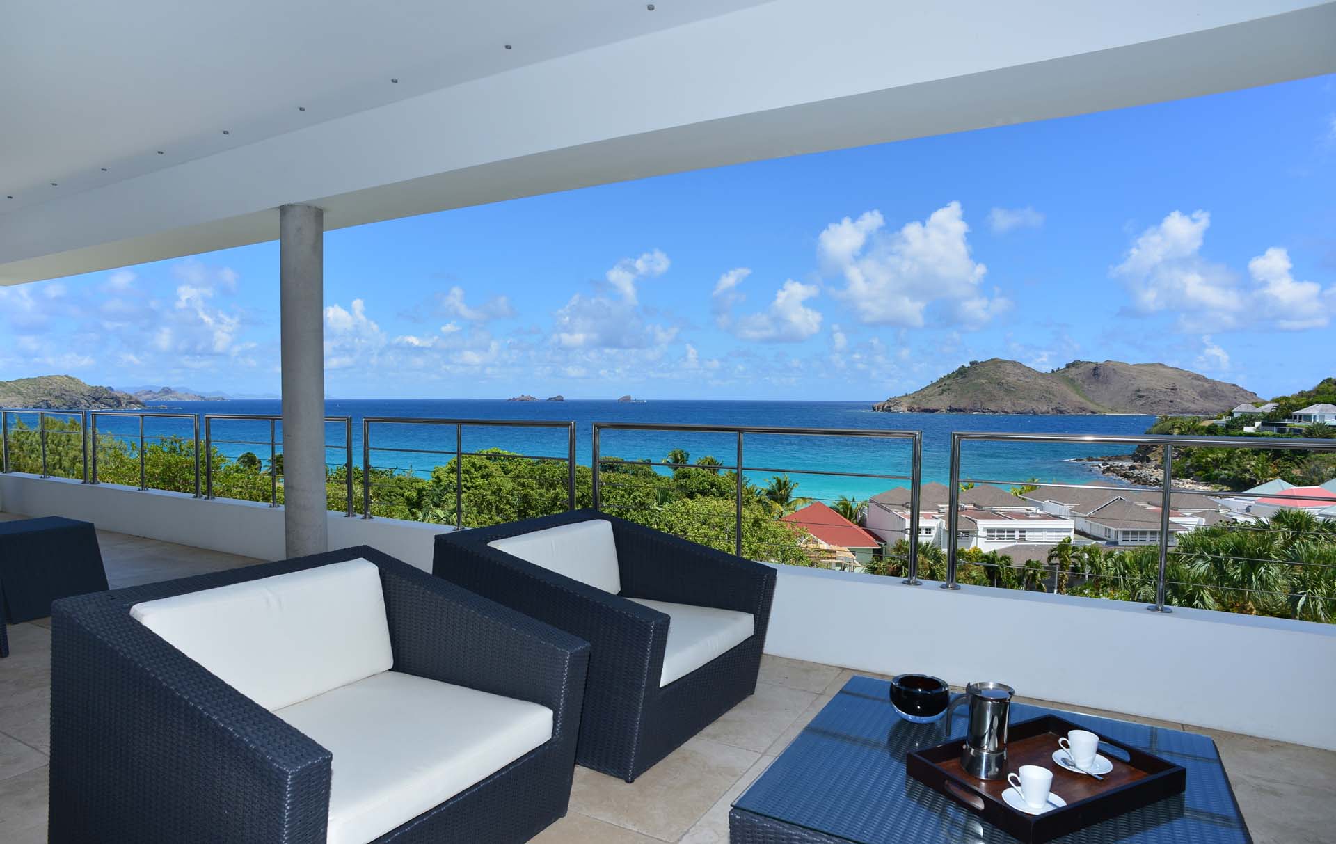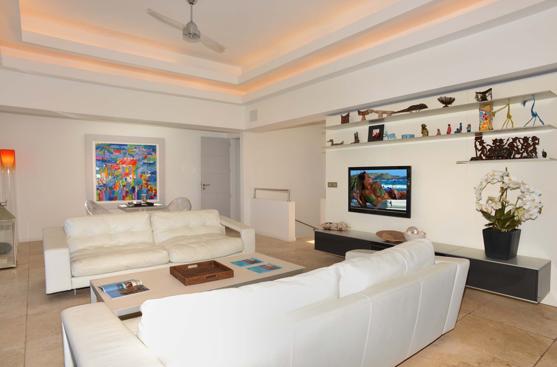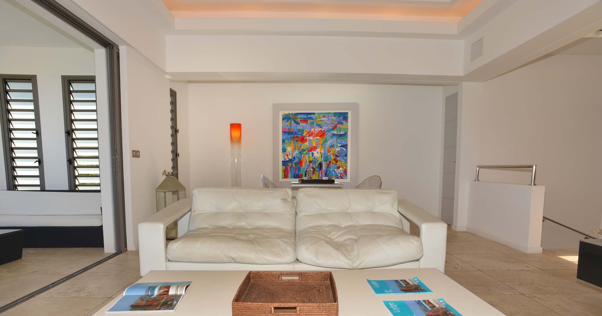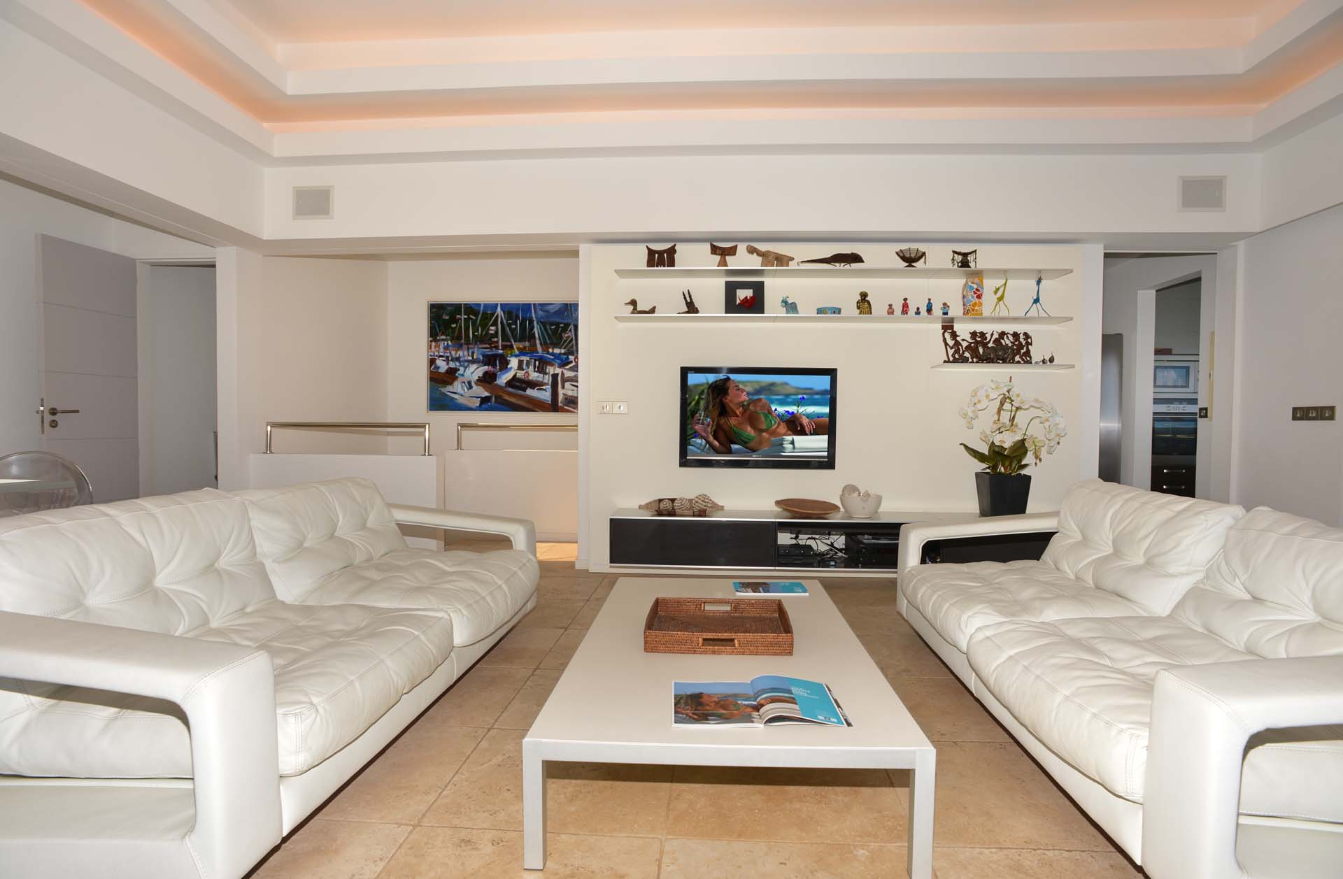 Le salon s’ouvre sur la terrasse, la piscine chauffée et la mer.