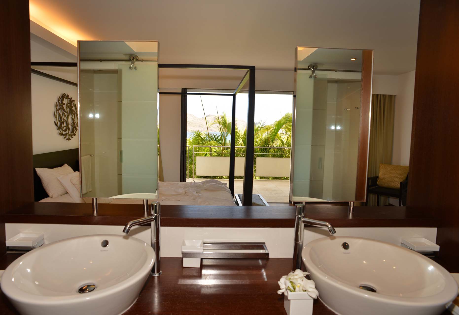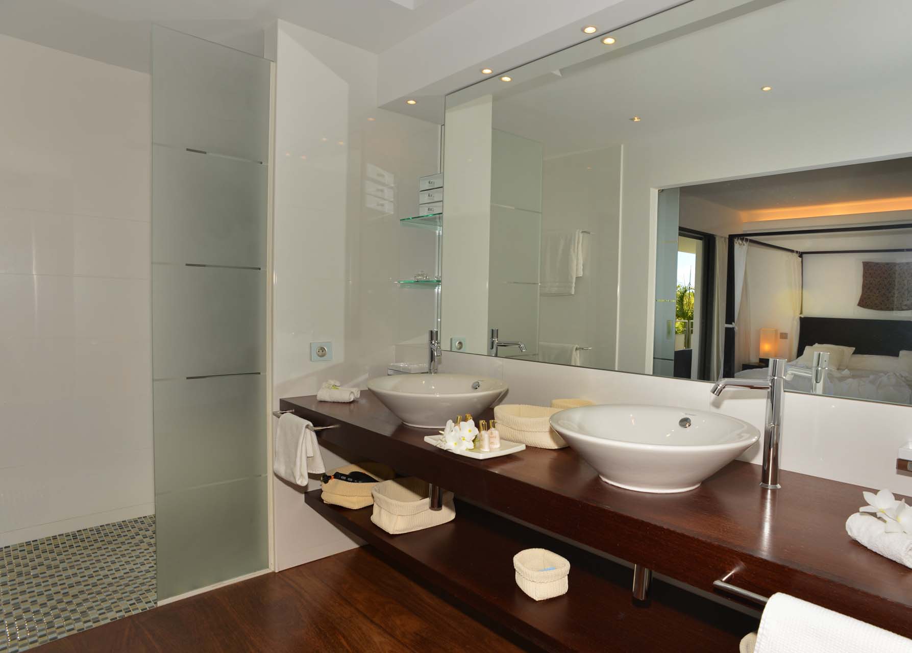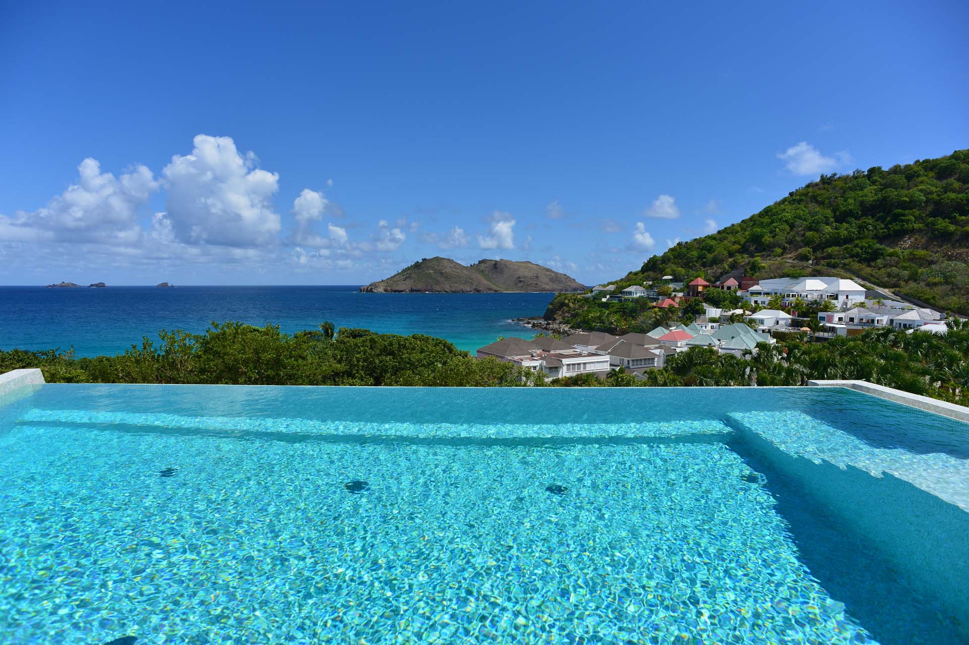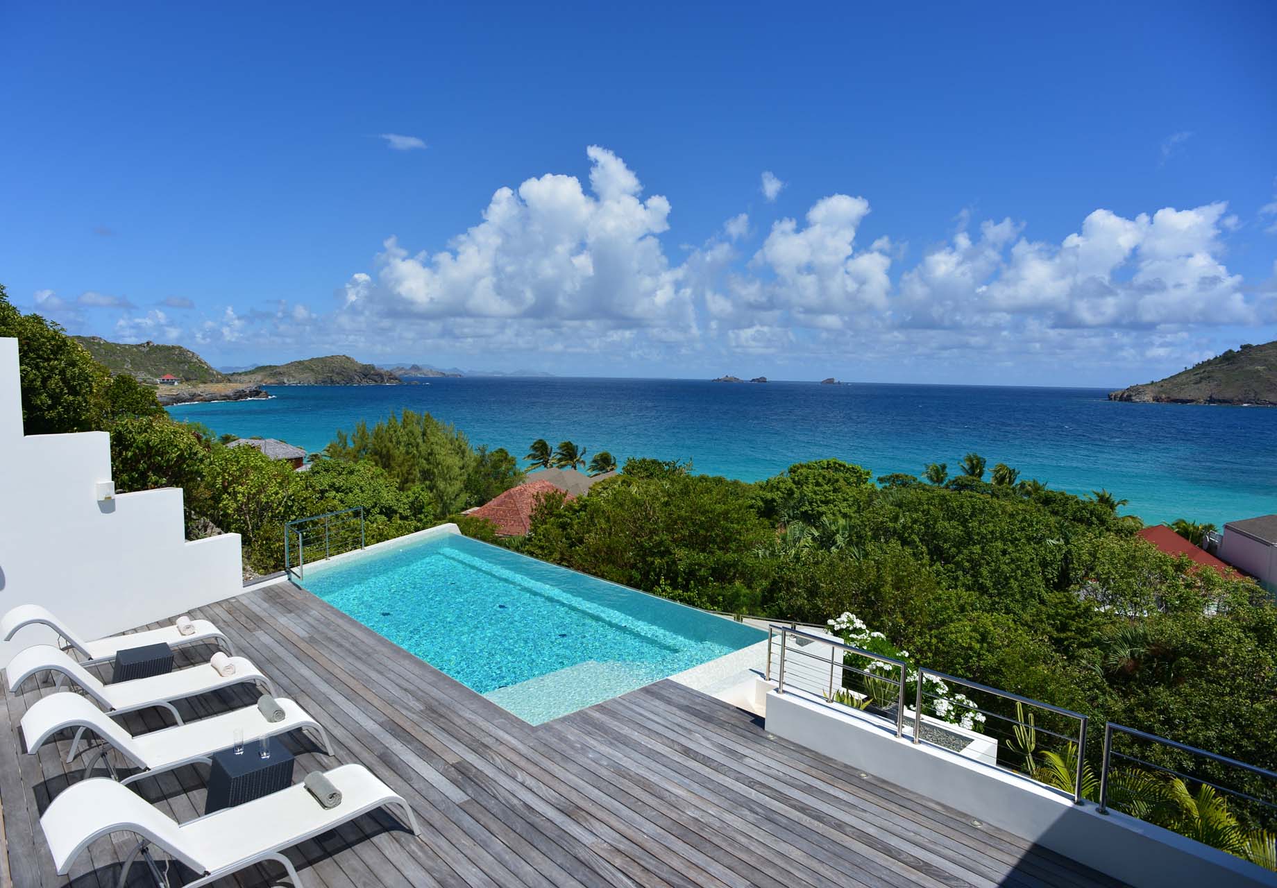 Le salon s’ouvre sur la terrasse, la piscine chauffée et la mer.