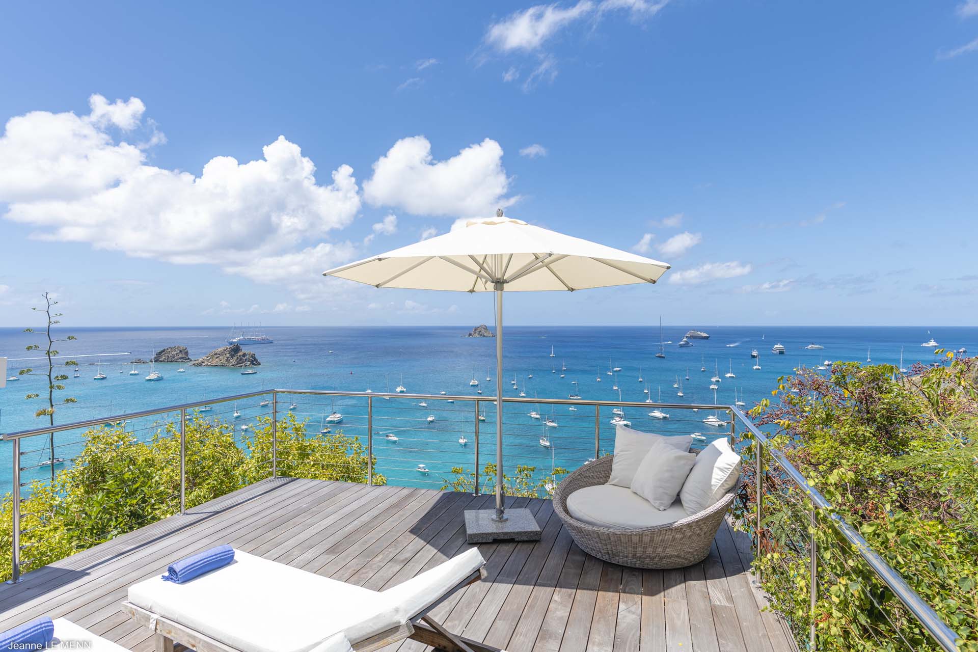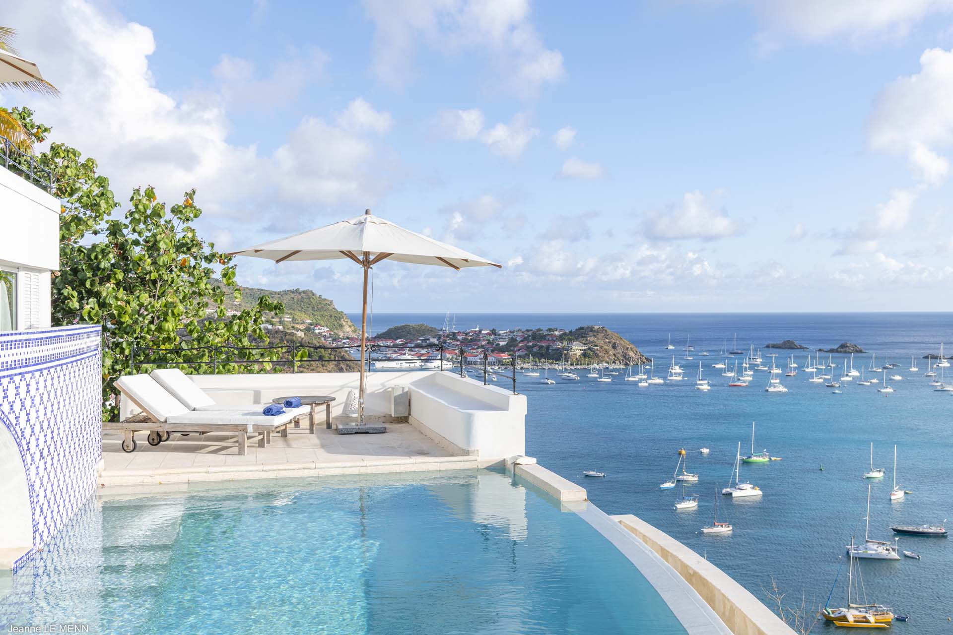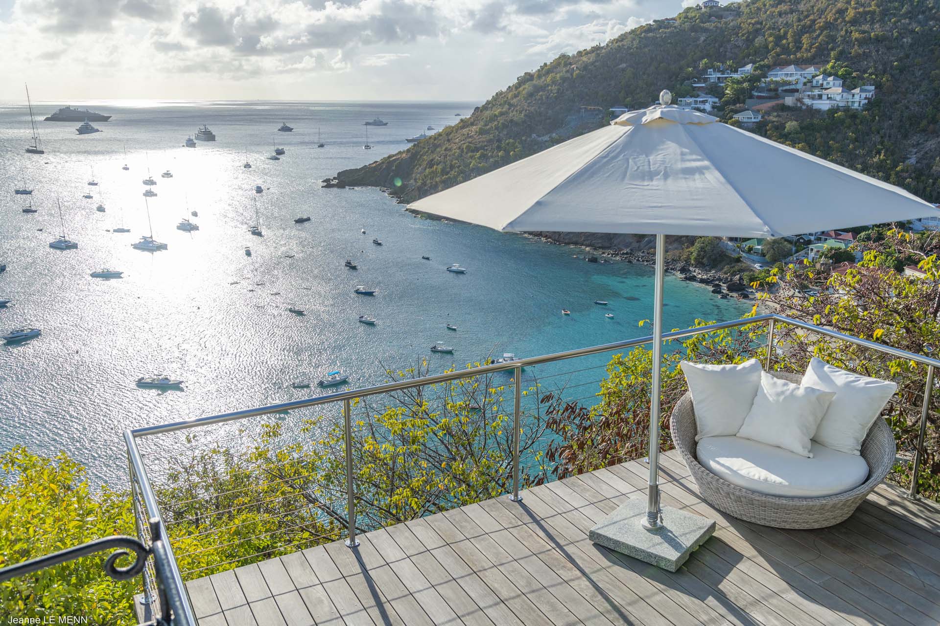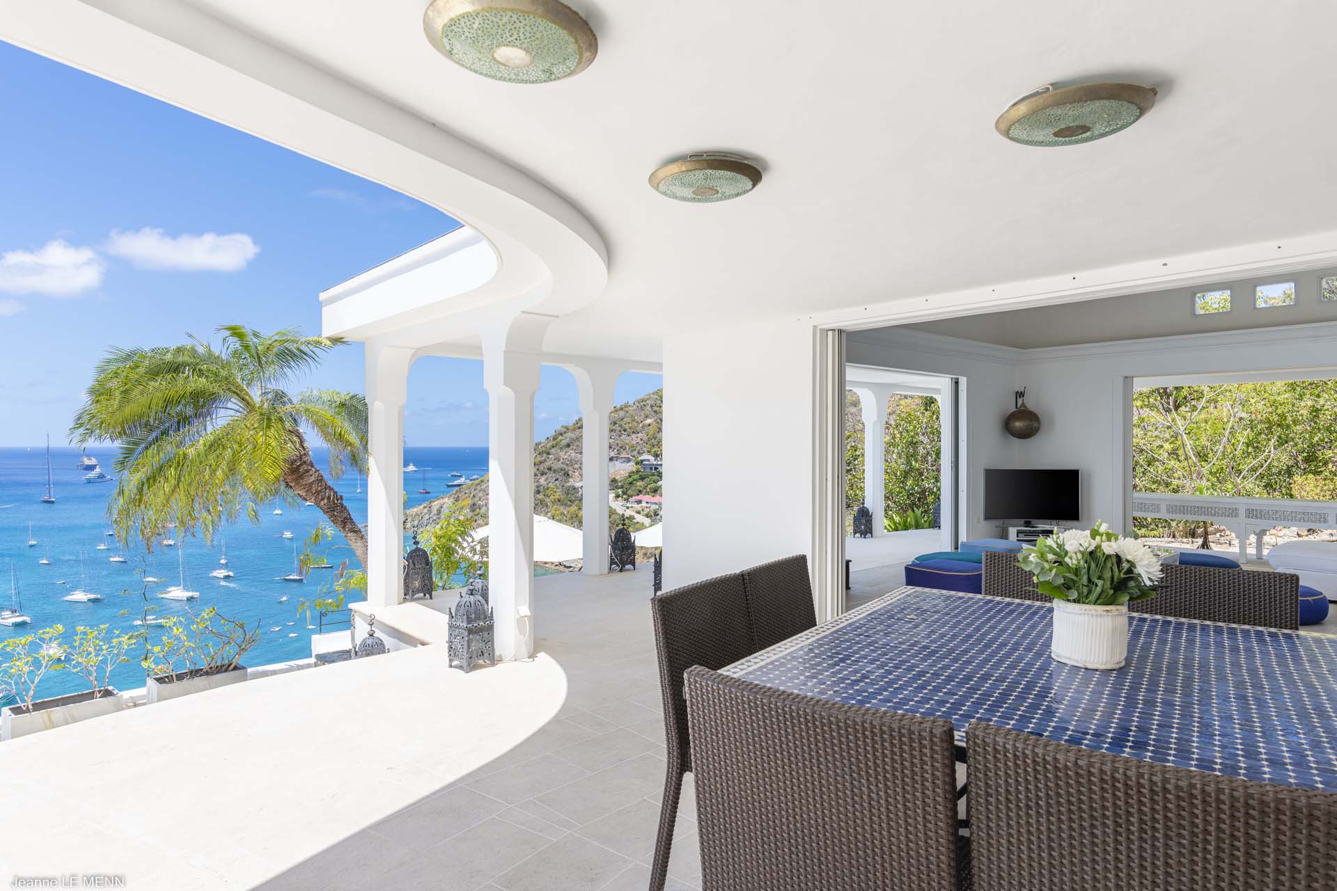 La vue sur la mer, l’entrée du port de Gustavia, et les bateaux aux mouillages dans la rade de Gustavia font parties du décor de cette spacieuse villa.