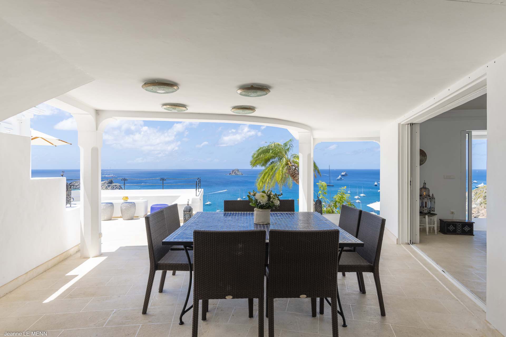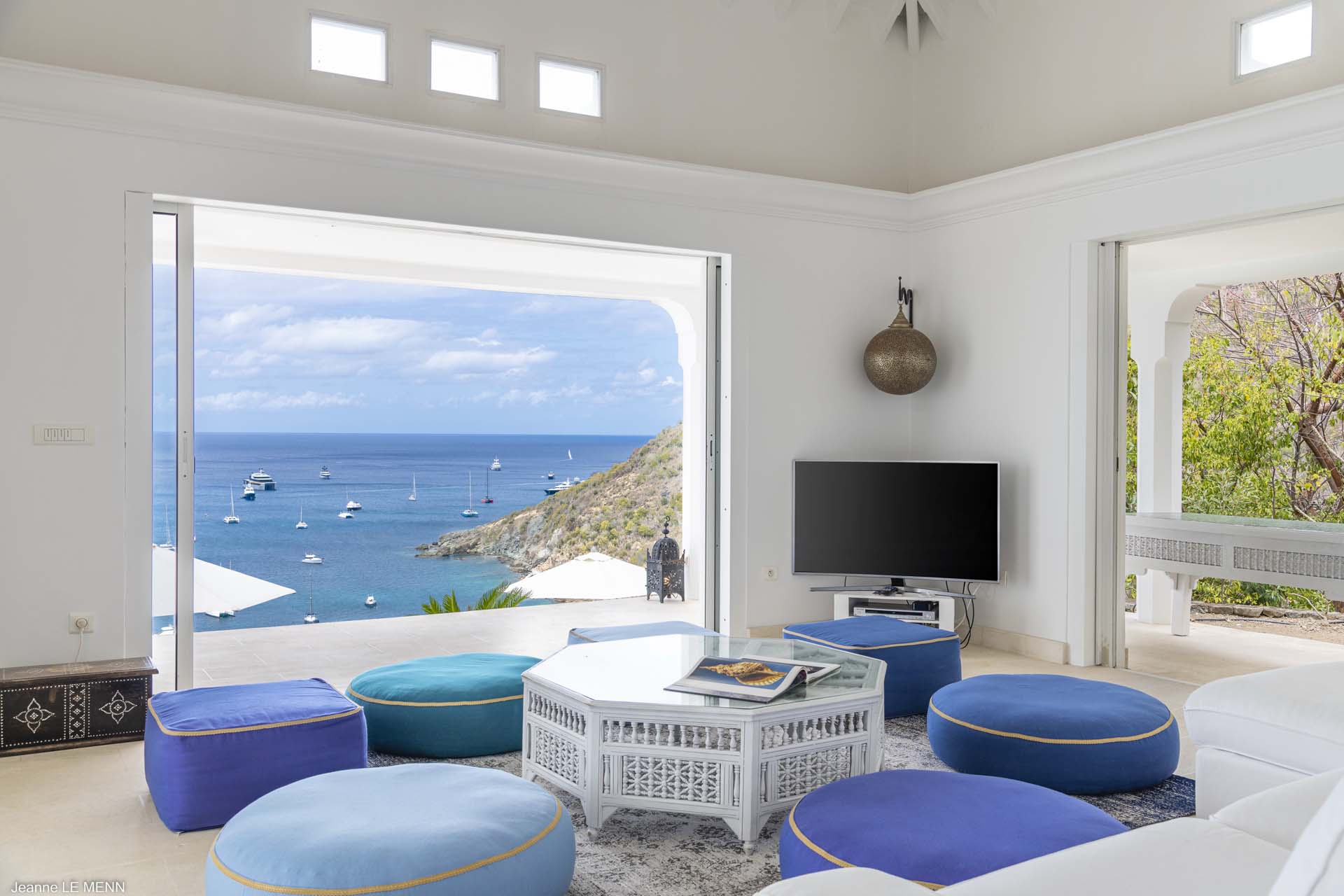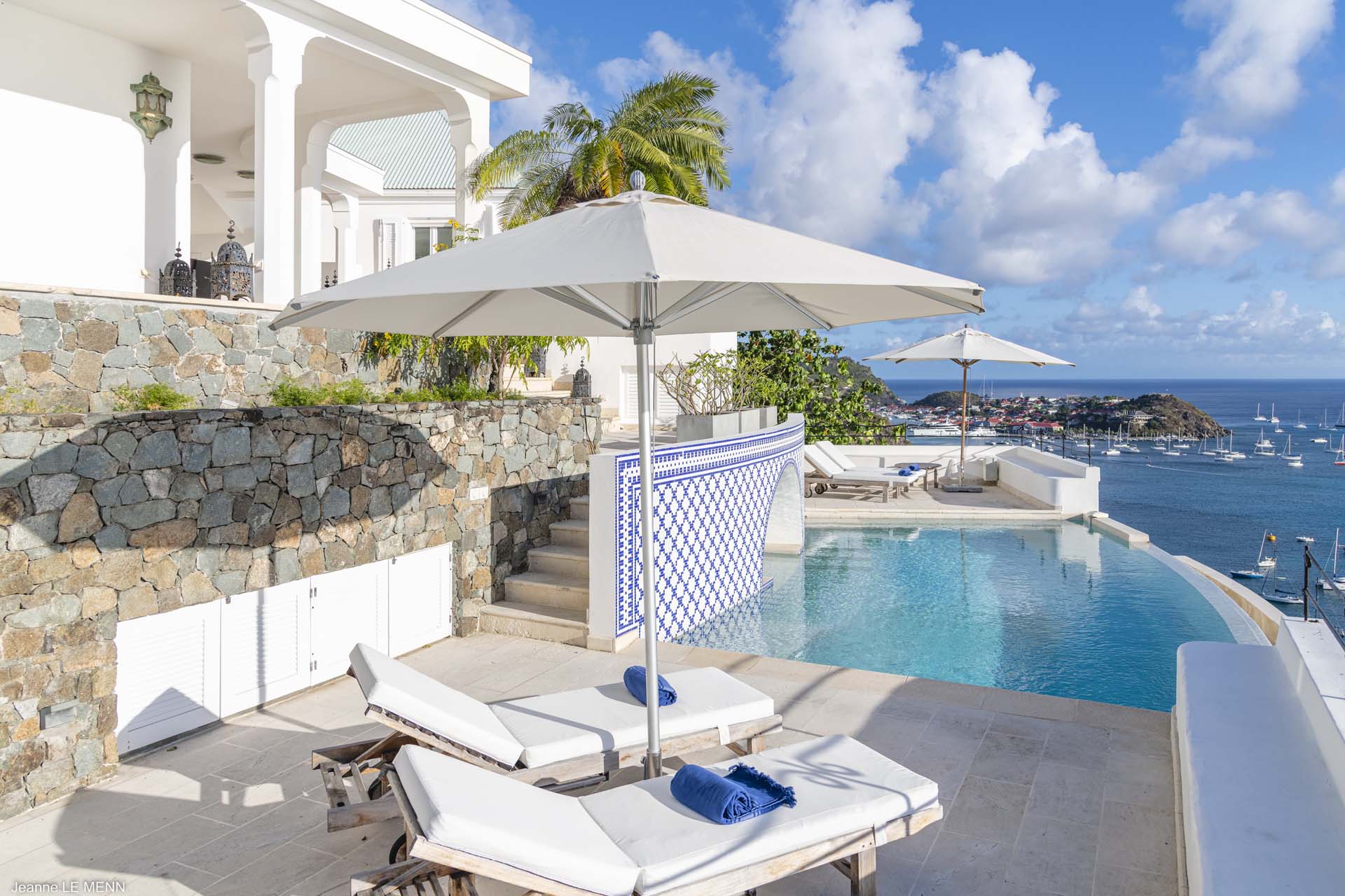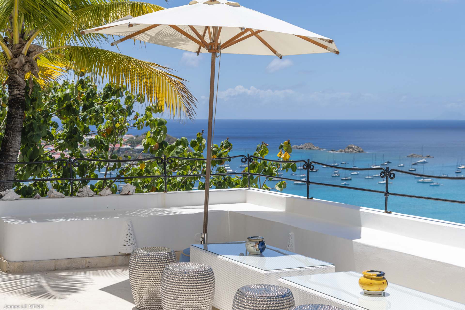 La vue sur la mer, l’entrée du port de Gustavia, et les bateaux aux mouillages dans la rade de Gustavia font parties du décor de cette spacieuse villa.