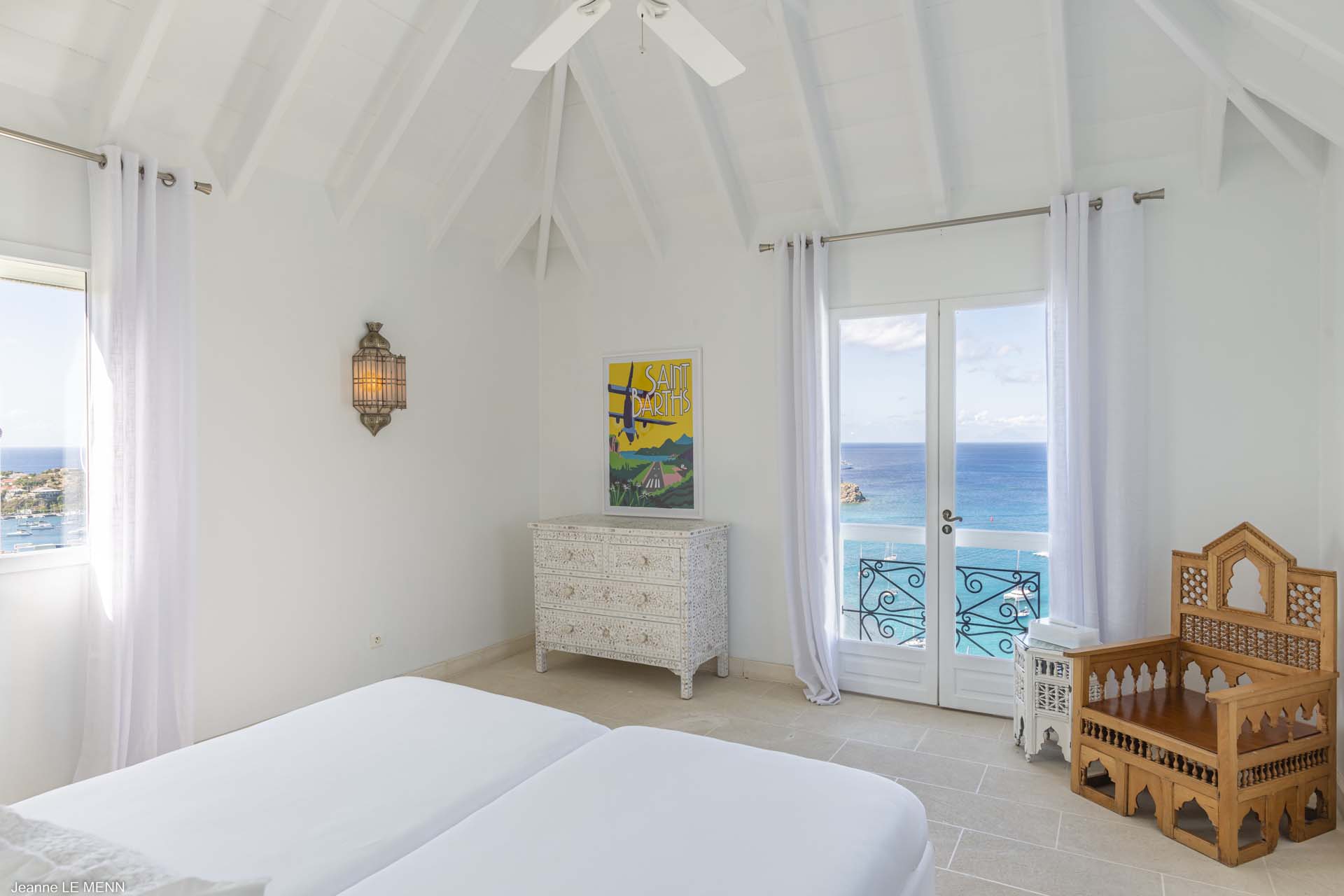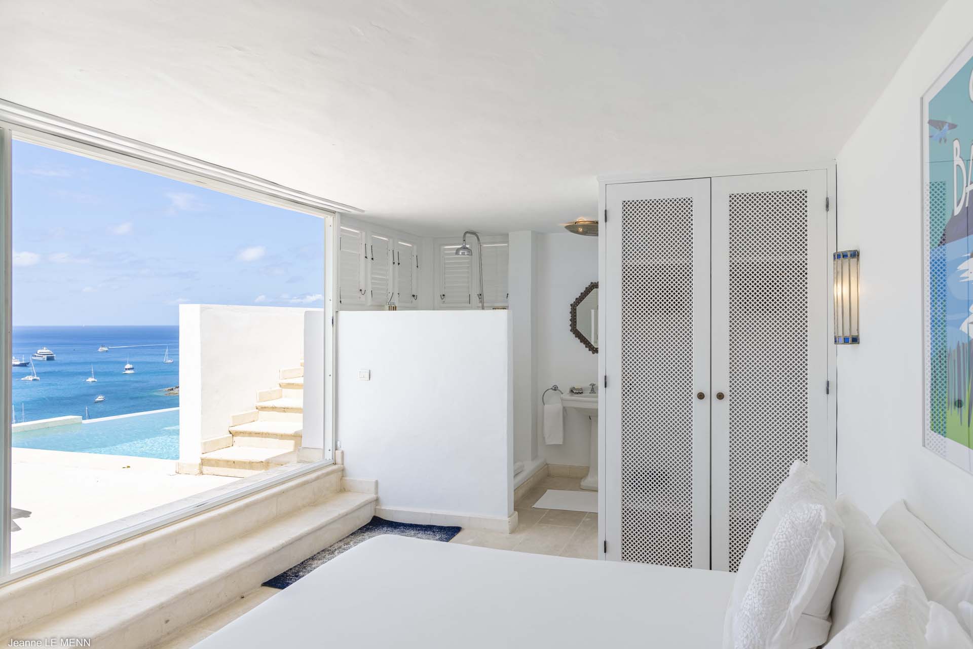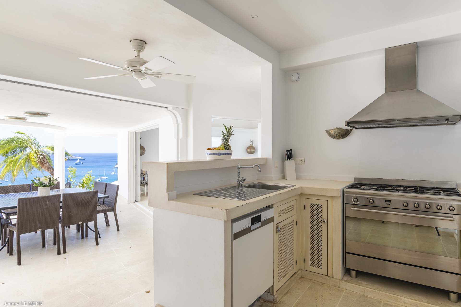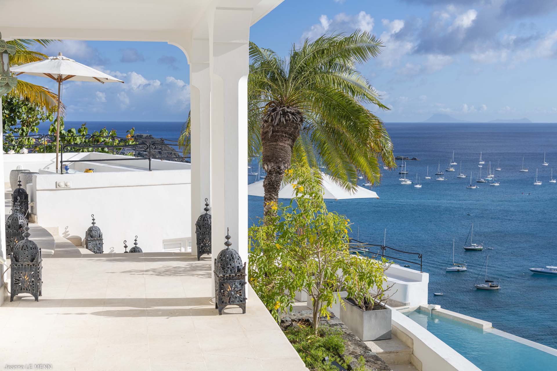 La vue sur la mer, l’entrée du port de Gustavia, et les bateaux aux mouillages dans la rade de Gustavia font parties du décor de cette spacieuse villa.