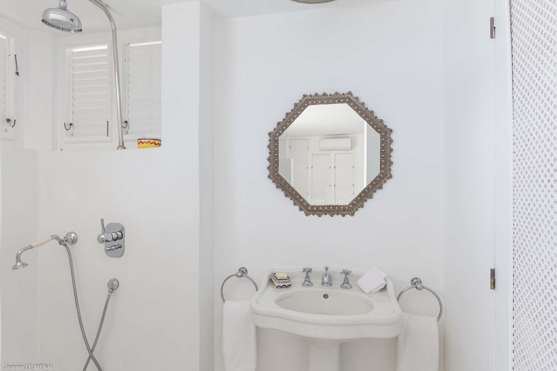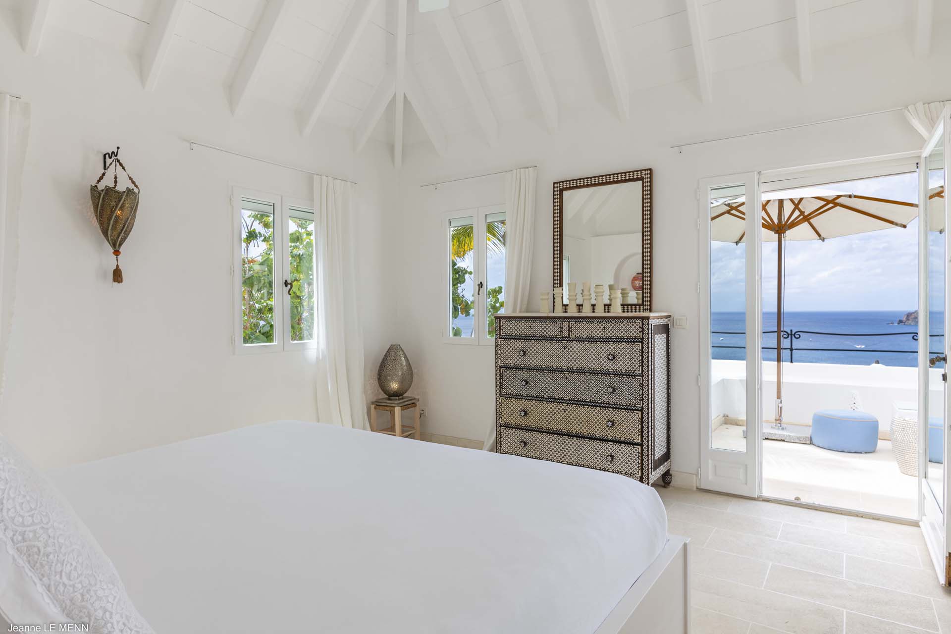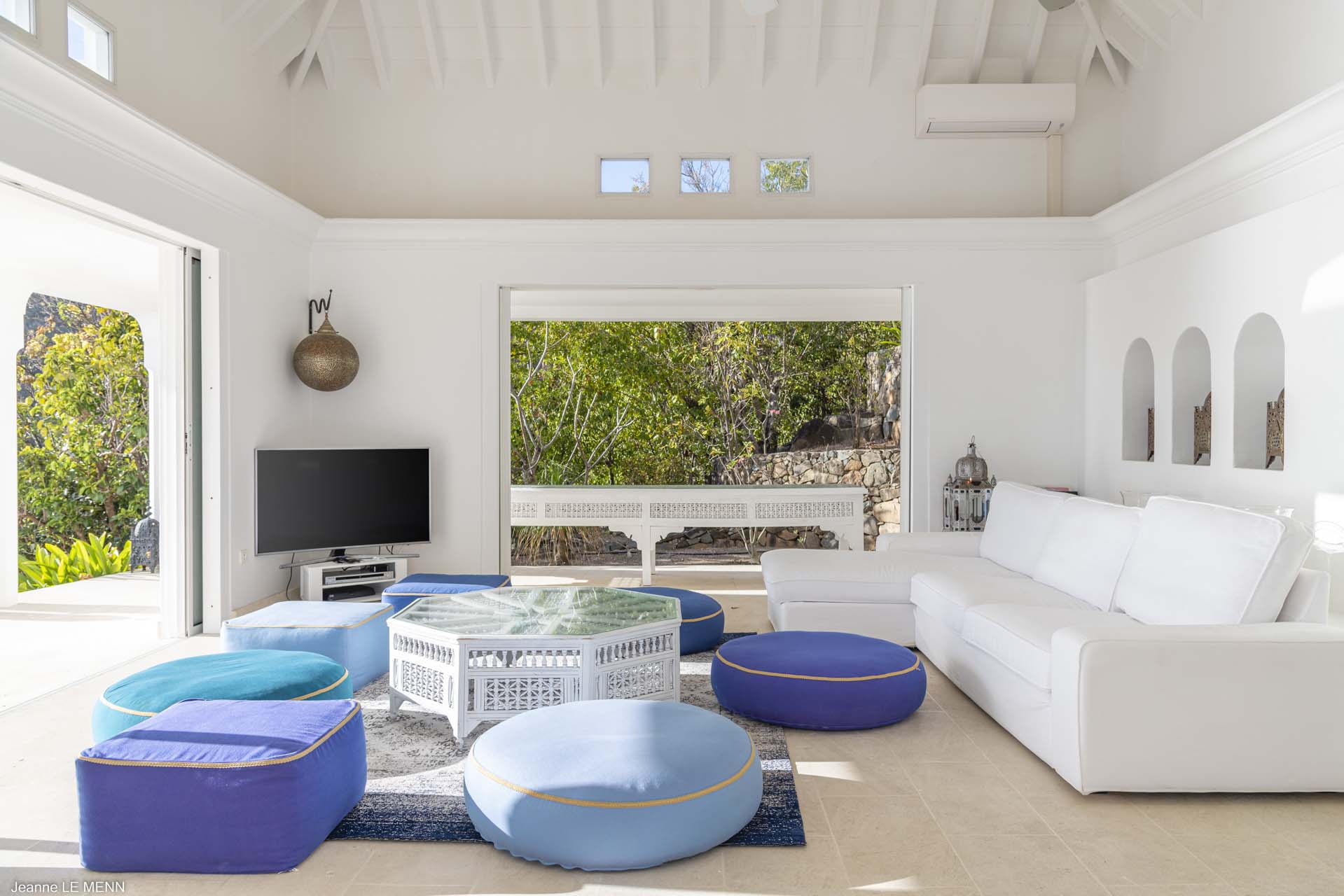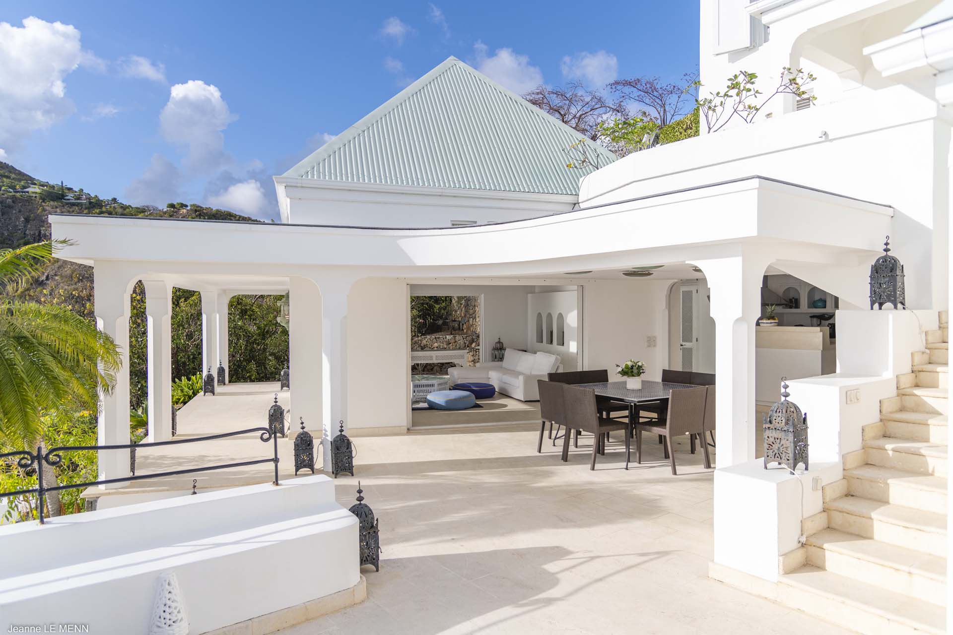 La vue sur la mer, l’entrée du port de Gustavia, et les bateaux aux mouillages dans la rade de Gustavia font parties du décor de cette spacieuse villa.