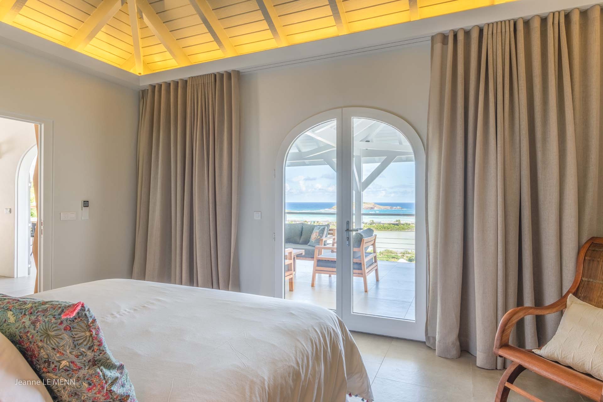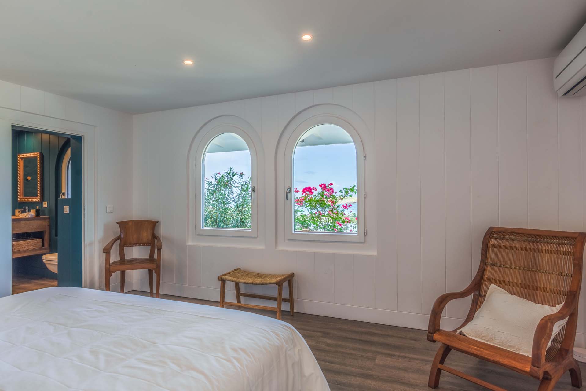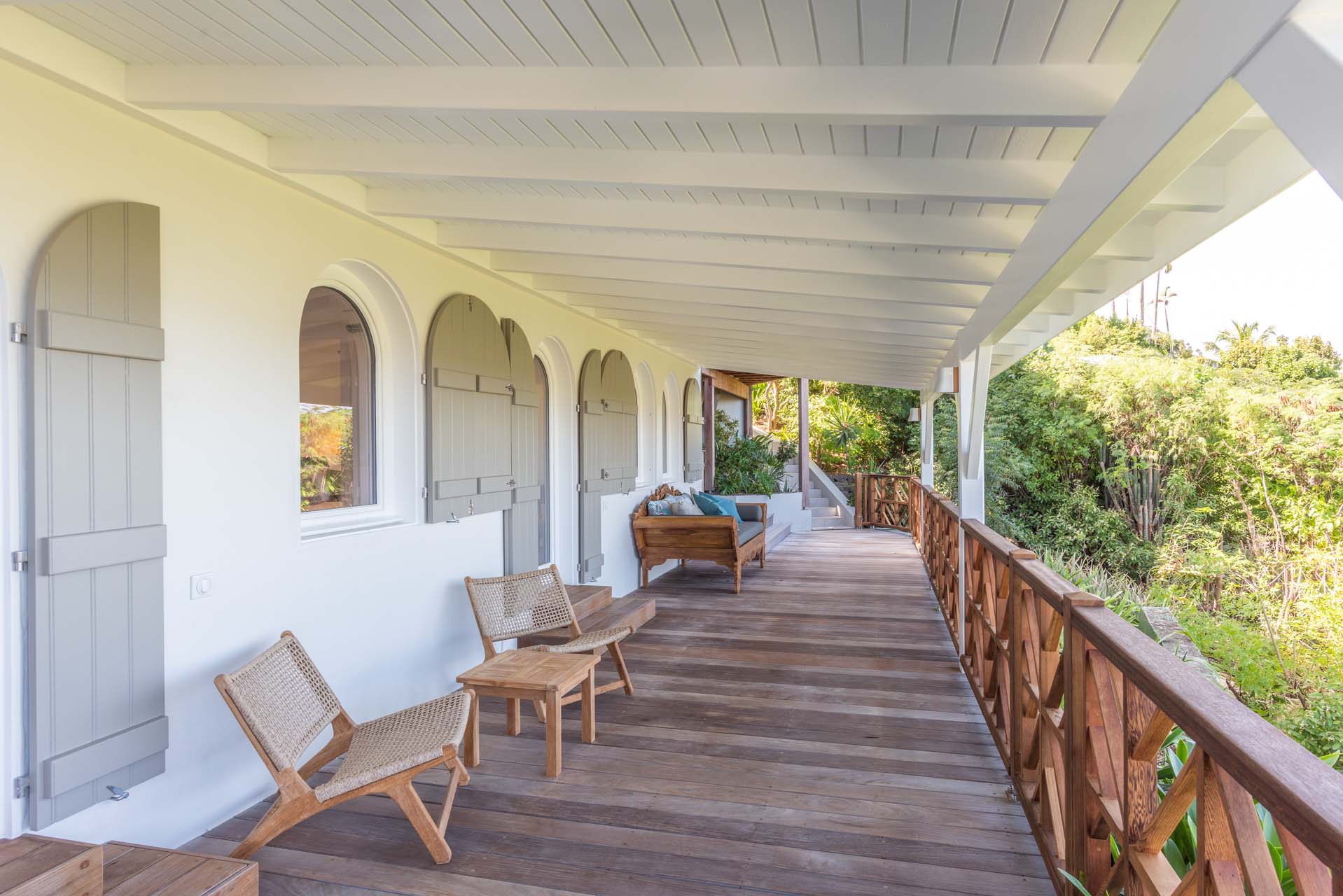 Son salon et sa chambre principale s’ouvrent sur une grande terrasse ombragée entourant la villa.