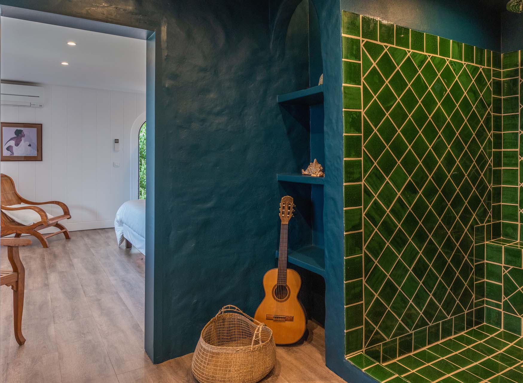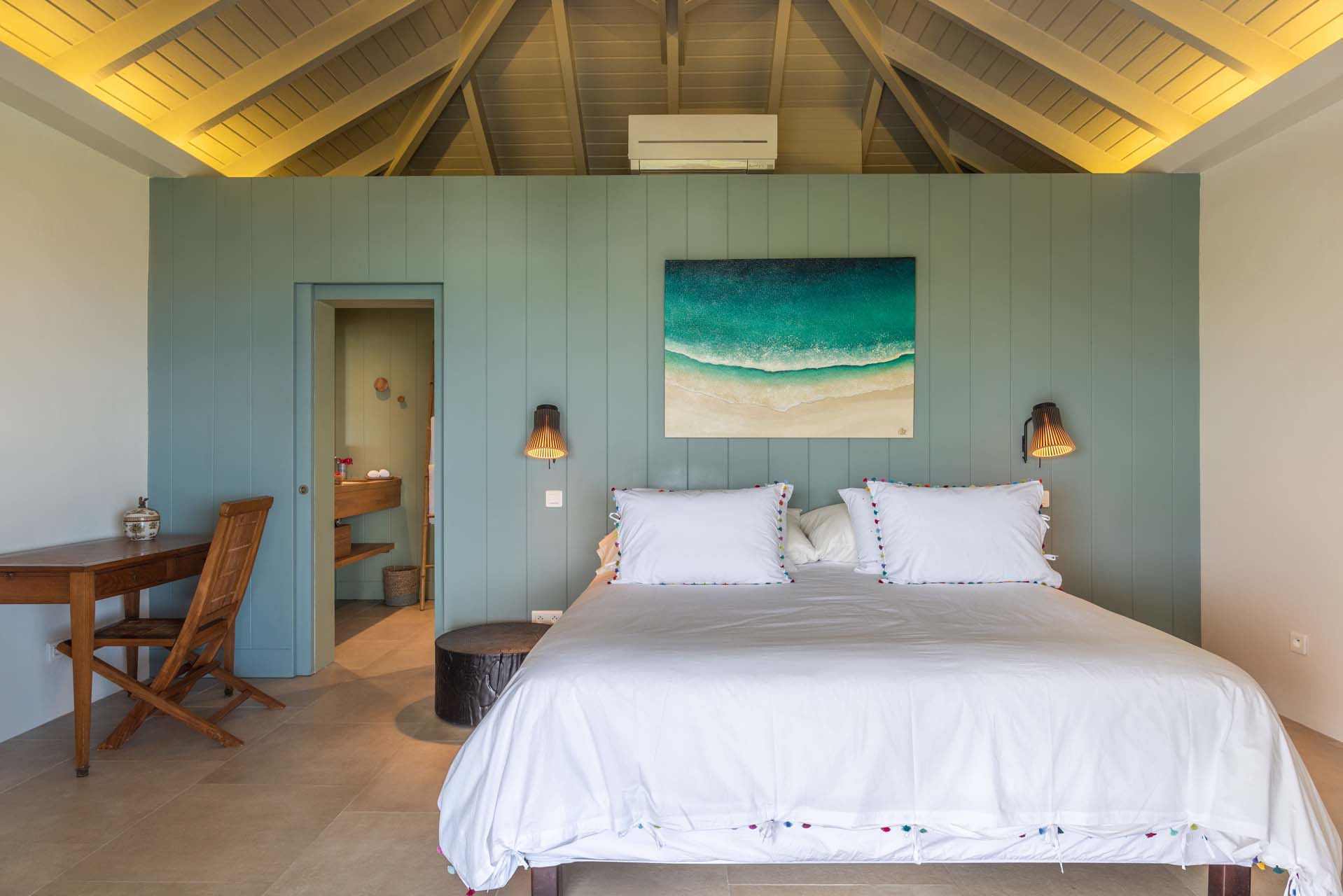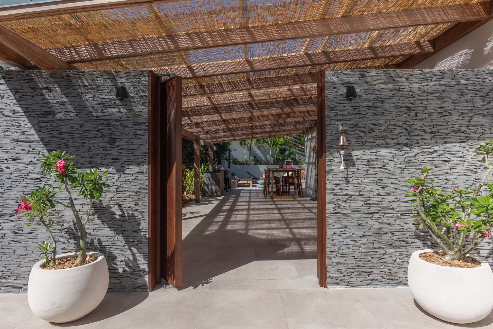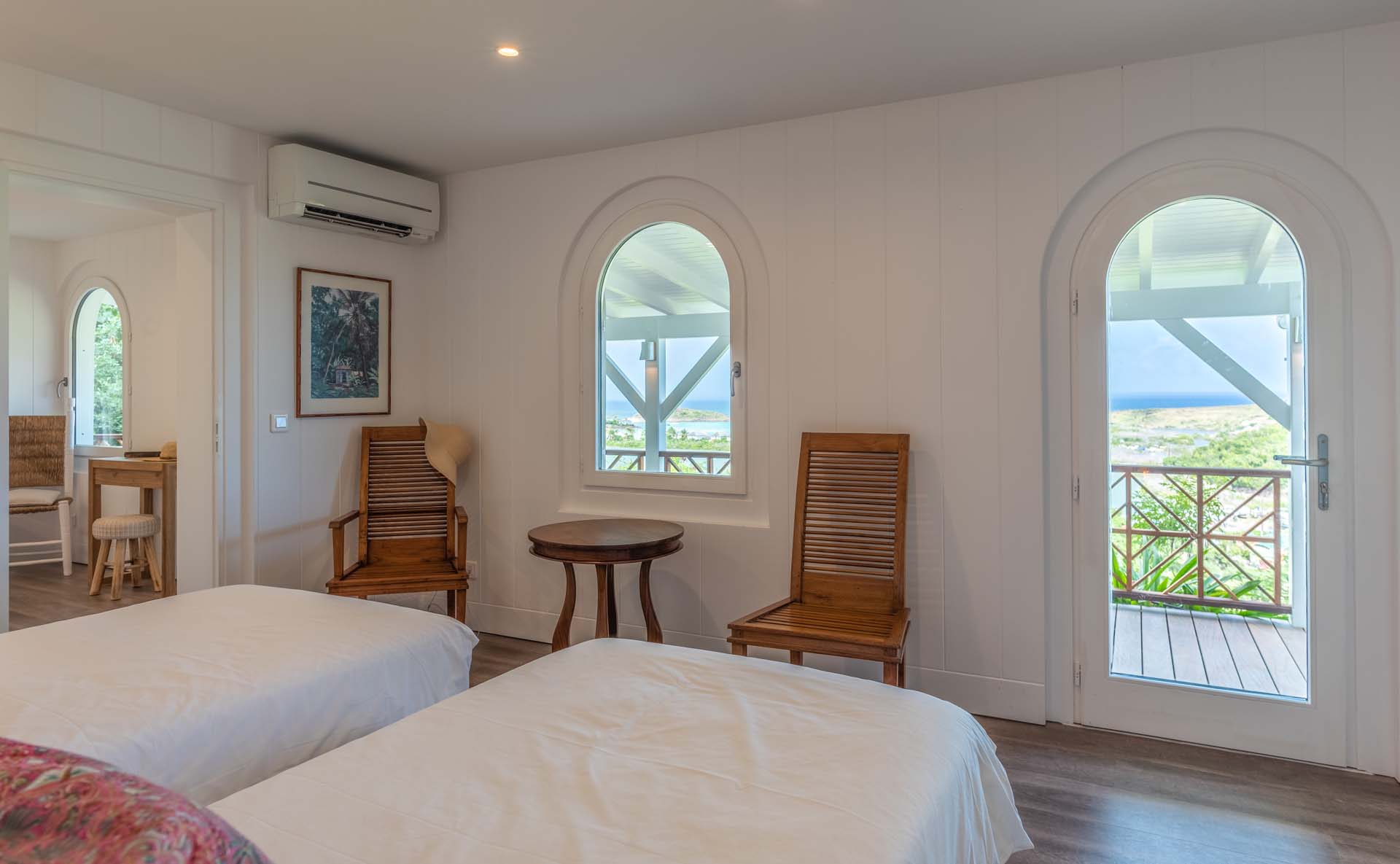 Son salon et sa chambre principale s’ouvrent sur une grande terrasse ombragée entourant la villa.