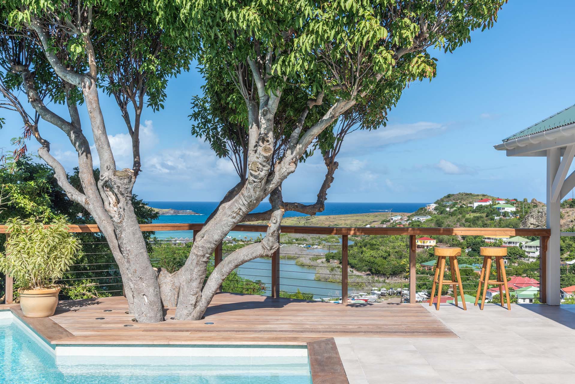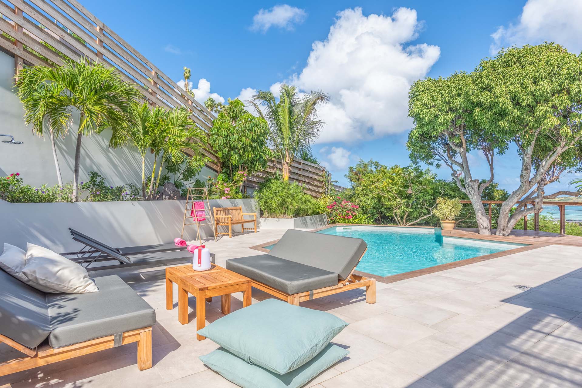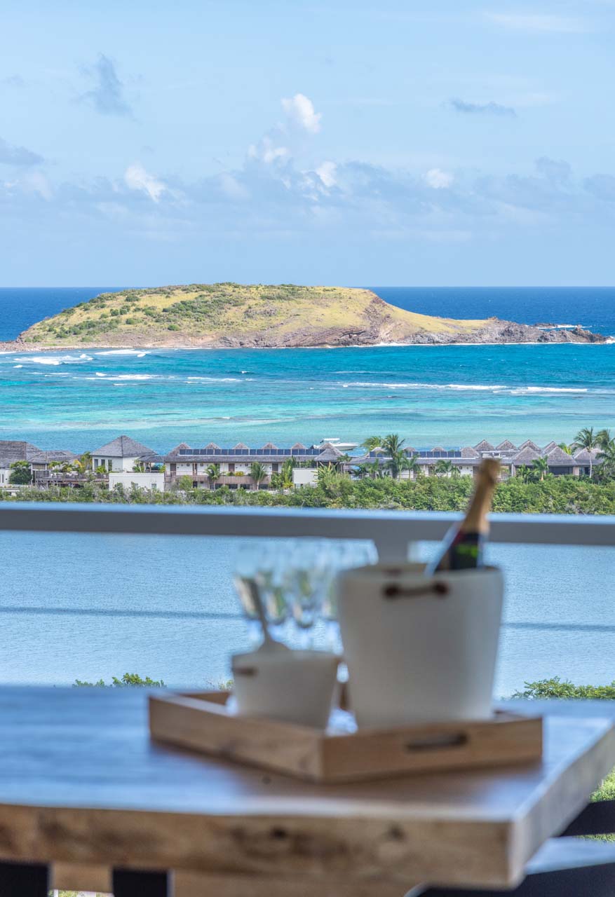 L’espace autour de la piscine surplombe la baie de Grand Cul de Sac.